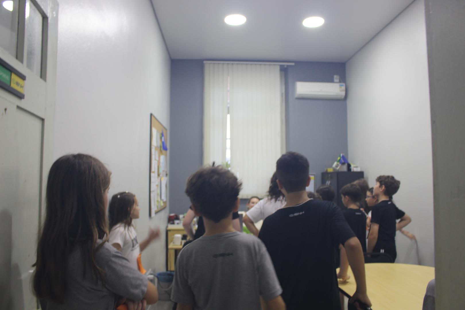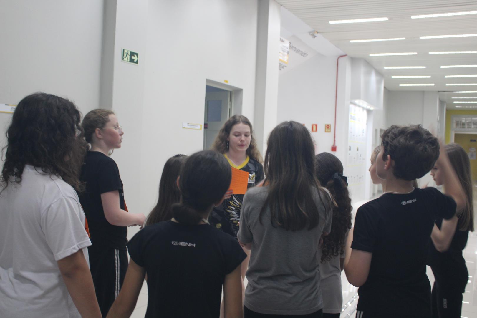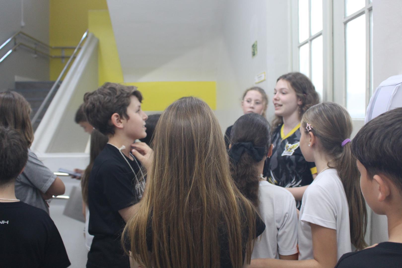 Os estudantes tiveram um momento de intervalo e, em seguida, participaram de uma caça ao tesouro, com o objetivo de conhecer melhor os ambientes da escola. Eles foram separados em grupos, e cada um foi guiado por um aluno do Ensino Médio e por uma professora ou auxiliar.