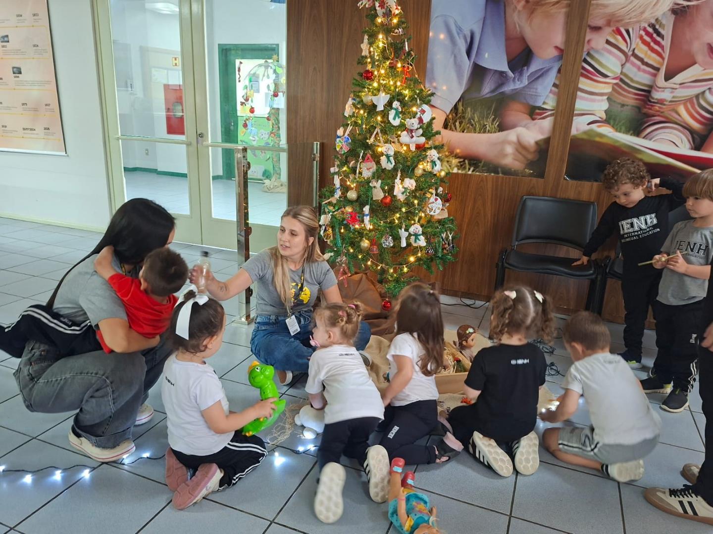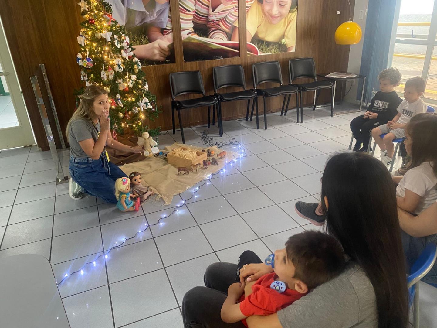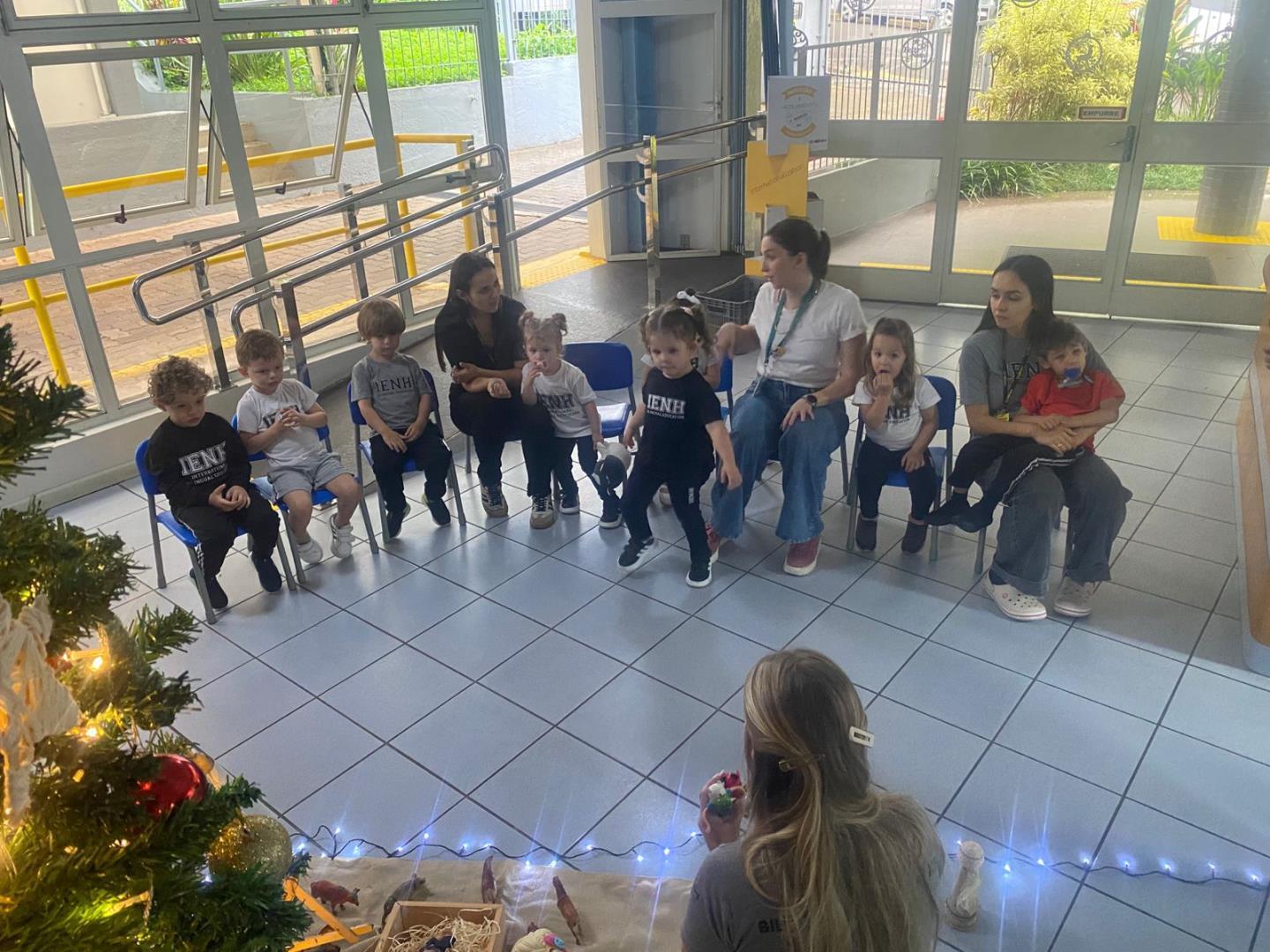 Organizada pelas professoras Amanda Siebel e Caroline Bender e pela teacher Amanda Escobar a proposta integrou a programação especial de final de ano. Reunidas em frente ao pinheiro de Natal da escola, as crianças acompanharam a narrativa enquanto diferentes objetos concretos eram utilizados para representar os personagens e elementos da história bíblica, favorecendo a compreensão e tornando o momento ainda mais significativo.
