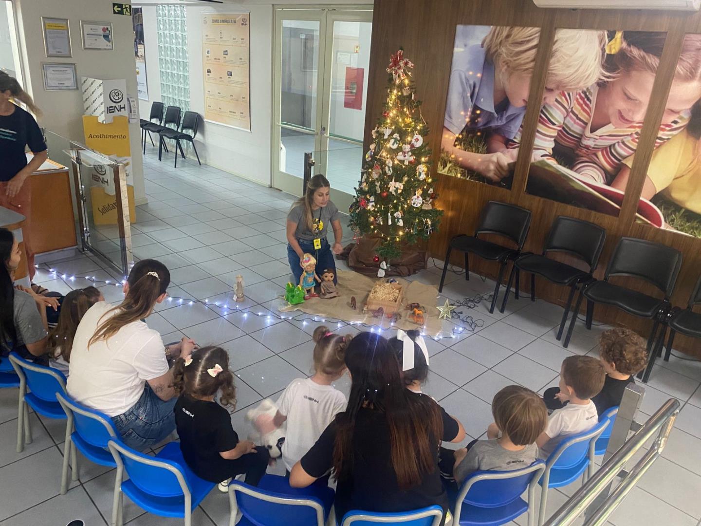 As crianças dos Kindergarten 2 da Educação Infantil do Currículo Internacional Bilíngue da IENH – Unida Pindorama vivenciaram um momento de encantamento e escuta atenta durante a Hora do Conto intitulada “A magia do Natal: descobrindo a verdadeira história”. A atividade teve como objetivo apresentar a verdadeira história do Natal de maneira apropriada para a faixa etária, estimulando a imaginação, a curiosidade e o envolvimento dos pequenos em um clima de celebração e acolhimento.