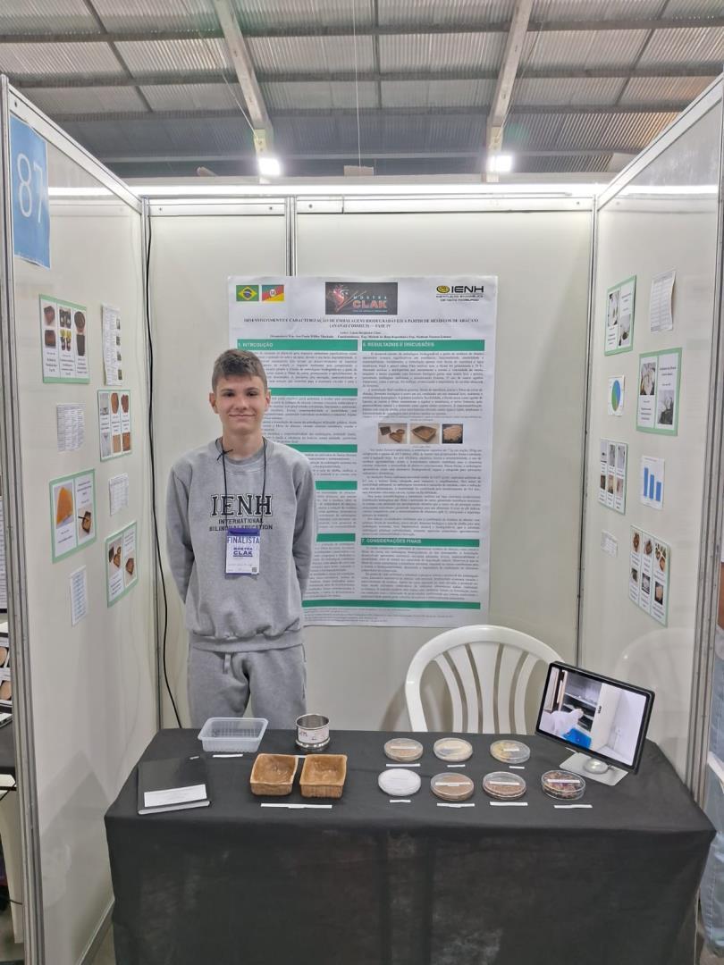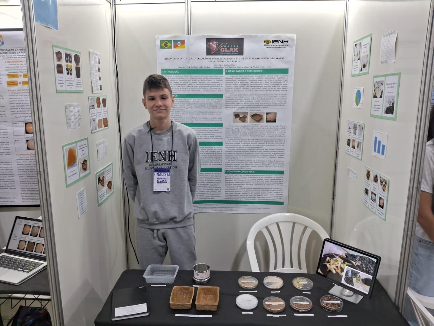 O estudante Lucas Berghahn Closs, da turma 1A do Ensino Médio da IENH – Unidade Fundação Evangélica, conquistou o primeiro lugar na área de Ciências Biológicas durante a Mostraclak. O projeto premiado, intitulado “Desenvolvimento e Caracterização de Embalagens Biodegradáveis a partir de Resíduos de Abacaxi (Ananas comosus) — Fase IV”, foi desenvolvido com orientação da professora Ana Paula Müller Machado e coorientação da professora Michele Kopschina.