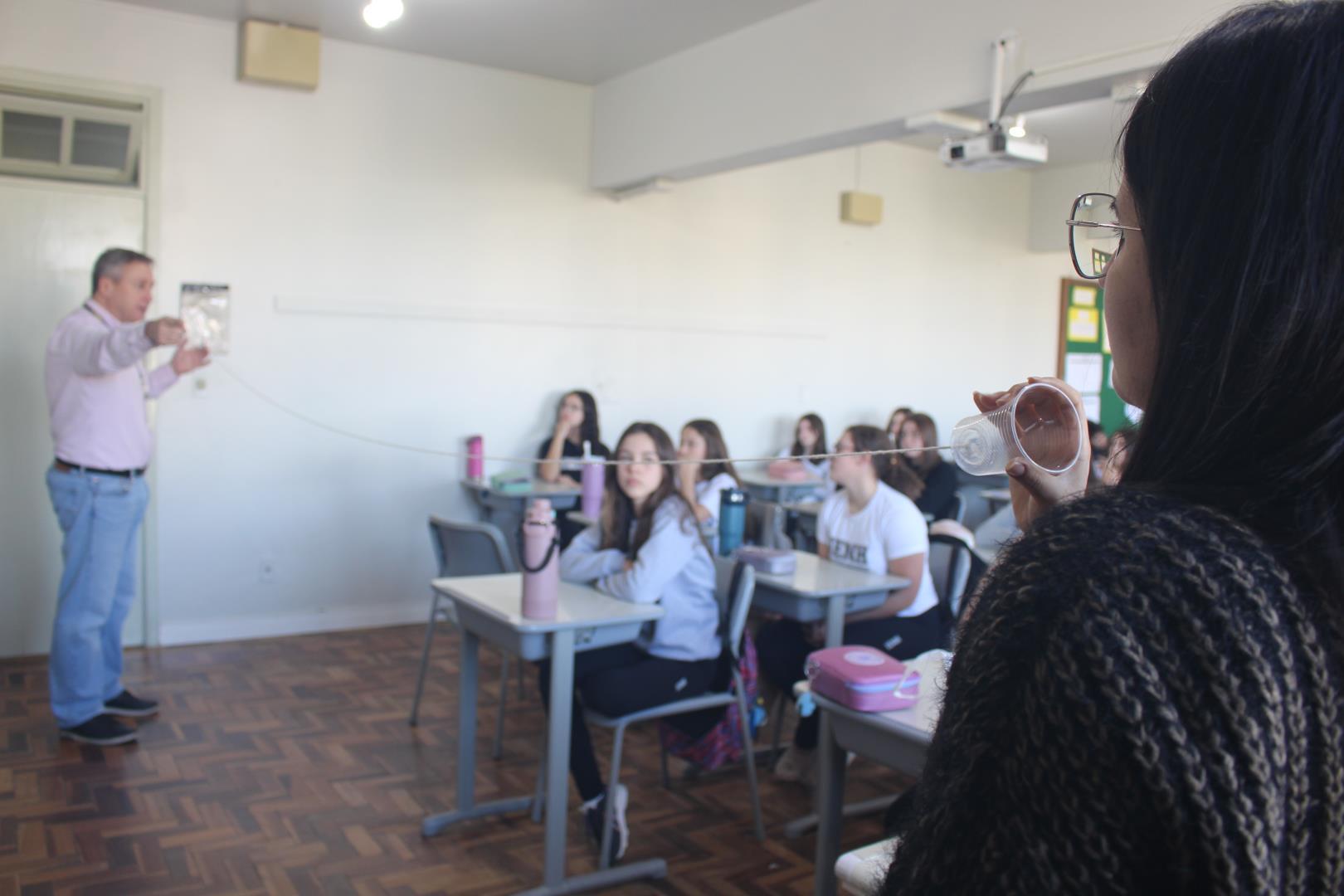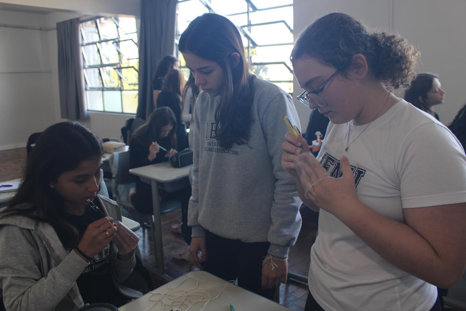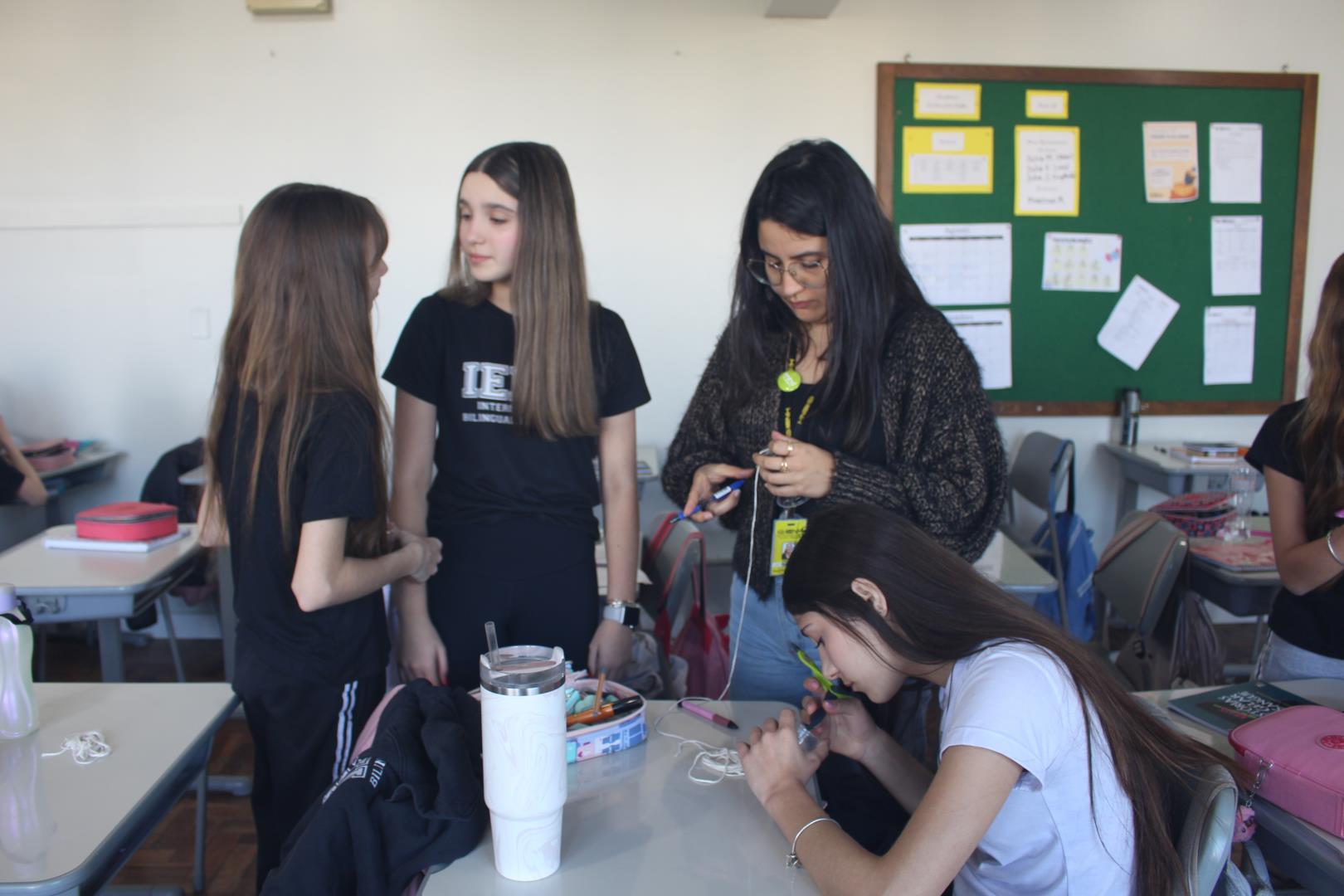 Na sequência, os alunos vivenciaram uma atividade prática utilizando copinhos e barbantes. Cada copinho representava um dispositivo, como celulares e computadores e os barbantes simbolizavam os cabos de conexão. Dessa forma, foi possível simular uma rede ponto a ponto e, ao cruzar os barbantes, perceber como a comunicação acontece, já que o som se propaga pelo fio.