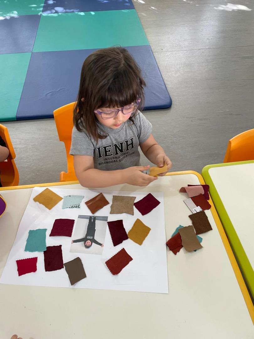Após a conversa inicial sobre a importância dos abraços no dia a dia escolar, os alunos registraram fotograficamente a obra e, em seguida, foram convidados a produzir uma releitura criativa. Utilizando retalhos de tecido e cola, exploraram cores, formas e texturas, desenvolvendo a coordenação motora fina e expressando seus sentimentos por meio da arte.