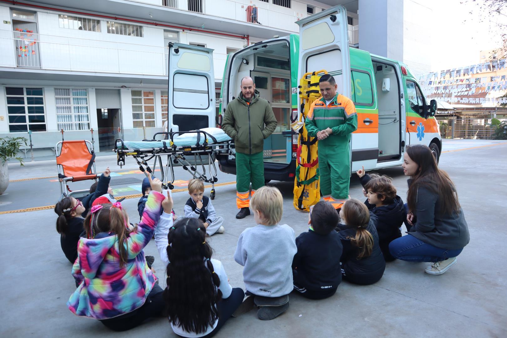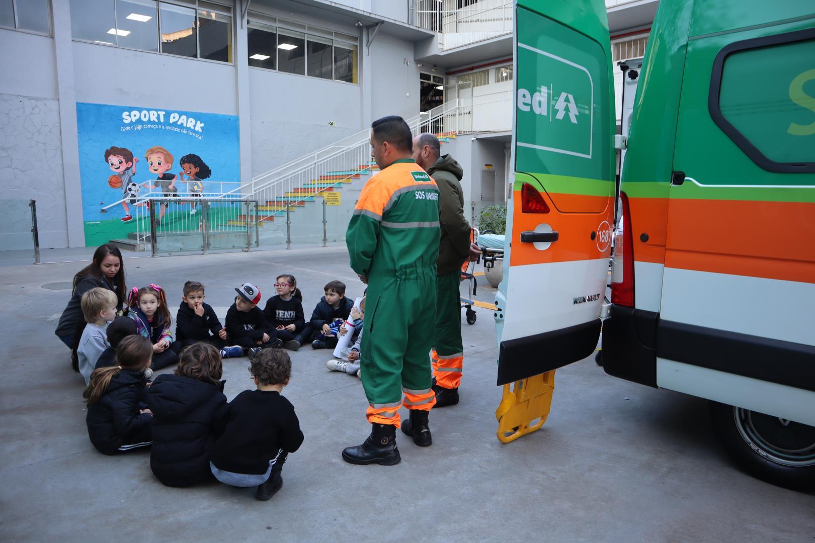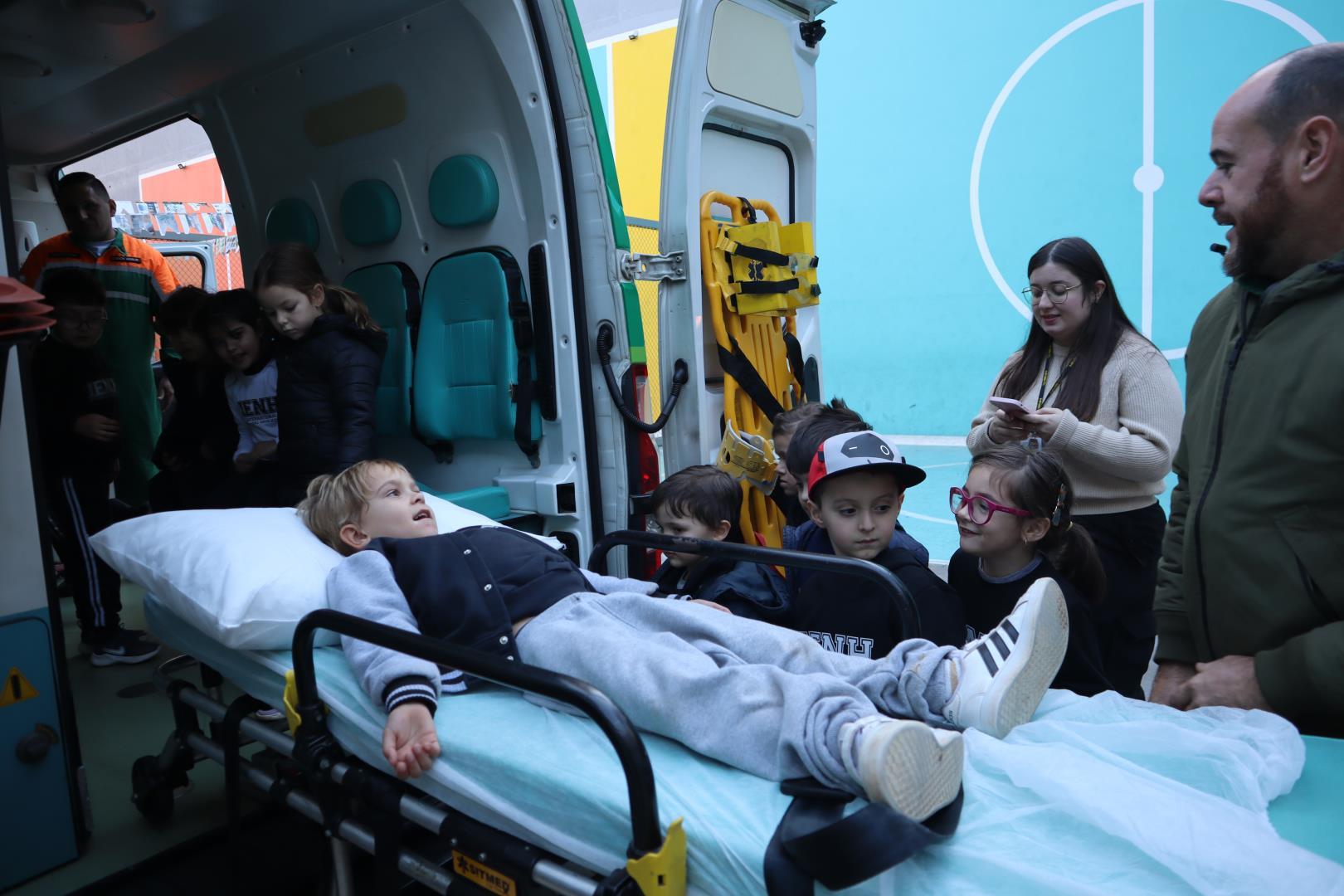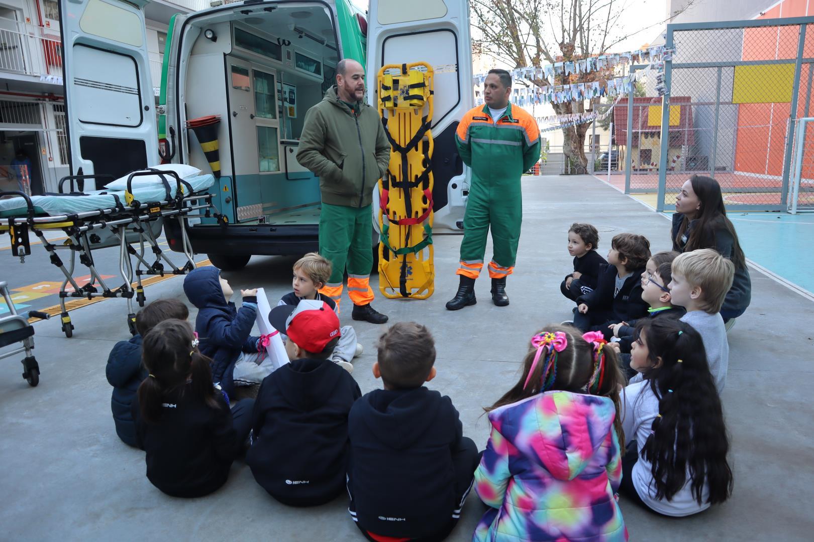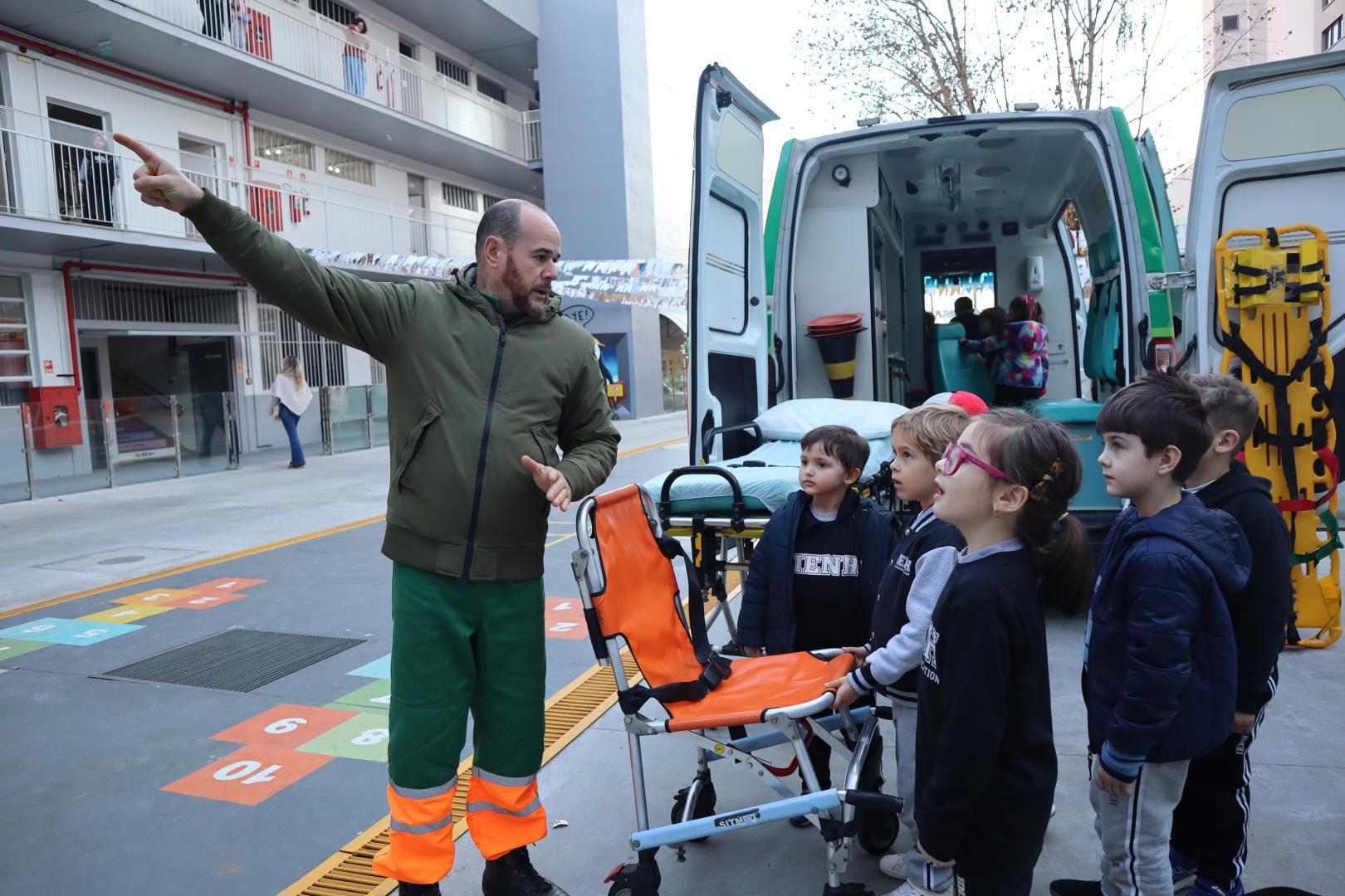 Uma ambulância da Unimed estacionou na IENH no dia 26 de junho e proporcionou uma experiência incrível para o Kindergarten 5B da Educação Infantil do Currículo Internacional Bilíngue da IENH – Unidade Oswaldo Cruz. A turma teve a oportunidade de conhecer de perto os equipamentos de primeiros socorros e descobrir como funciona o trabalho dos socorristas. A visita fez parte dos estudos da turma sobre o corpo humano.