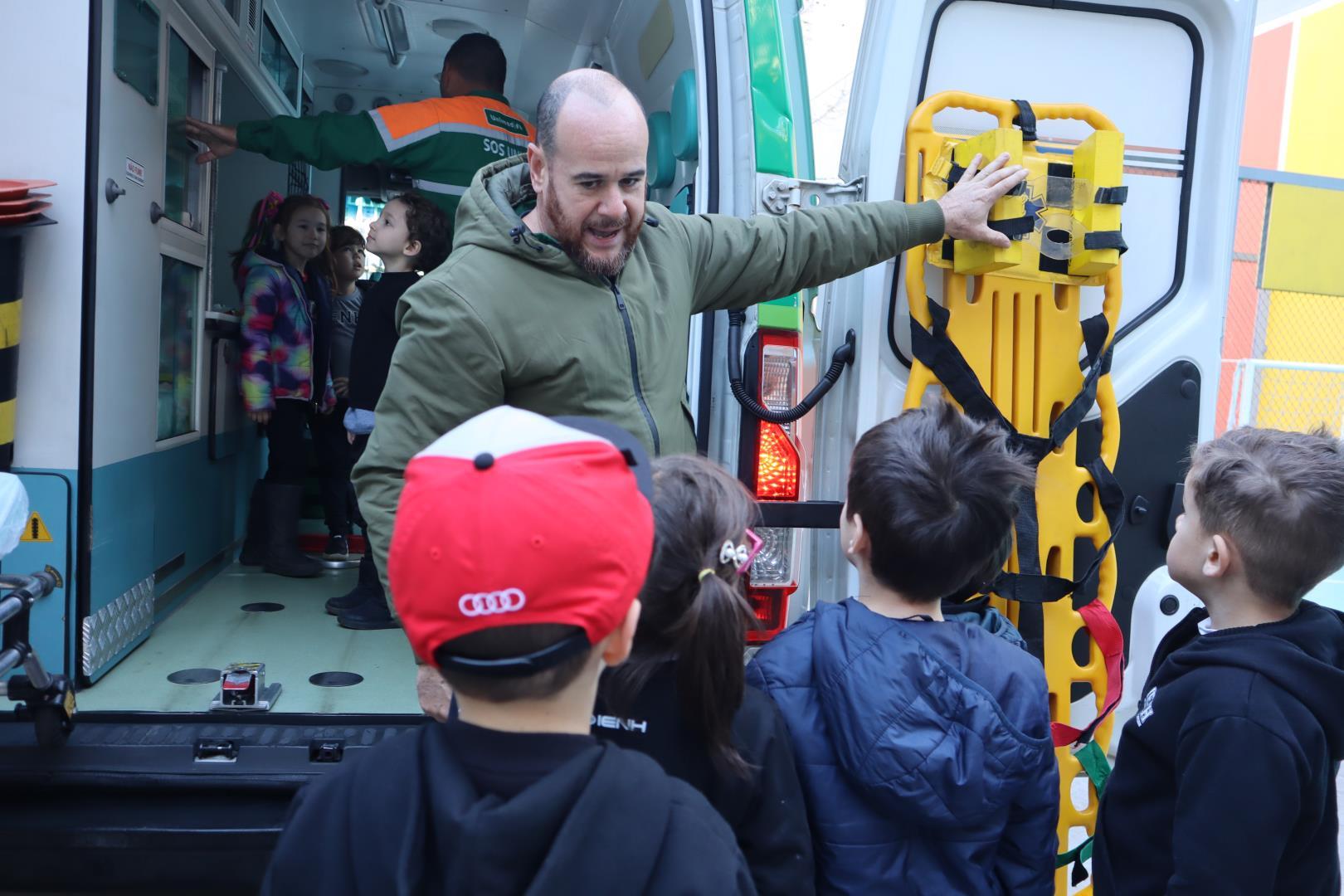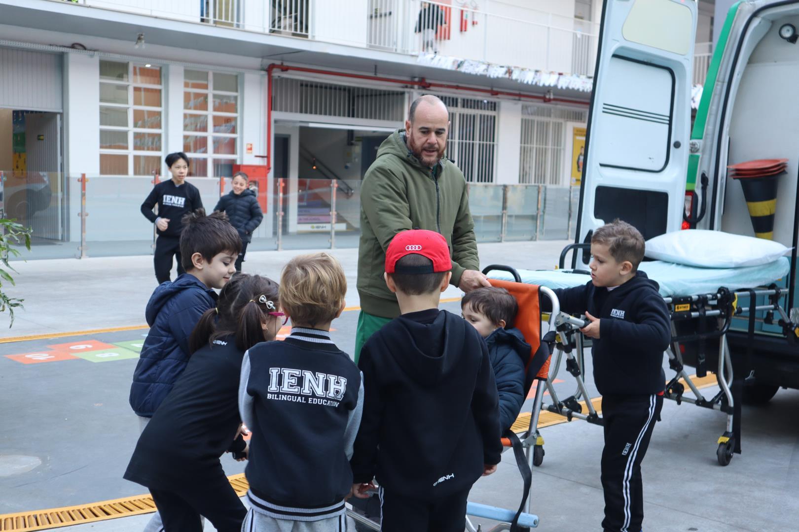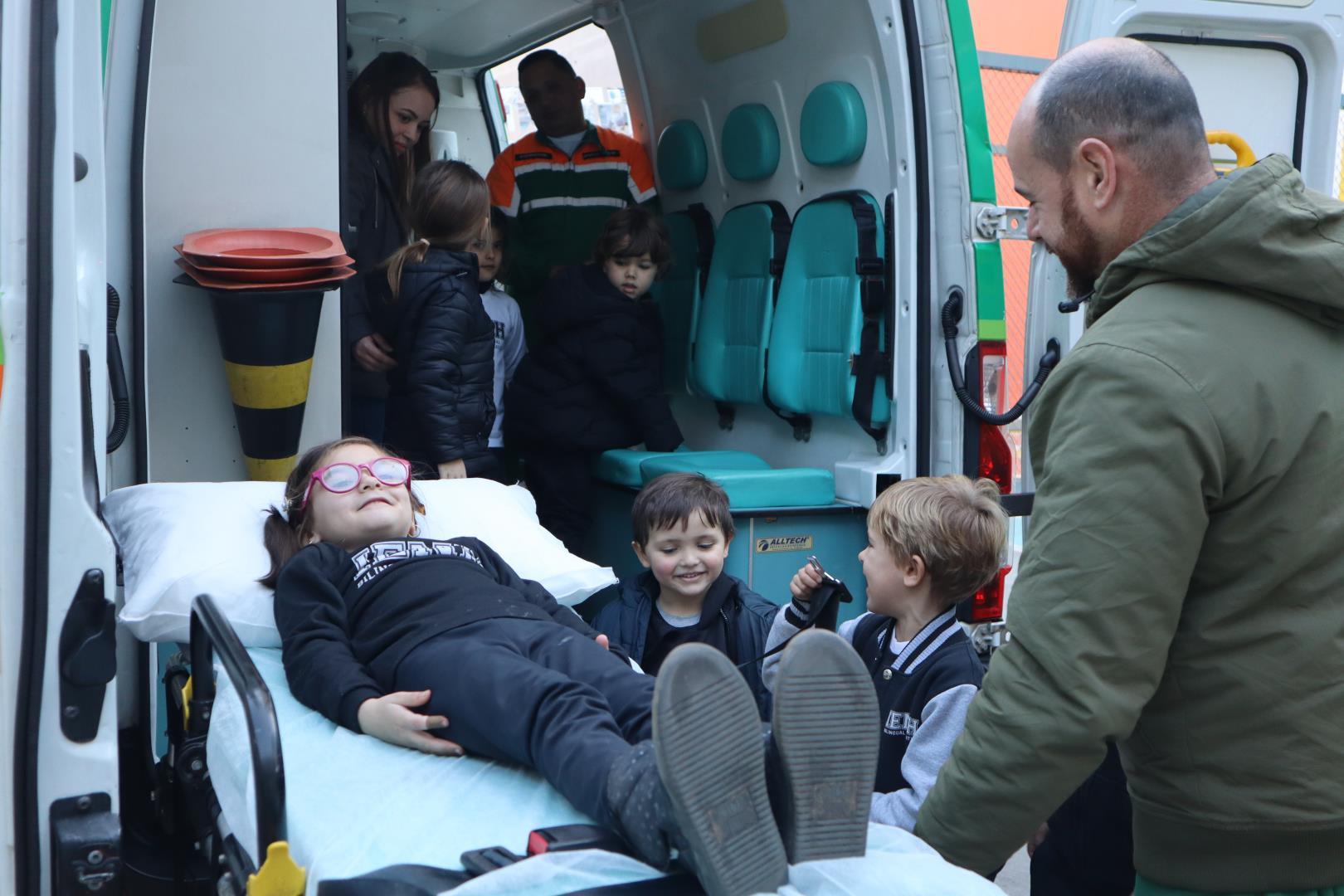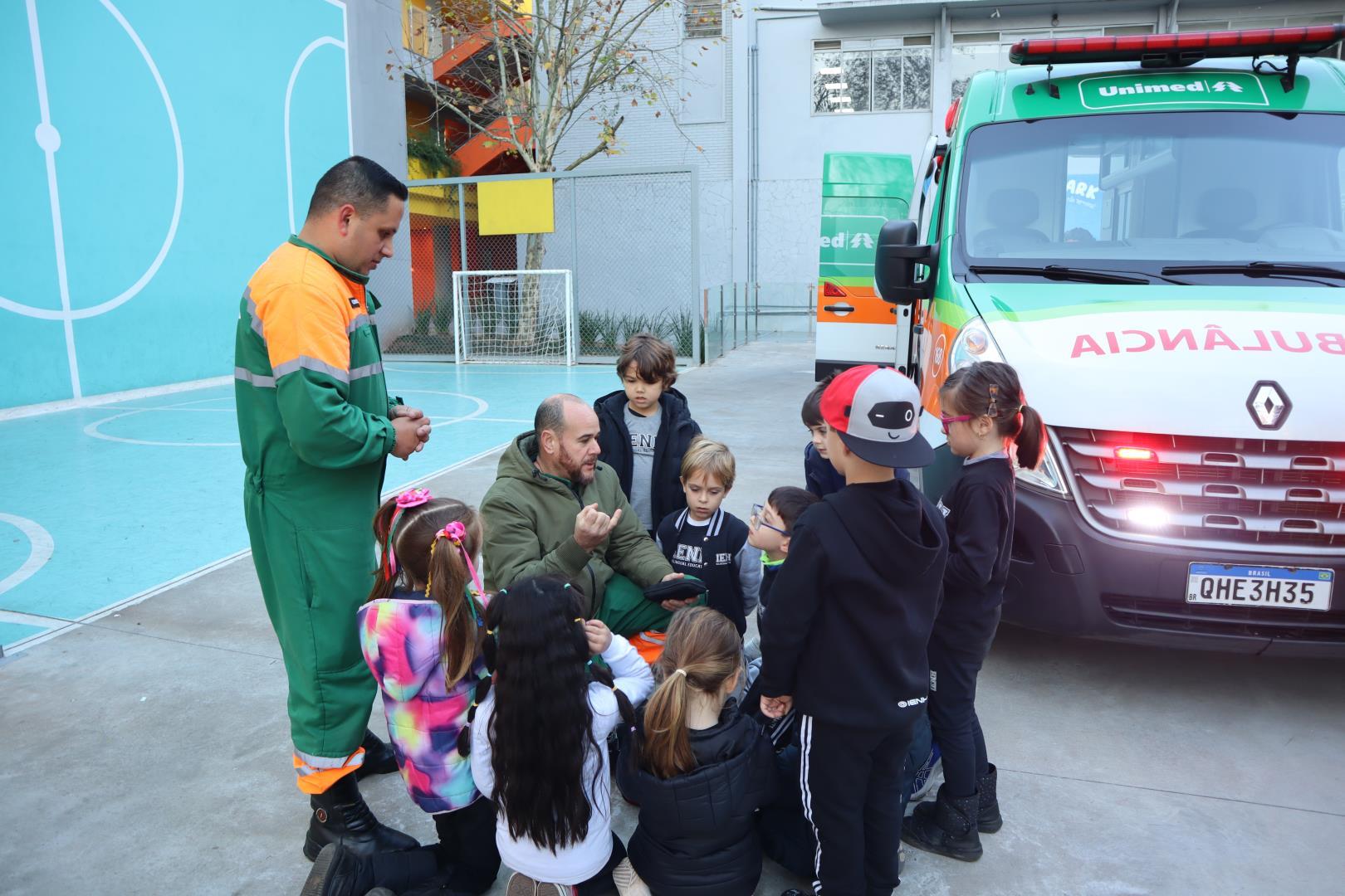 Uma ambulância da Unimed estacionou na IENH no dia 26 de junho e proporcionou uma experiência incrível para o Kindergarten 5B da Educação Infantil do Currículo Internacional Bilíngue da IENH – Unidade Oswaldo Cruz. A turma teve a oportunidade de conhecer de perto os equipamentos de primeiros socorros e descobrir como funciona o trabalho dos socorristas. A visita fez parte dos estudos da turma sobre o corpo humano.
