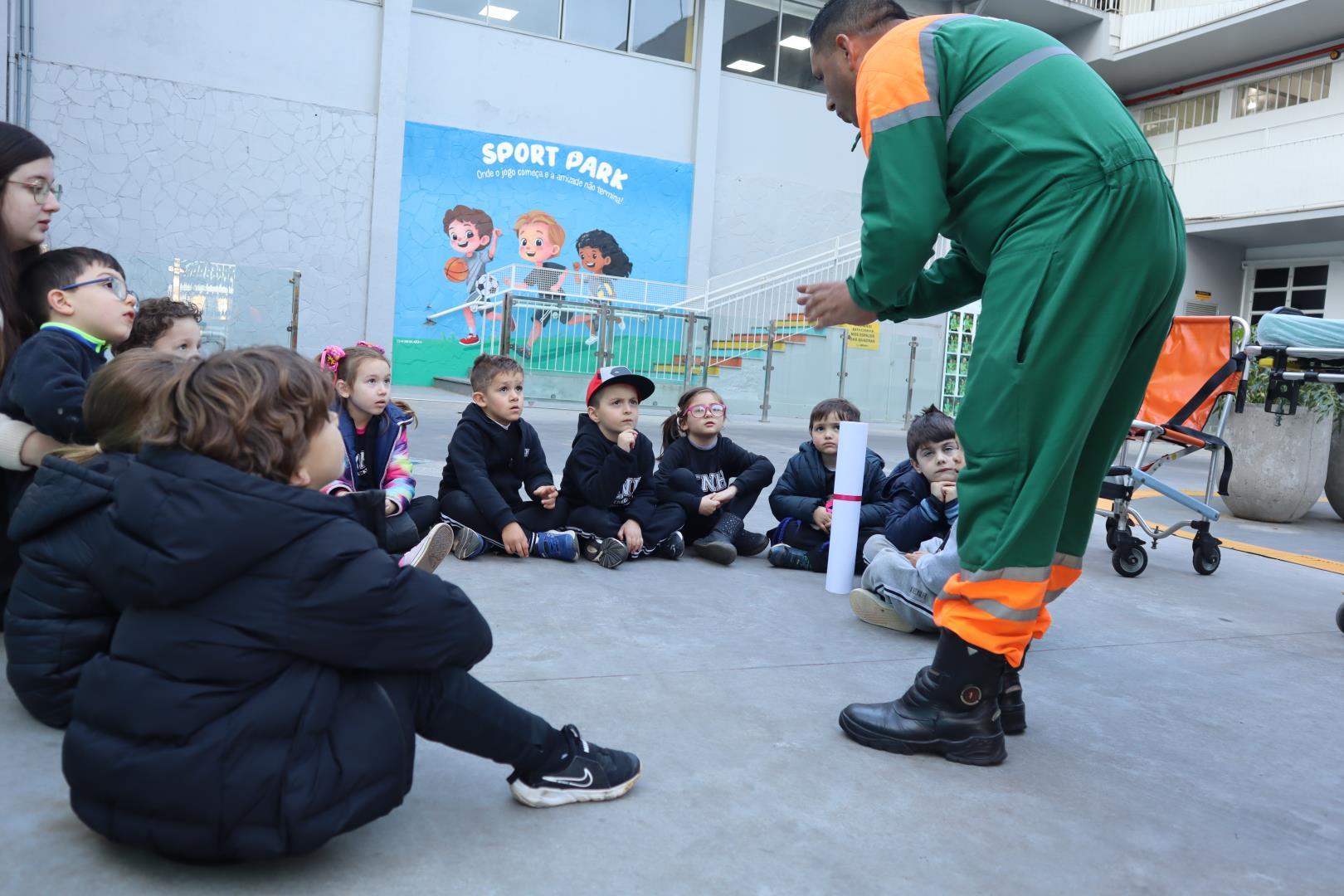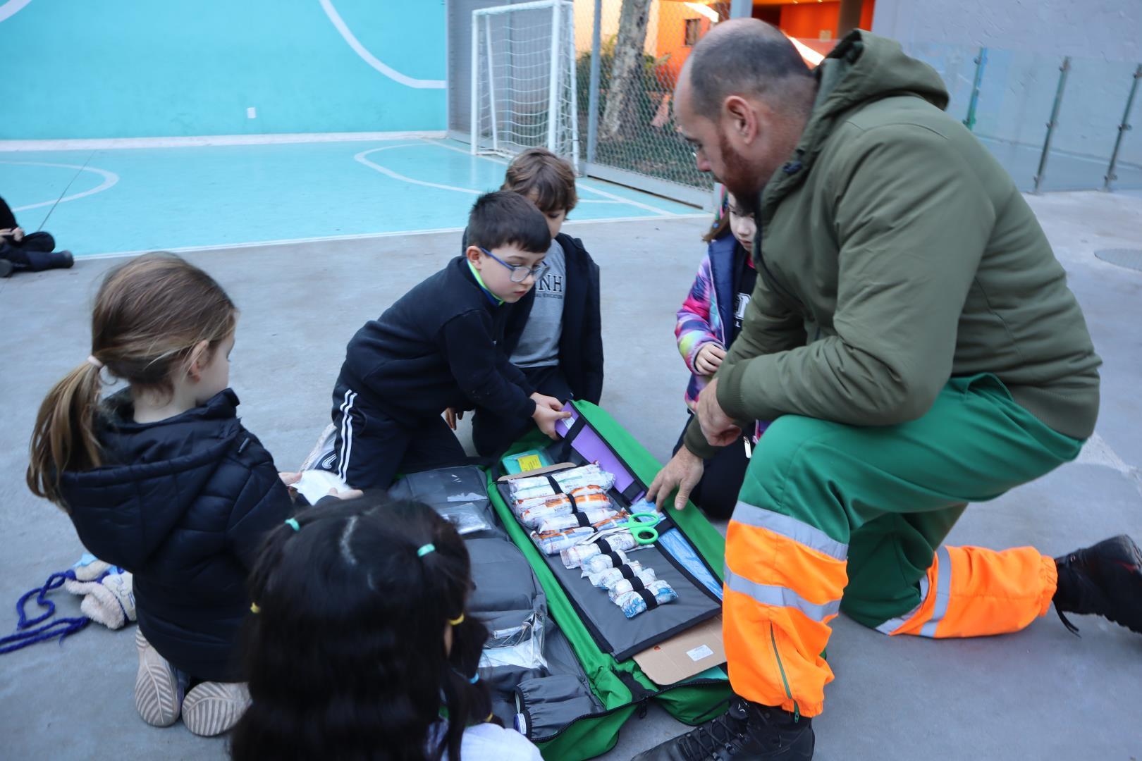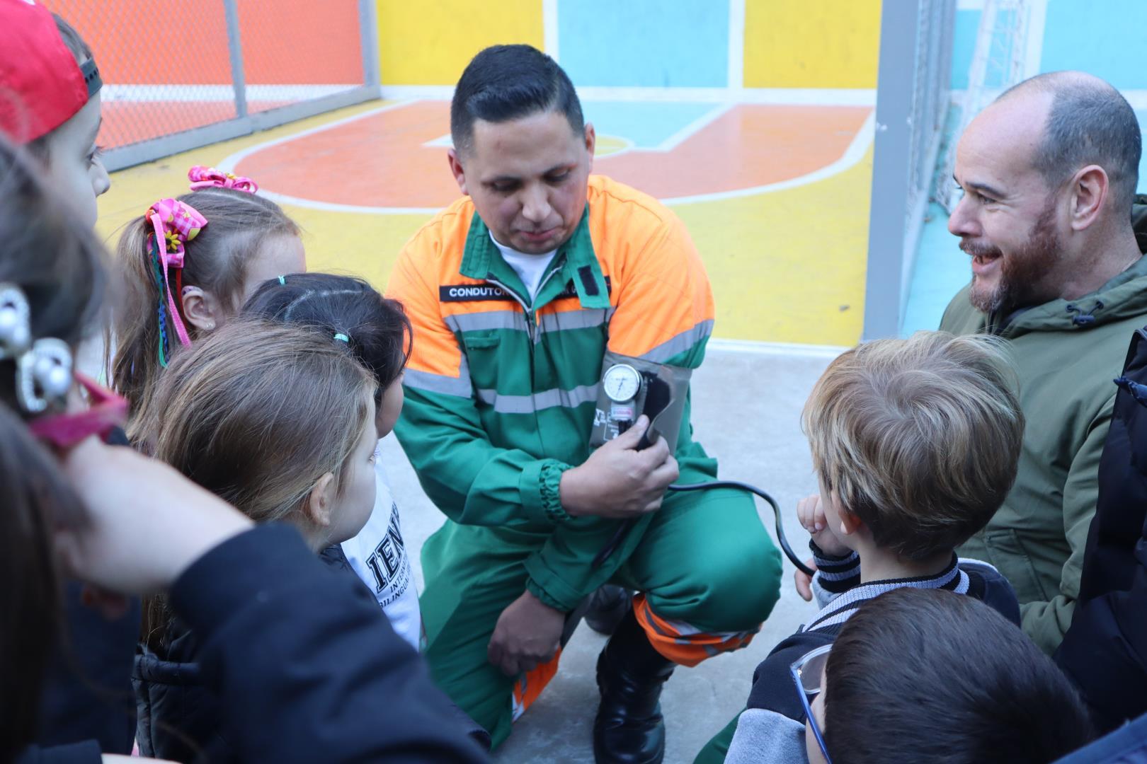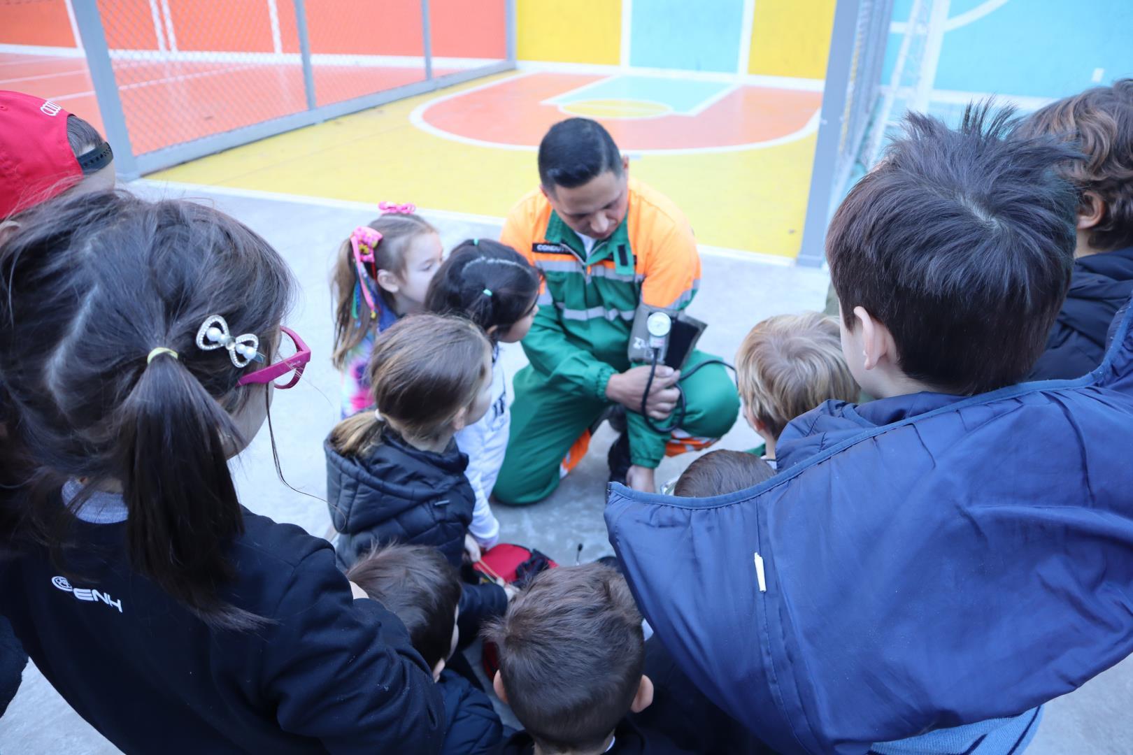 Durante a conversa, os socorristas perguntaram quem gostaria de ser médico ou enfermeiro, e várias crianças levantaram as mãos com entusiasmo.