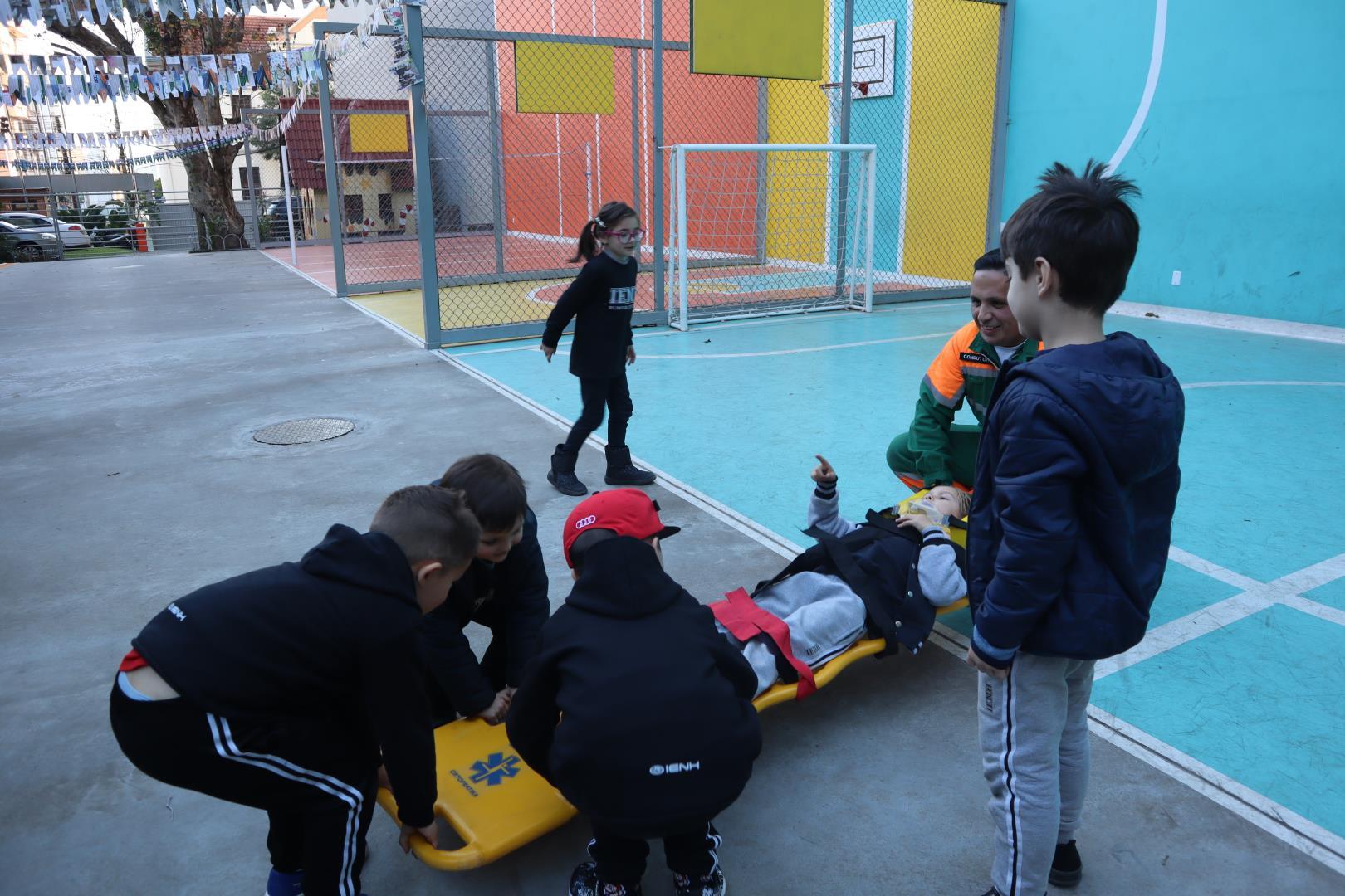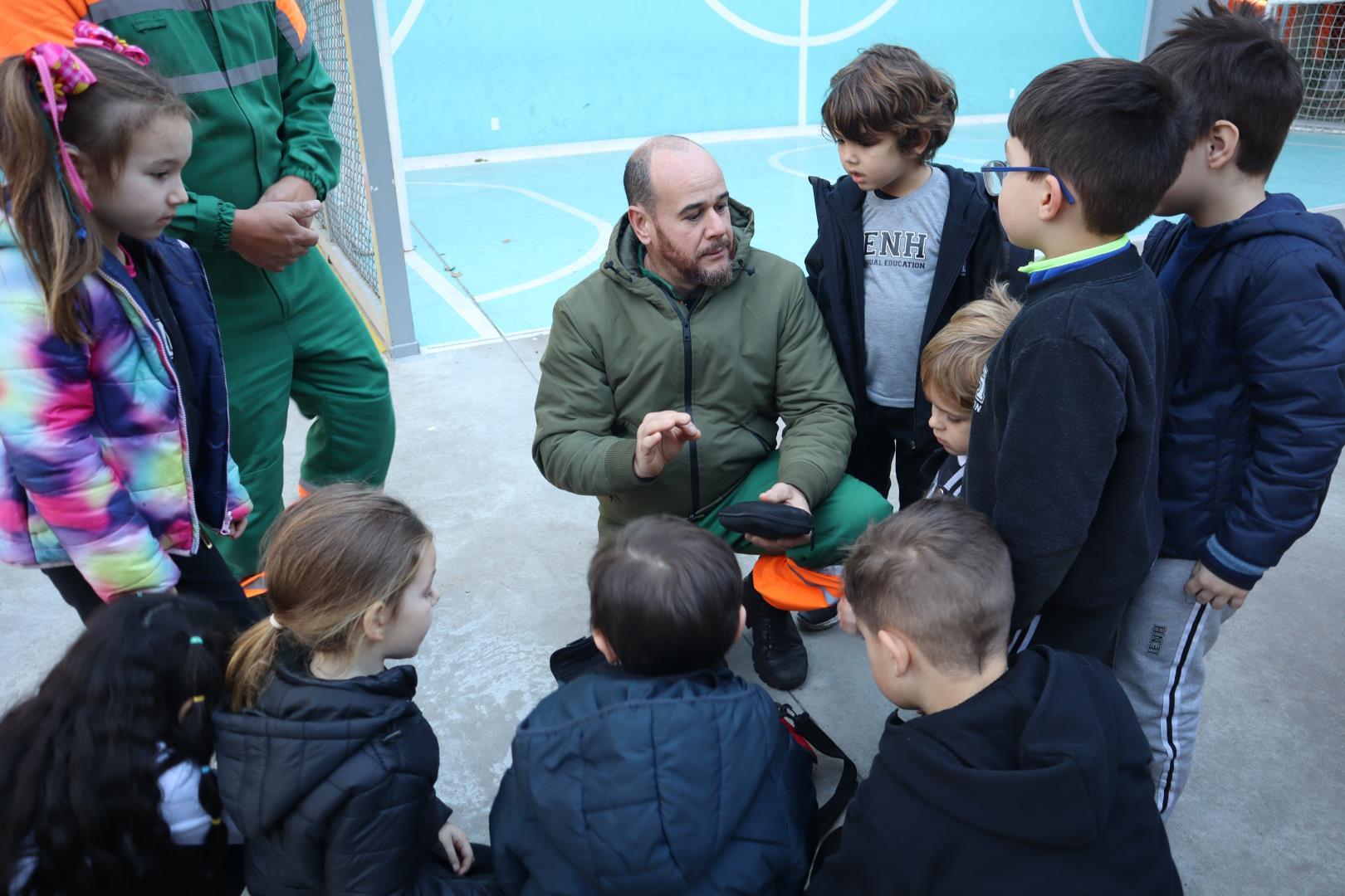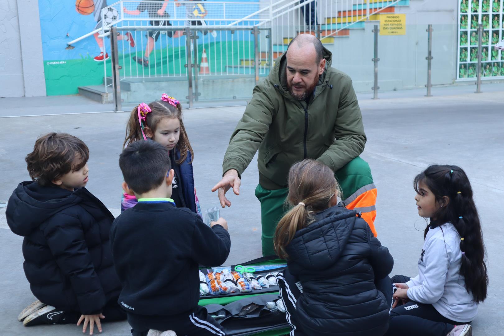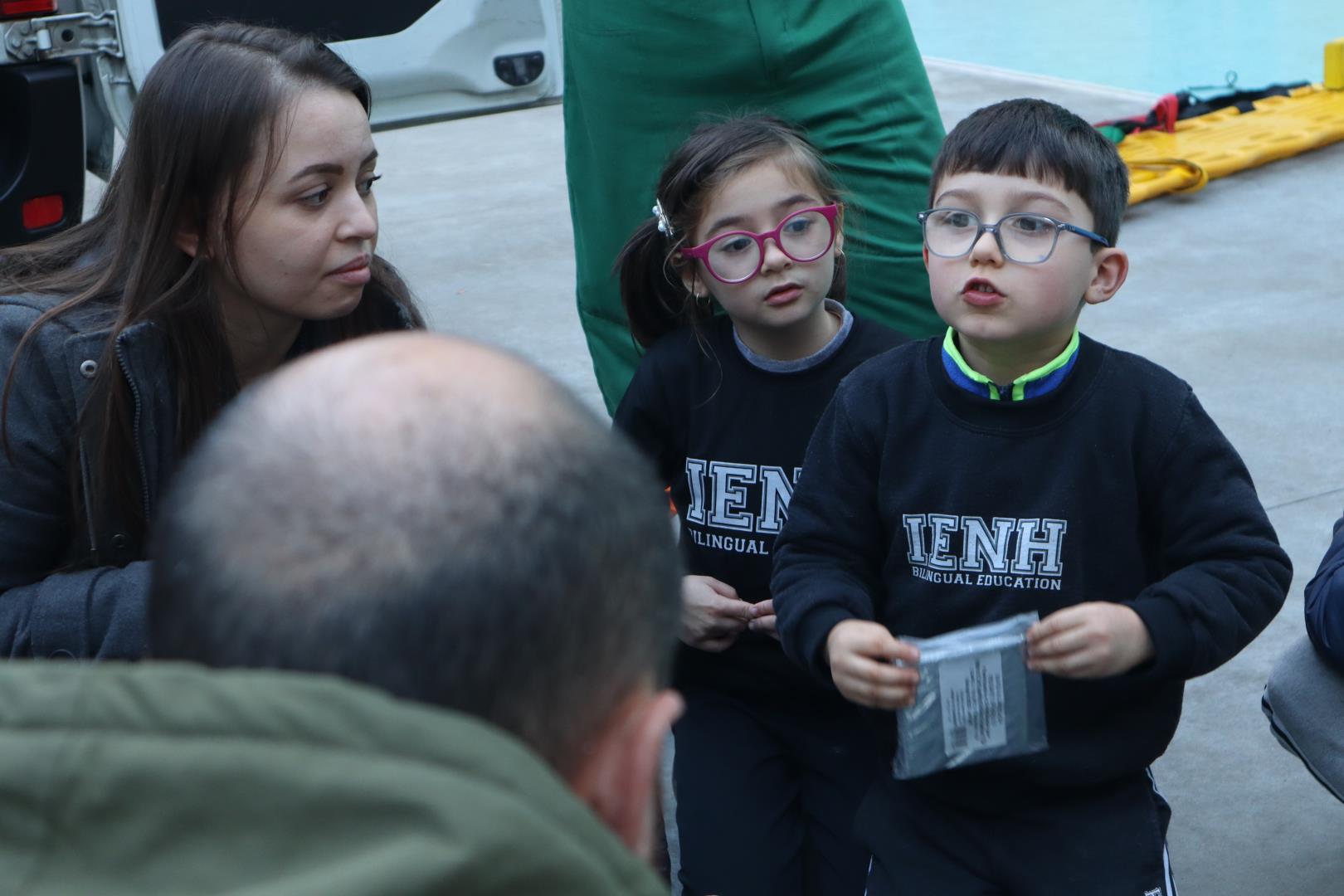 Durante a conversa, os socorristas perguntaram quem gostaria de ser médico ou enfermeiro, e várias crianças levantaram as mãos com entusiasmo.
