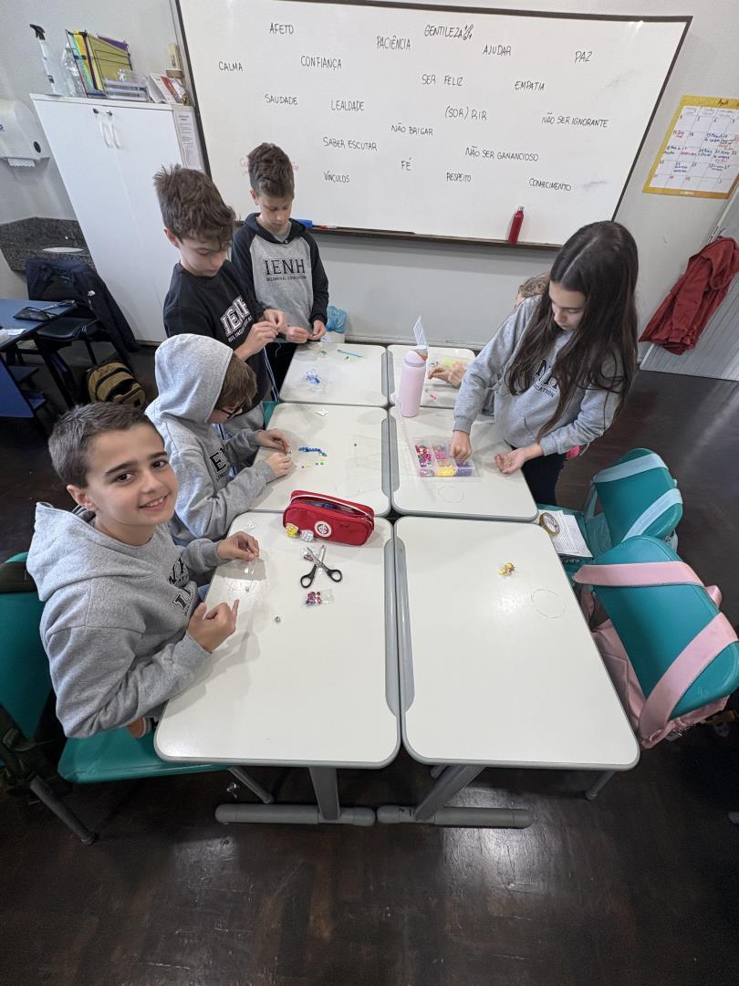 Estudantes do Ensino Fundamental do Currículo Internacional Bilíngue da IENH - Unidades Pindorama e Oswaldo Cruz participaram de uma vivência especial com a Pastoral Escolar, inspirada no valor da amizade. A proposta foi a confecção de uma pulseira da amizade, preparada para um colega da turma. Cada miçanga escolhida simbolizava um valor essencial para as relações: cuidado, empatia, respeito e lealdade.