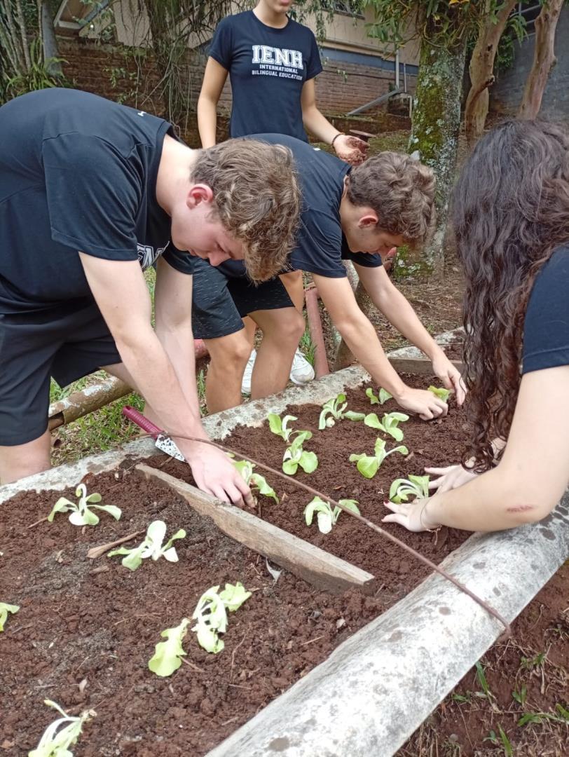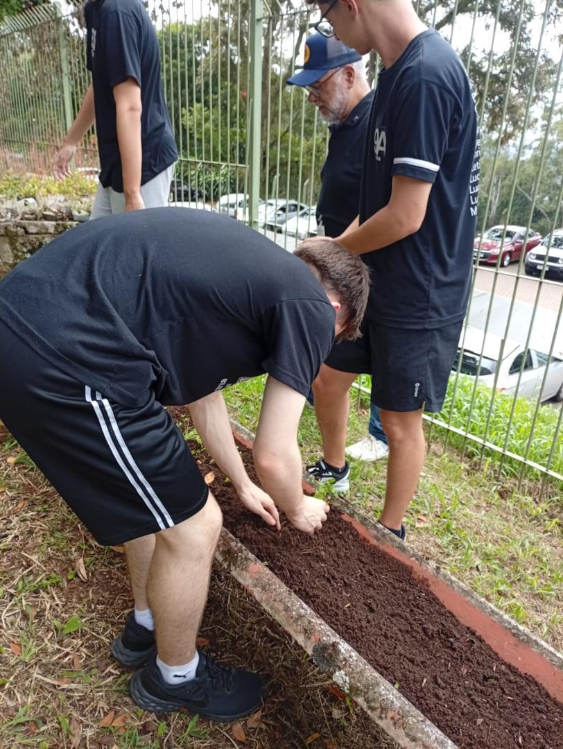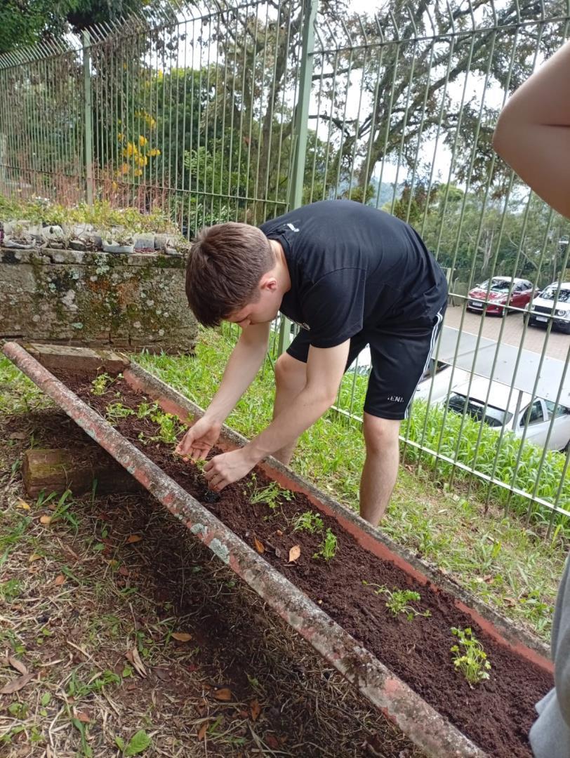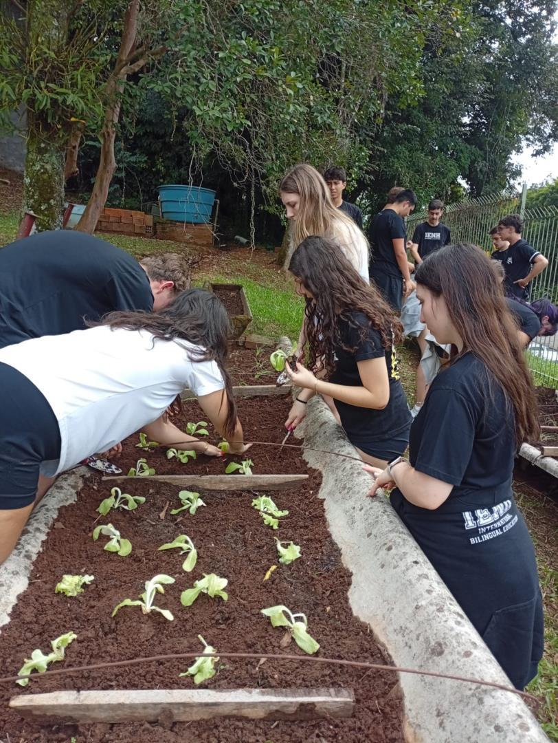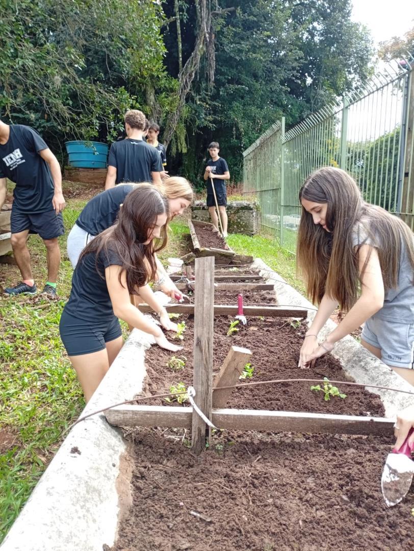 Na sequência, os estudantes participaram de uma atividade prática na horta da escola. Durante a vivência, colocaram a mão na terra, preparando o solo, organizando os canteiros e realizando o plantio de mudas de hortaliças. O contato direto com os ciclos naturais ampliou a percepção sobre a importância do cuidado com o solo, a água e os seres vivos envolvidos nesse processo.
