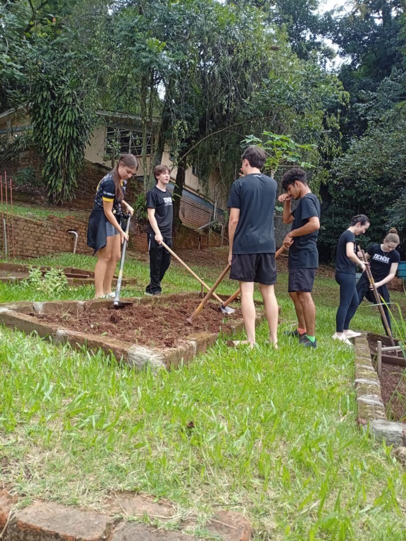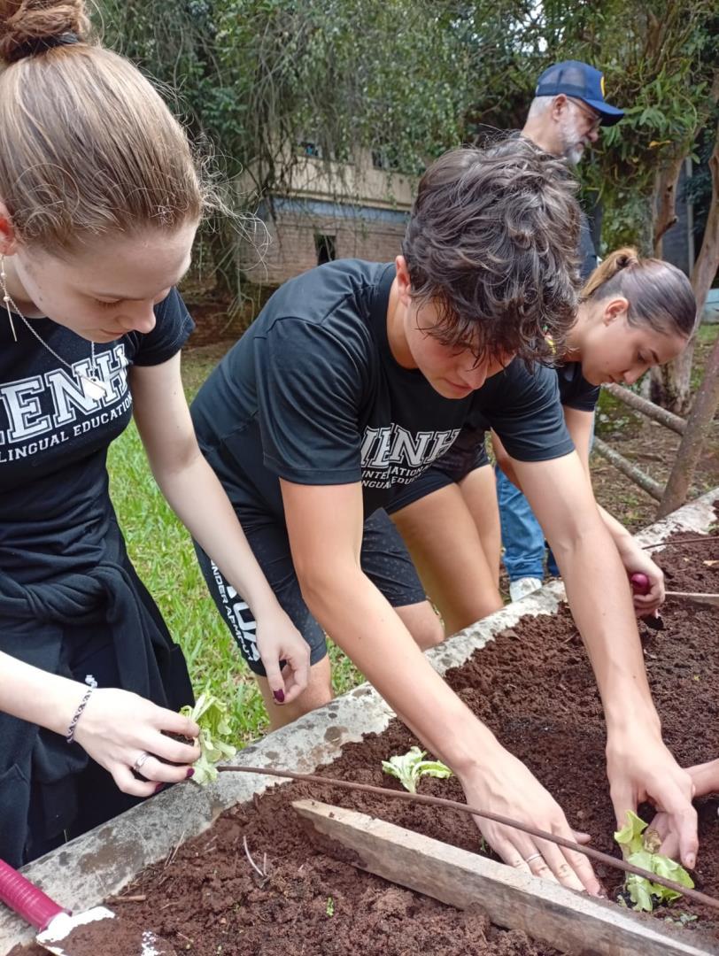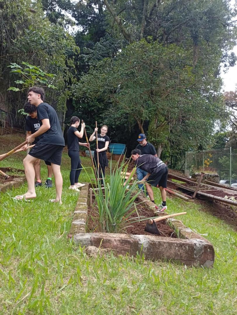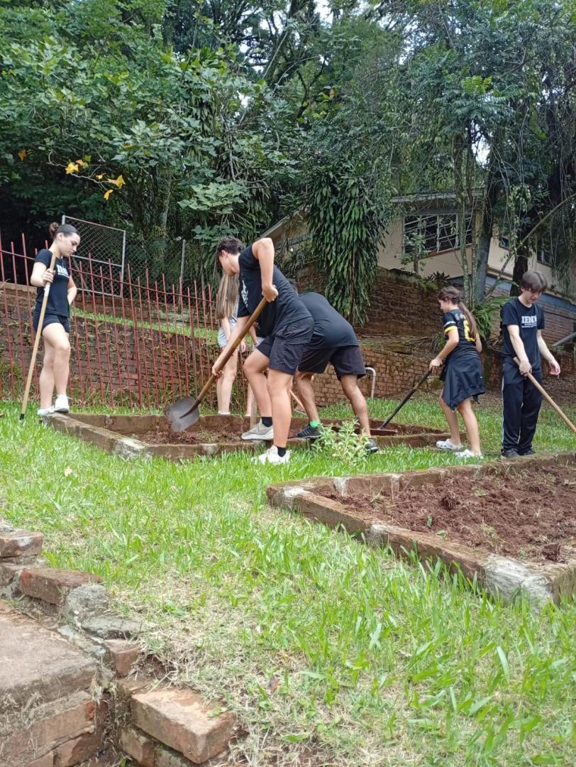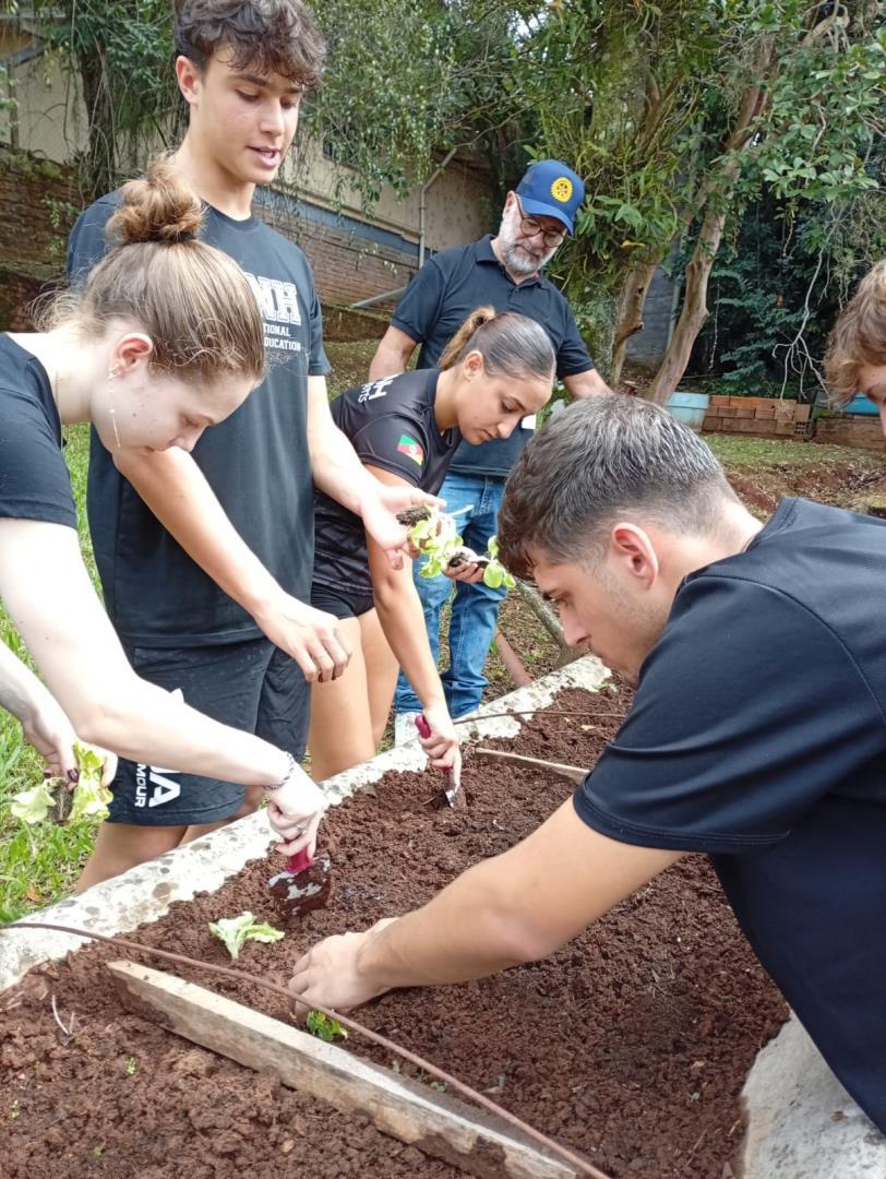 Na sequência, os estudantes participaram de uma atividade prática na horta da escola. Durante a vivência, colocaram a mão na terra, preparando o solo, organizando os canteiros e realizando o plantio de mudas de hortaliças. O contato direto com os ciclos naturais ampliou a percepção sobre a importância do cuidado com o solo, a água e os seres vivos envolvidos nesse processo.