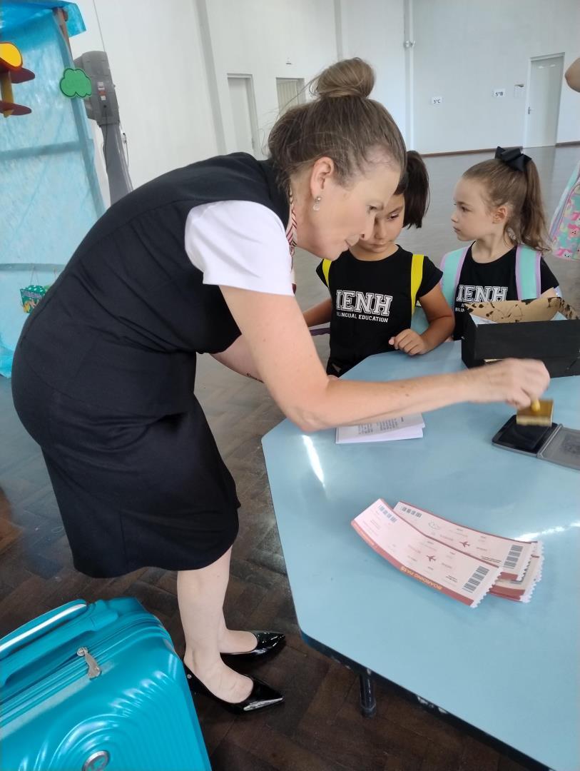 Na chegada à escola, os estudantes foram recebidos pela professora Eneida, caracterizada como aeromoça, dando início à experiência. As professoras e a teacher das turmas também prepararam um áudio inspirado nos avisos de bordo de um avião, dando boas-vindas às crianças e indicando o caminho para cada sala.