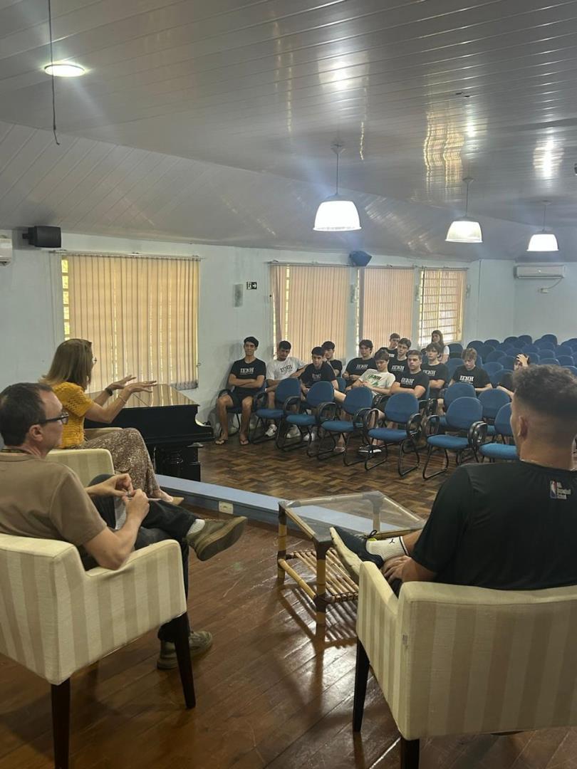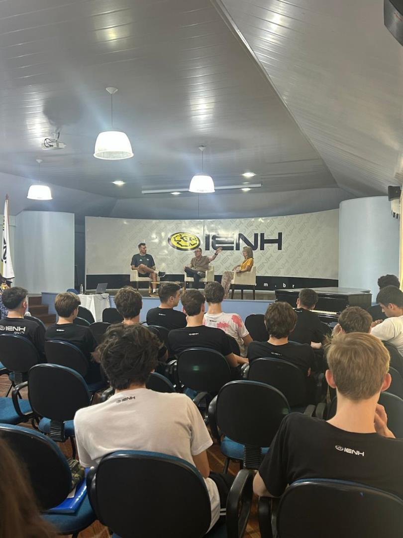 A atividade transformou a Sala de Conferências em um espaço de escuta e troca. Para enriquecer o diálogo, contribuíram o professor Marcelo Vier, a coordenadora do Programa Socioambiental da IENH, Isabel Lizakoski e o auxiliar de Desenvolvimento Escolar Arthur Klein, que trouxe ao debate sua vivência como treinador.