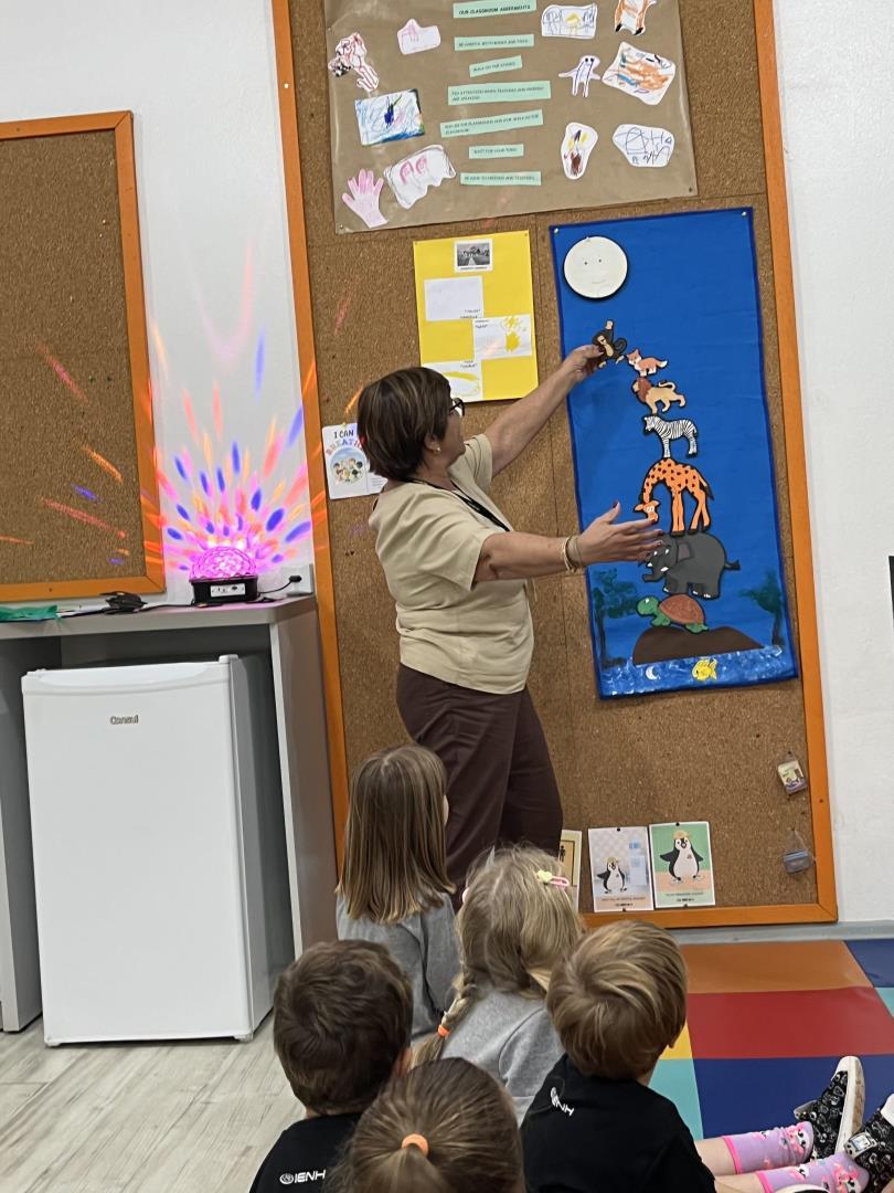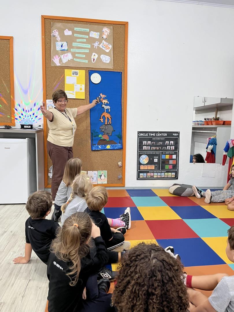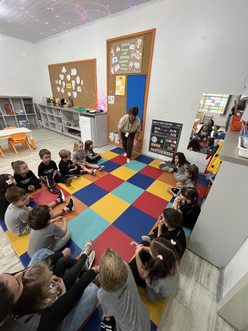 A atividade contou com a presença da Coordenadora da Unidade, Célia Corrêa, que também realizou a contação de histórias para a turma. A narrativa, que aborda a união de diversos animais na tentativa de descobrir o sabor da lua, prendeu a atenção das crianças, gerando encantamento e envolvimento – especialmente por dialogar com o projeto atual da turma, que explora o universo dos mamíferos.