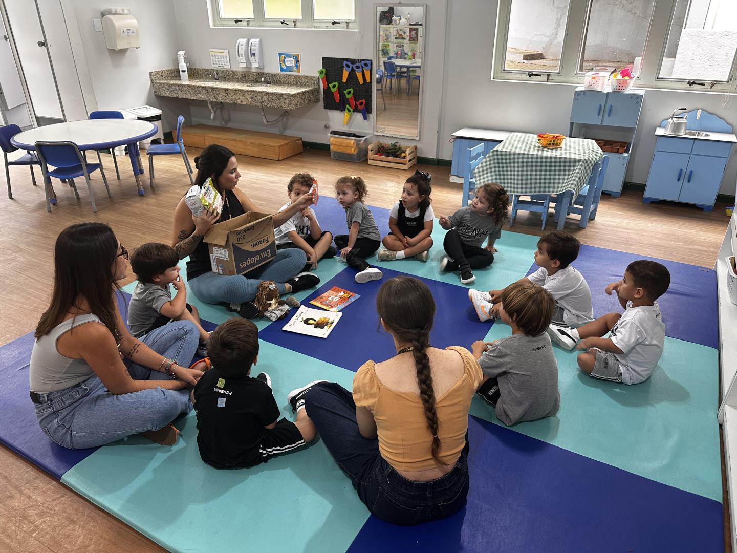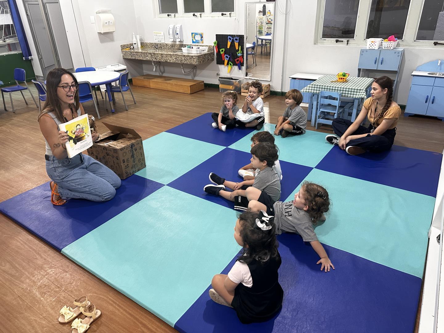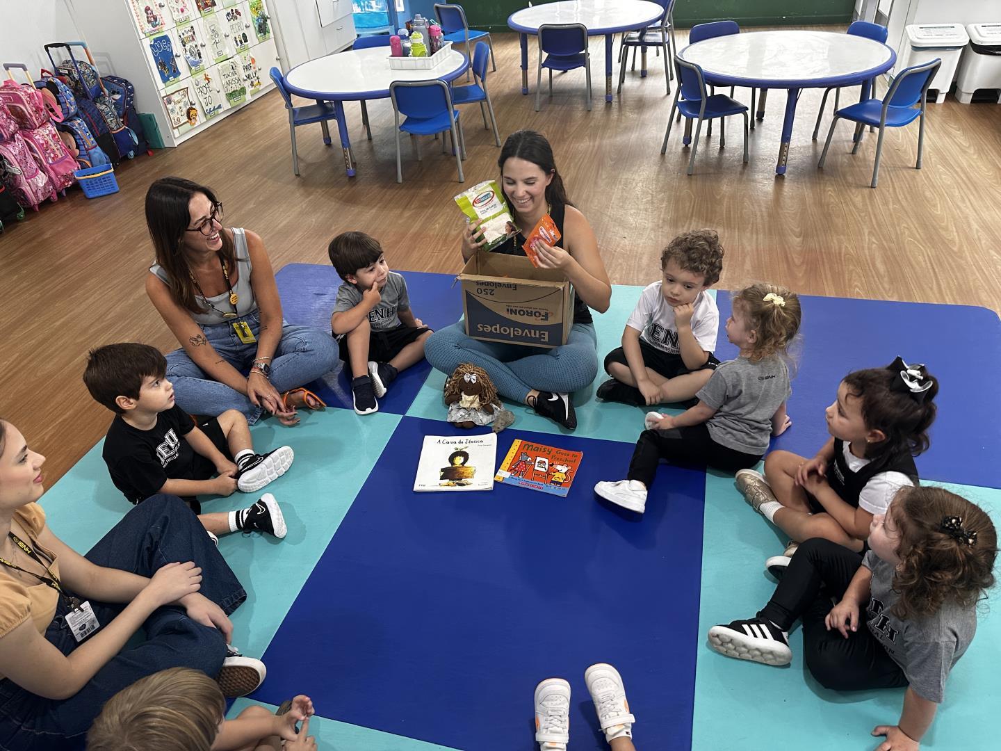 A atividade, foi conduzida pela professora Joana Schneider Machado e pela teacher Larissa Vieira Bernardi, e teve início a partir da contação das histórias A Caixa de Jéssica, de Peter Carnavas, e Maisy Cleans Up, de Lucy Cousins. As narrativas apresentam um elemento em comum que rapidamente despertou o interesse das crianças: deliciosos cupcakes presentes nos universos das personagens.
