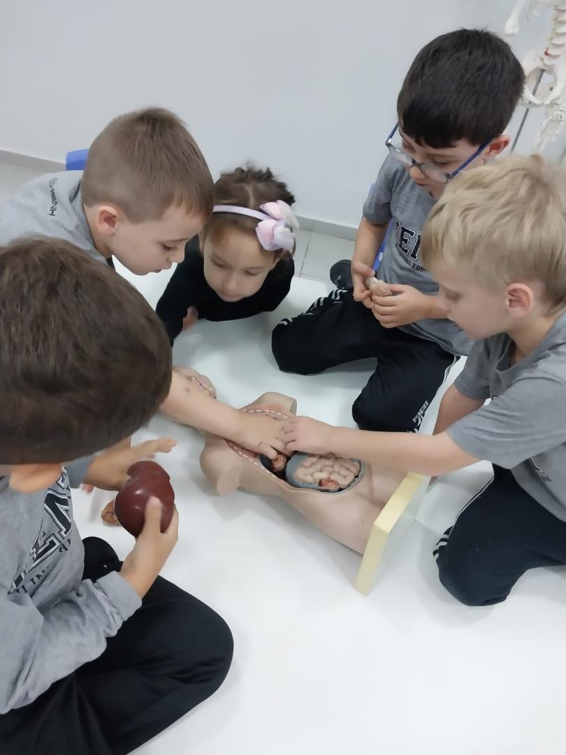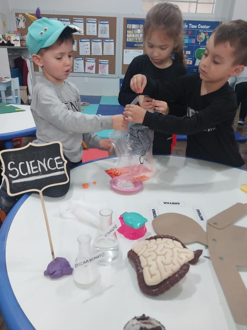 Coordenado pela professora Morgana Machado Pedra e pela teacher Claudia Felix, com o apoio da auxiliar Maria Helena Damacena, o projeto contou com uma série de atividades que encantaram e estimularam os pequenos pesquisadores. Entre as vivências, destacam-se a exploração dos sentidos na mystery box, o circuito do sistema digestivo, a cooking class sobre sabores, a visita ao laboratório de ciências, o uso de óculos de realidade virtual (VR) para uma imersão realista no corpo humano e a criação de um texture snack, estimulando o tato e o paladar.