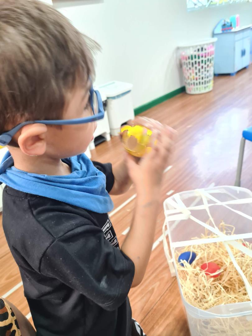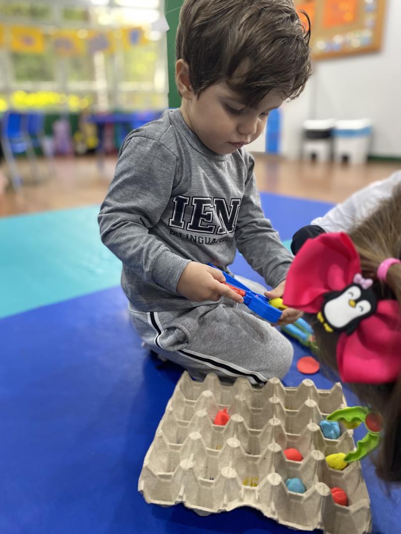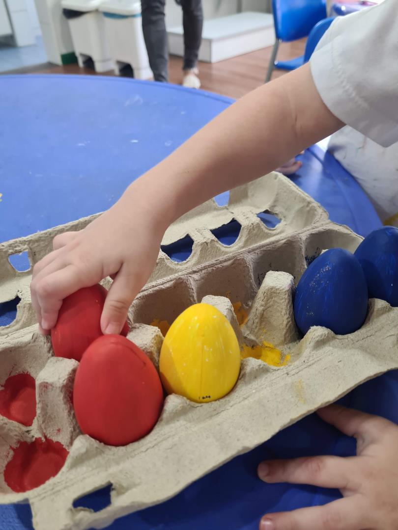 Em outro momento, utilizando a Língua Inglesa, os alunos retiraram ovos coloridos de um recipiente transparente e os classificaram em pequenas bandejas conforme suas cores, nomeando-as em inglês.