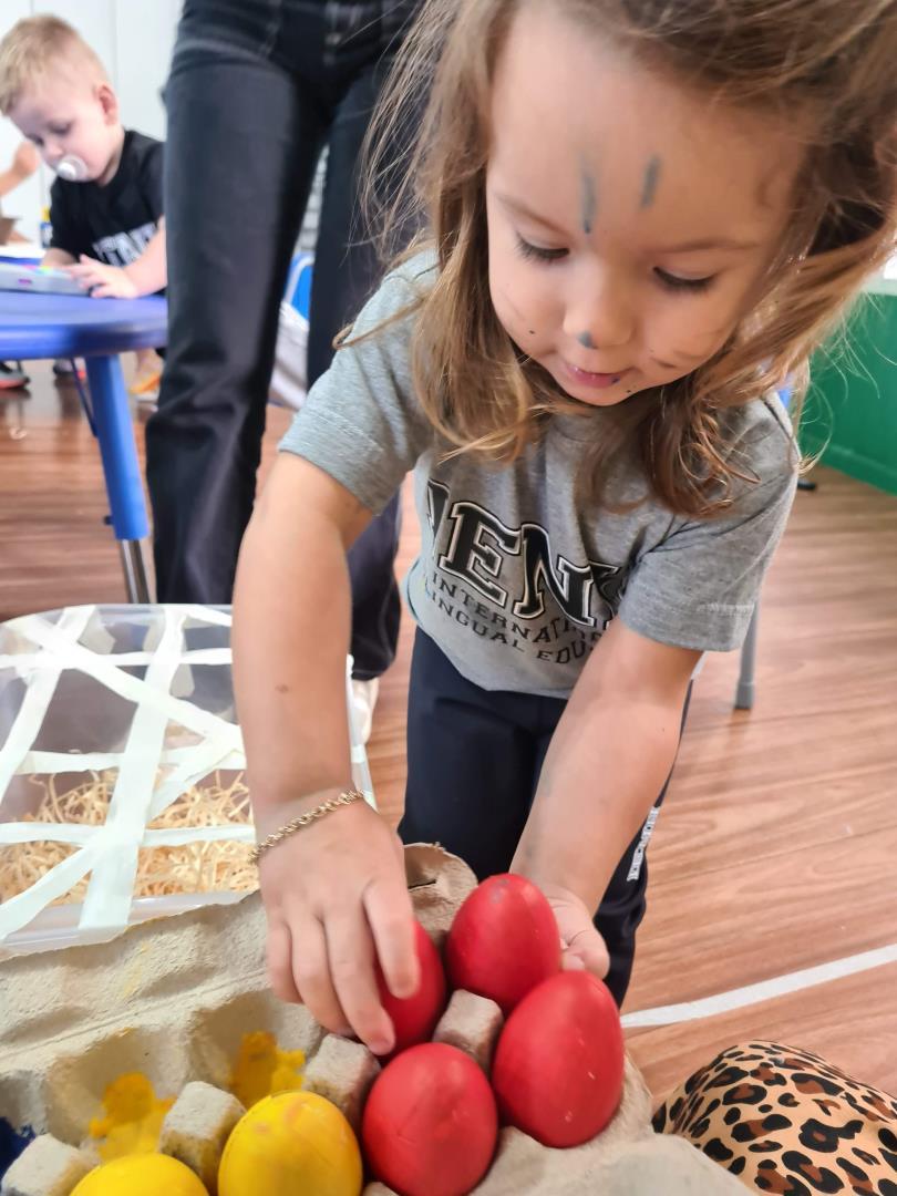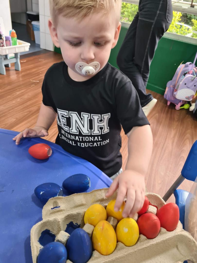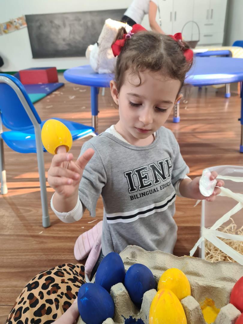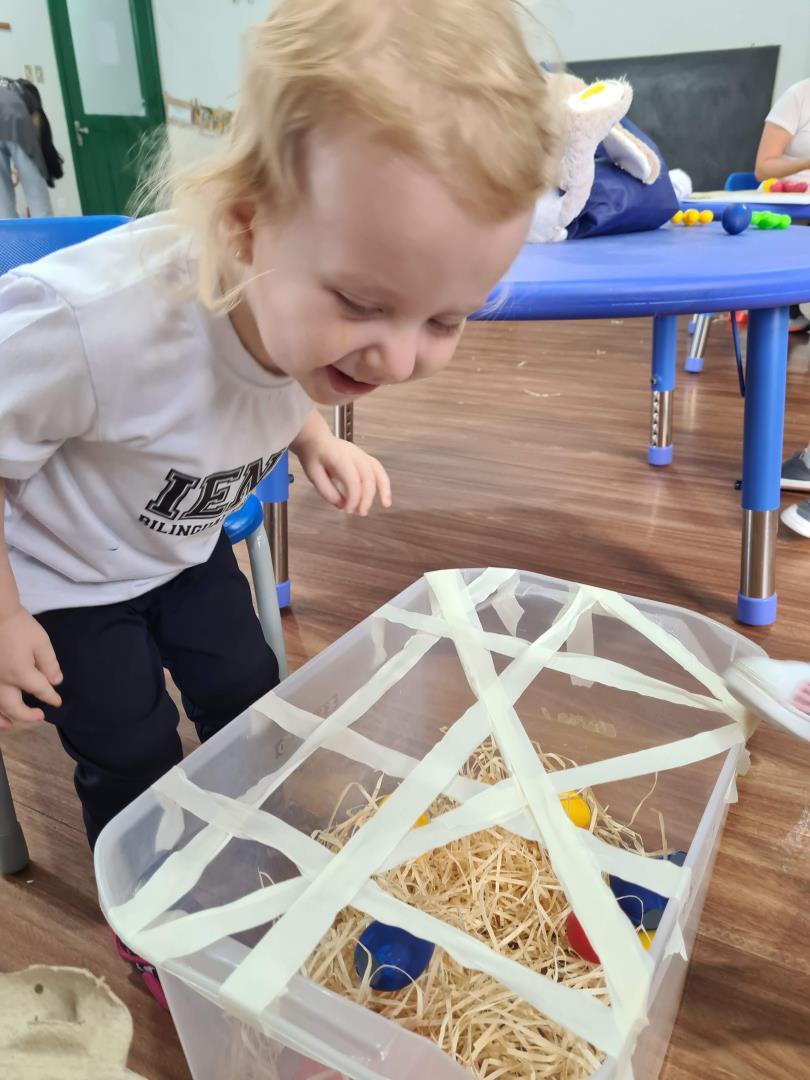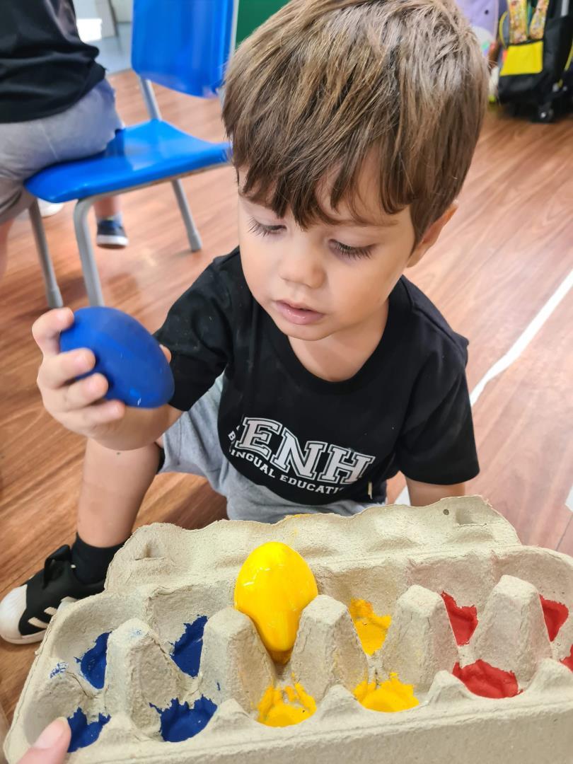 Durante a semana de comemoração da Páscoa, no mês de abril, as crianças do Kindergarten 2A da Educação Infantil do Currículo Internacional Bilíngue da IENH - Unidade Pindorama demonstraram grande interesse pela música “Coelhinho da Páscoa, o que trazes pra mim?”, especialmente pelas cores primárias citadas na canção.