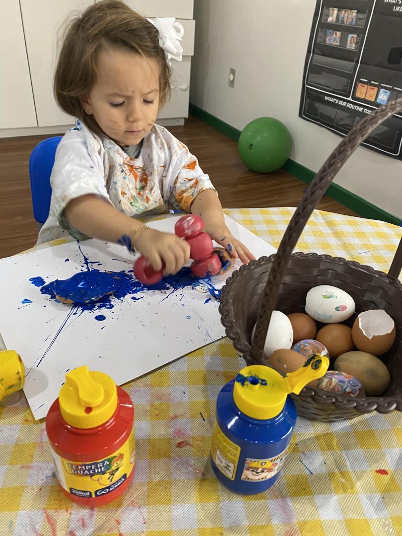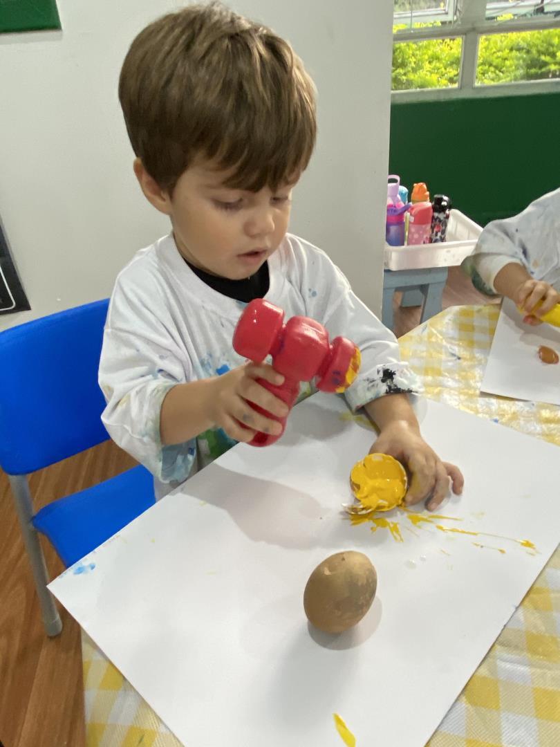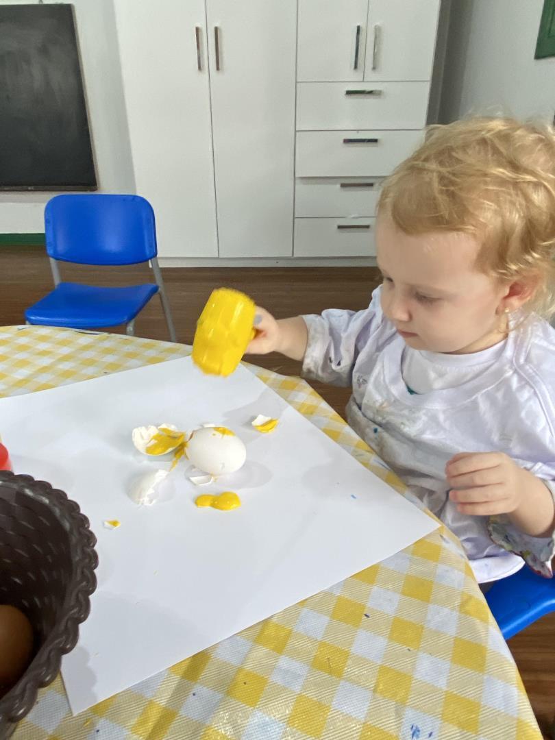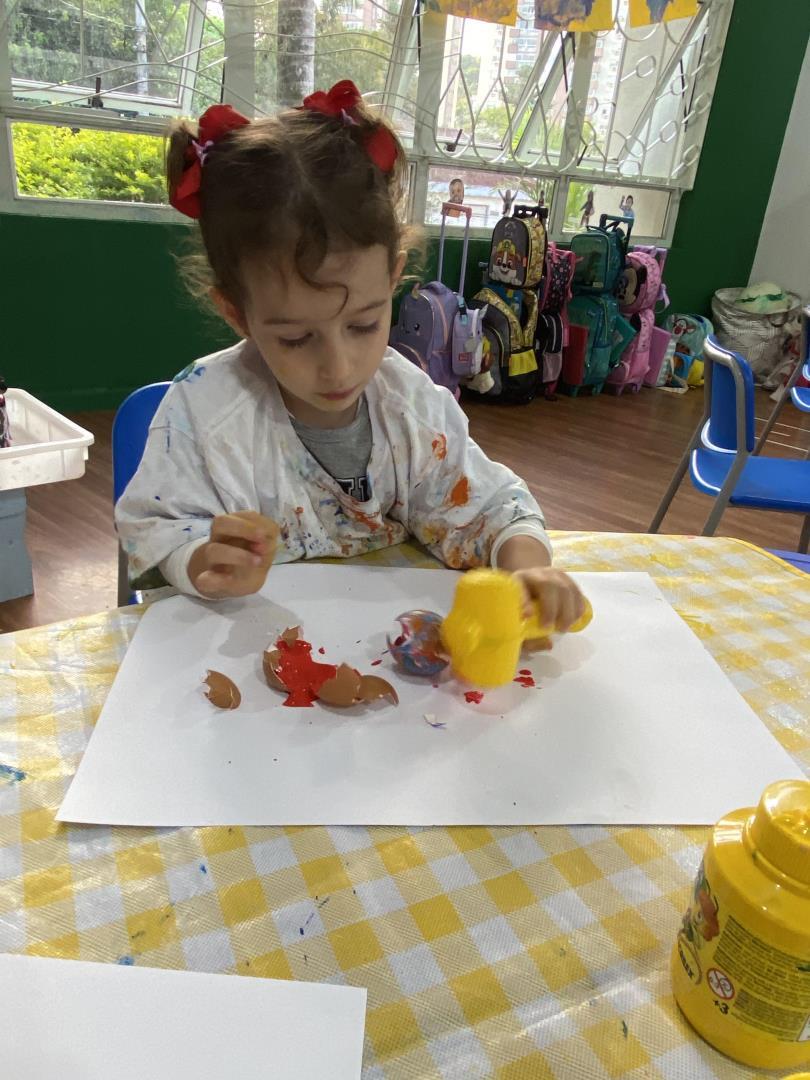 A parte artística da atividade trouxe ainda mais encantamento: cada criança escolheu uma cor de tinta, nomeando-a em inglês ou português, e a utilizou para preencher uma casca de ovo de galinha. Depois, com um pequeno martelo, as crianças bateram na casca, registrando a cor escolhida na folha de papel. Além disso, com formas plásticas de coelho mergulhadas nas tintas primárias, realizaram impressões coloridas enquanto tentavam nomear as cores utilizadas.
