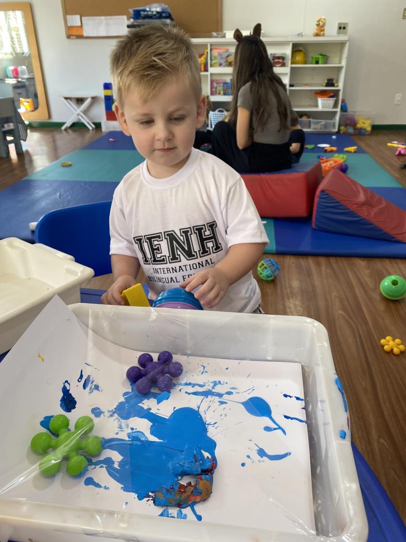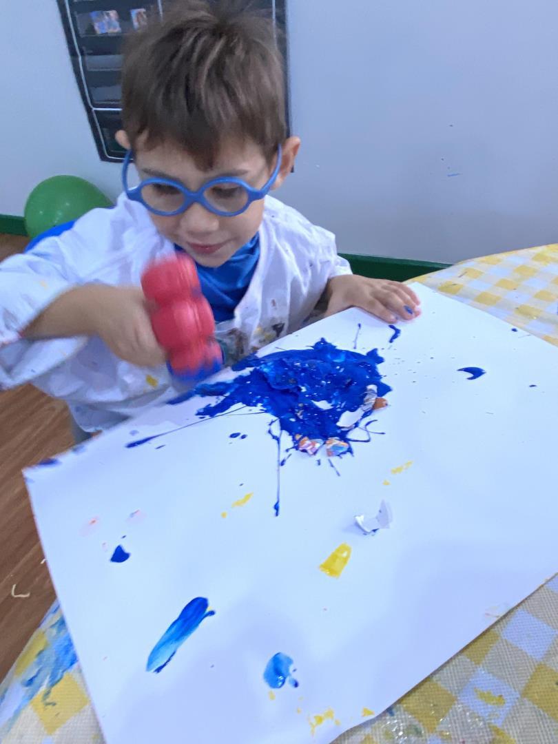 A partir desse entusiasmo, a professora Caroline Ribeiro e a teacher Amanda Escobar planejaram uma série de atividades lúdicas e educativas com foco em jogos matemáticos e registros artísticos que exploraram as cores vermelha, amarela e azul.