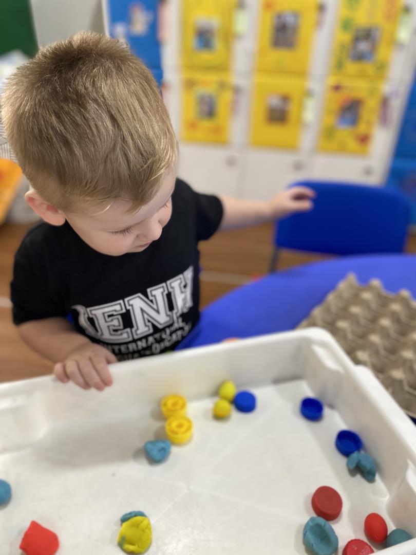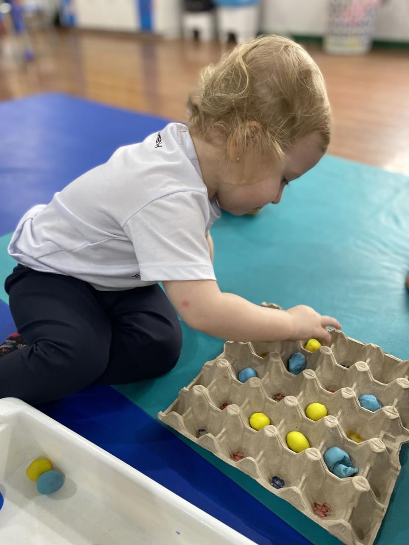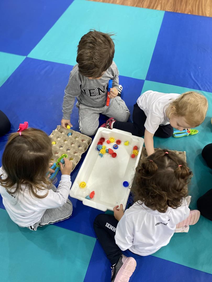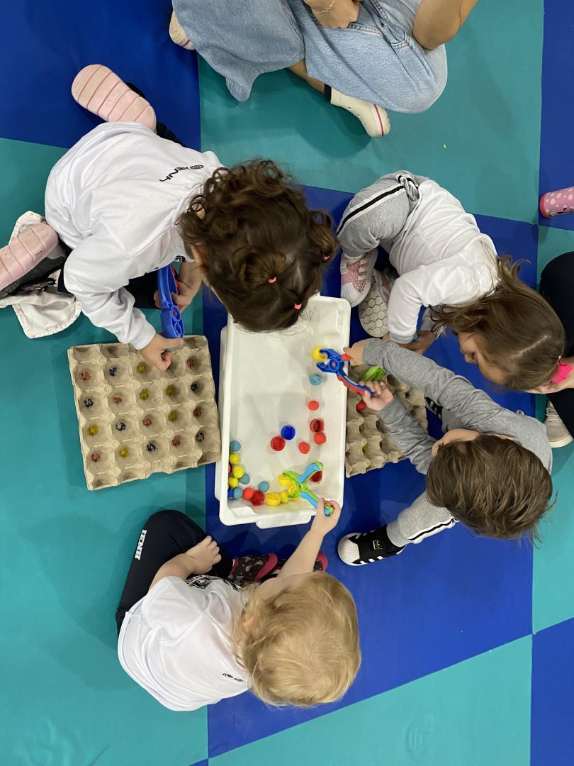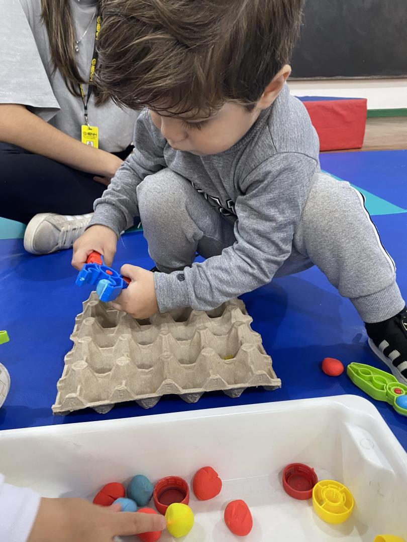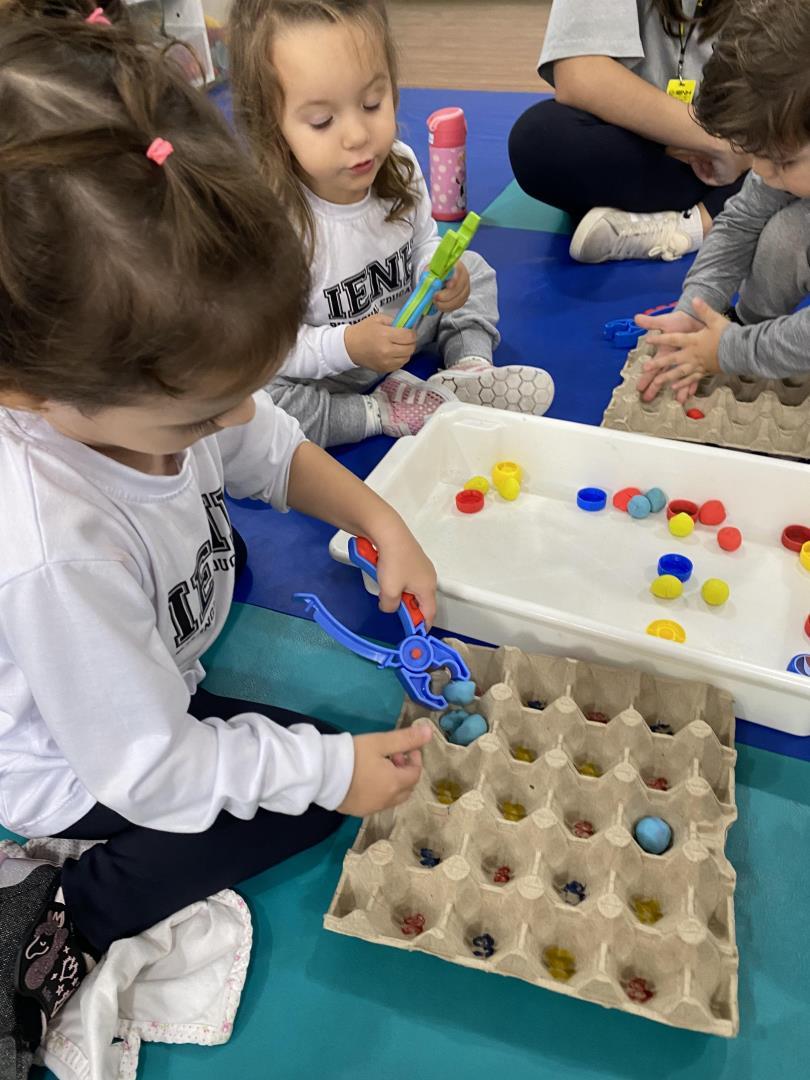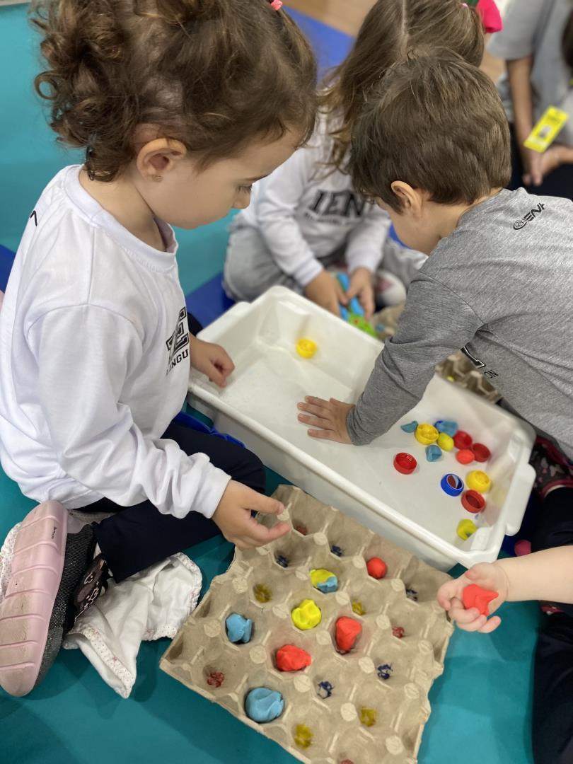 Nos learning centers, um dos jogos consistia em classificar objetos por cor. Para isso, foram utilizadas bandejas de ovos pintadas nas cores primárias, além de tampinhas e bolinhas de massinha misturadas.