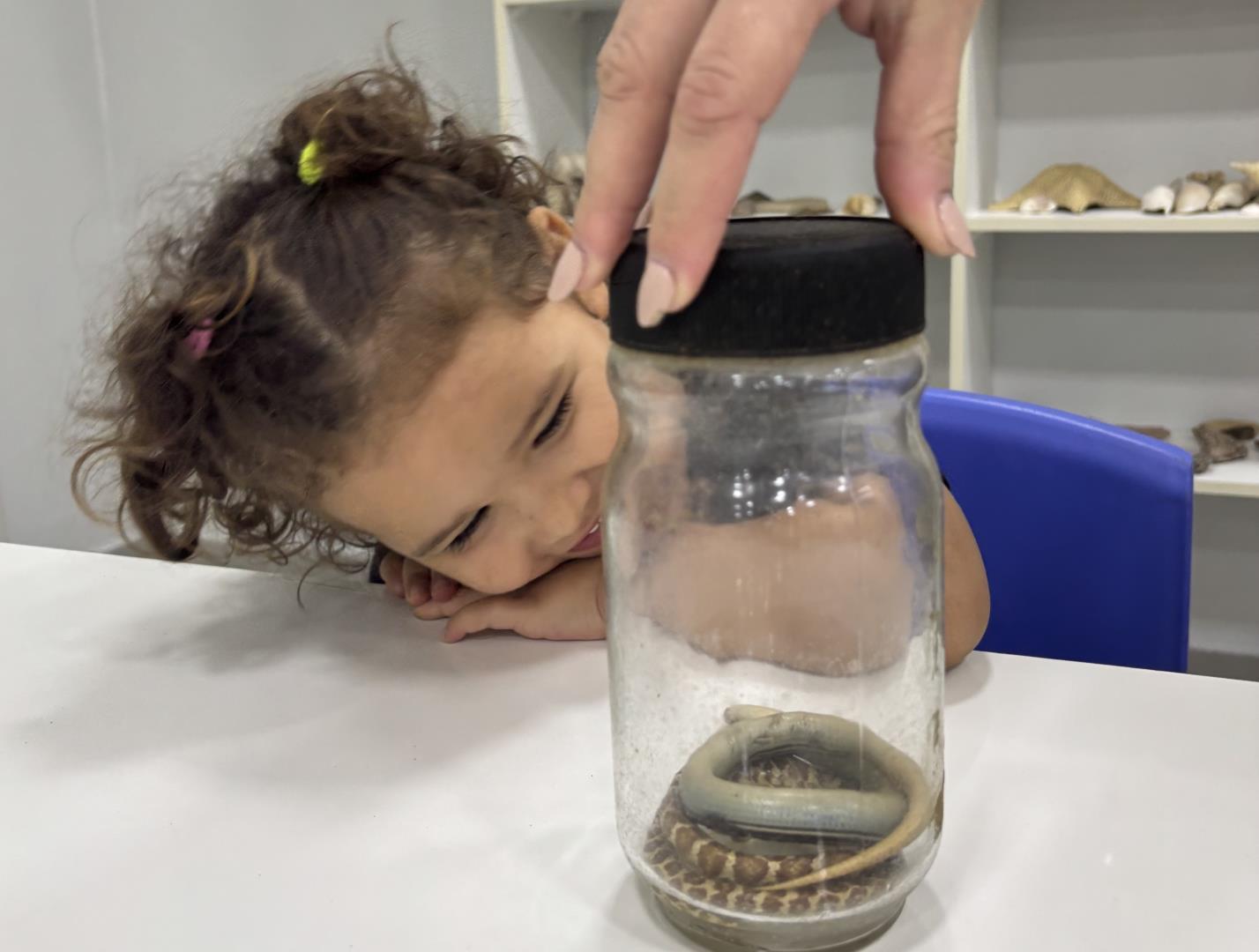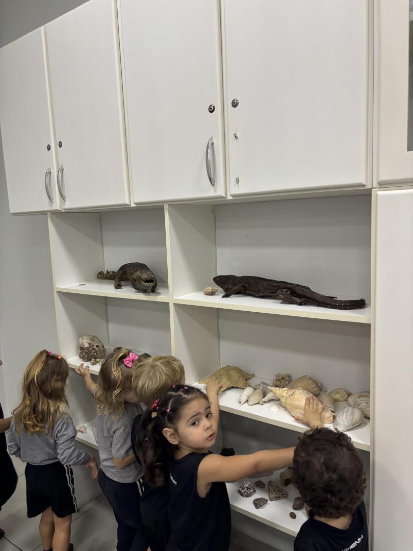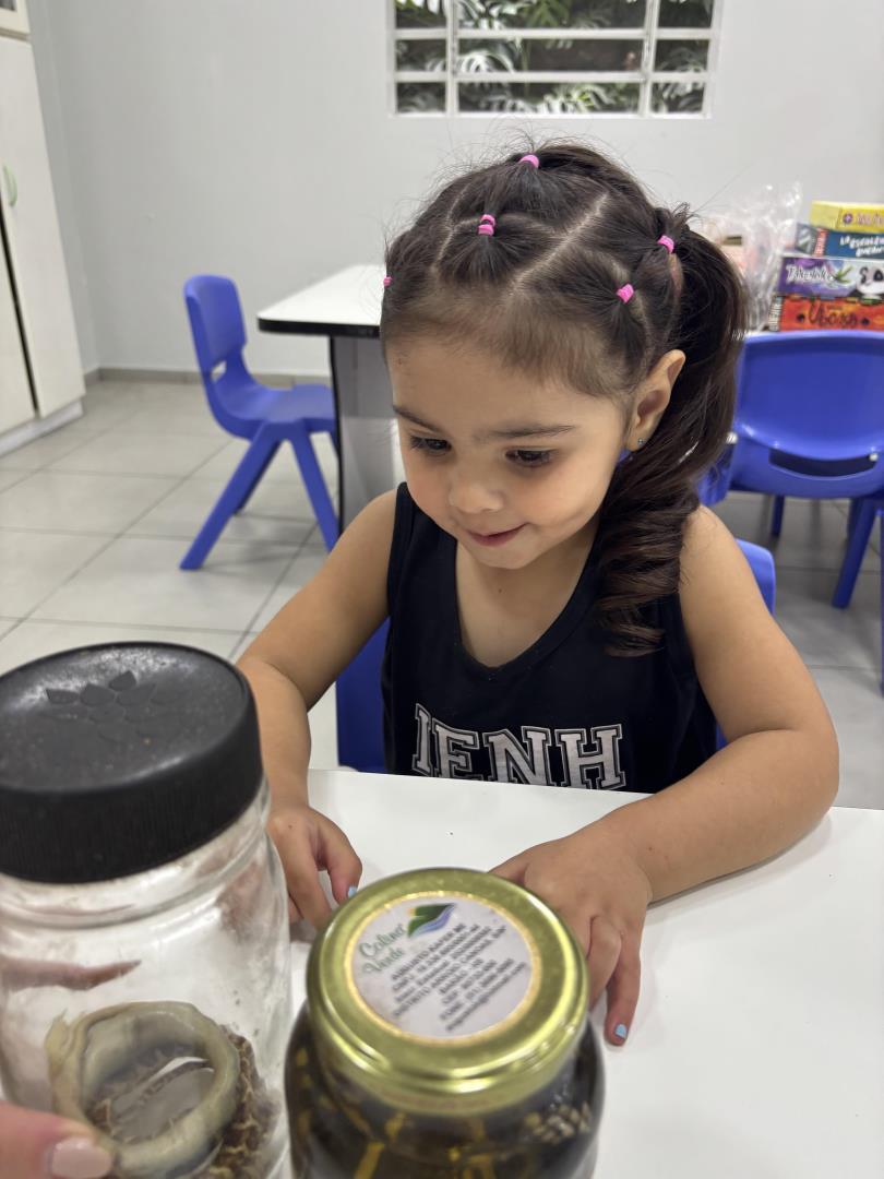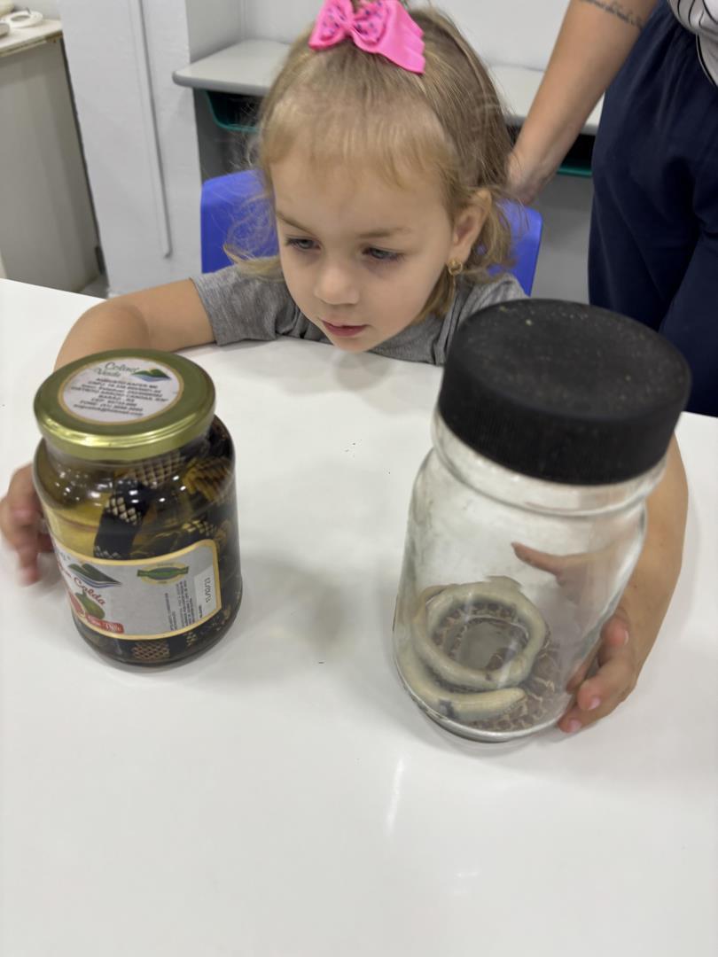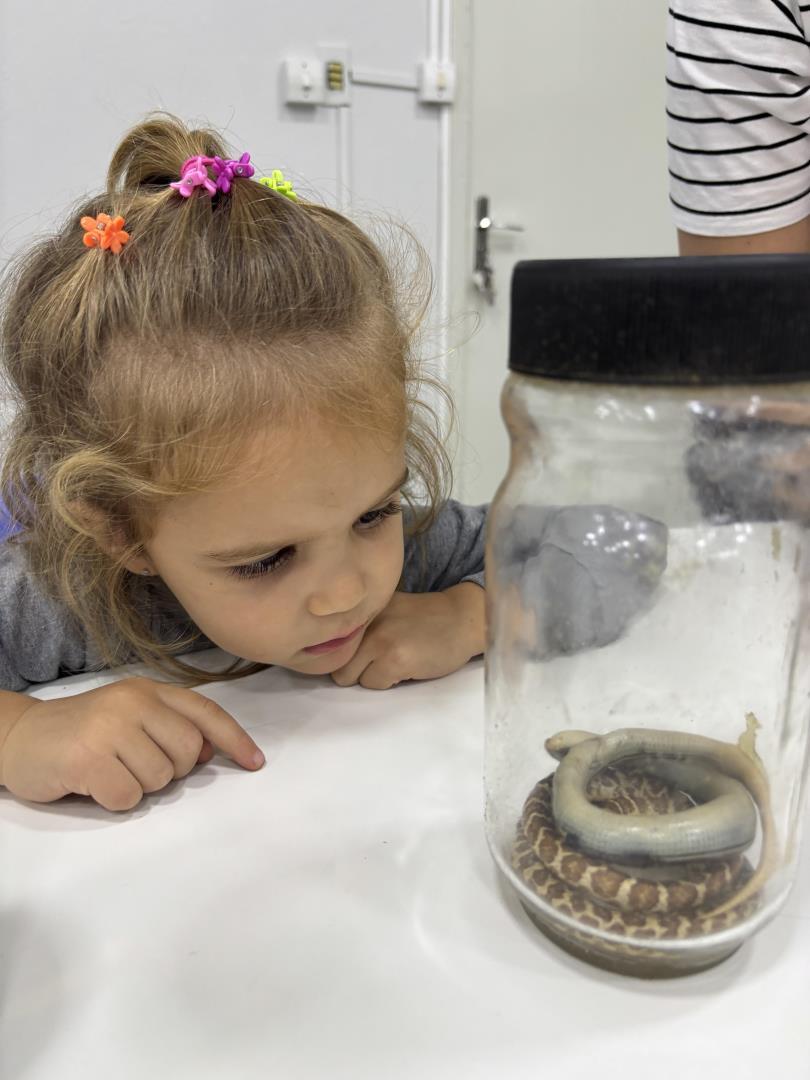 Durante a visita, os pequenos pesquisadores puderam observar de perto cobras conservadas em vidros, além de manipular animais empalhados, sentindo a textura, observando o tamanho, a dentição e as patas dos répteis. A vivência proporcionou um contato real e concreto com os objetos de estudo, enriquecendo o aprendizado de forma significativa.