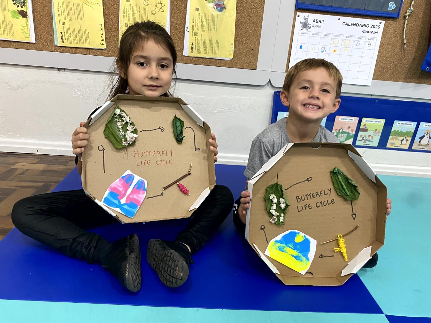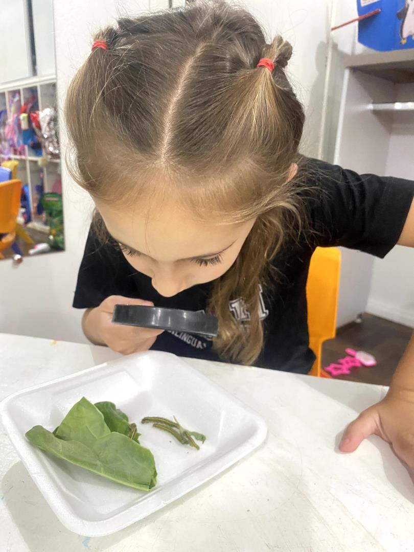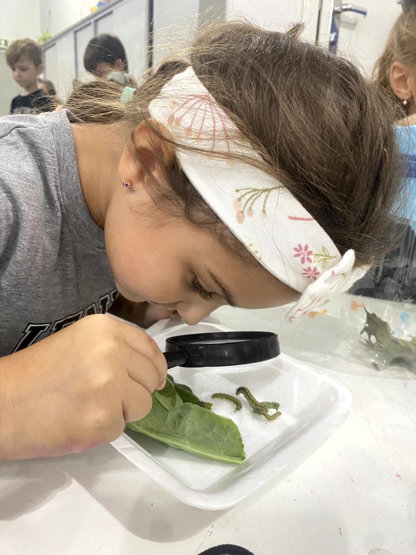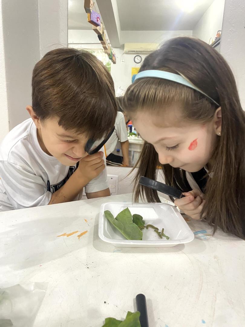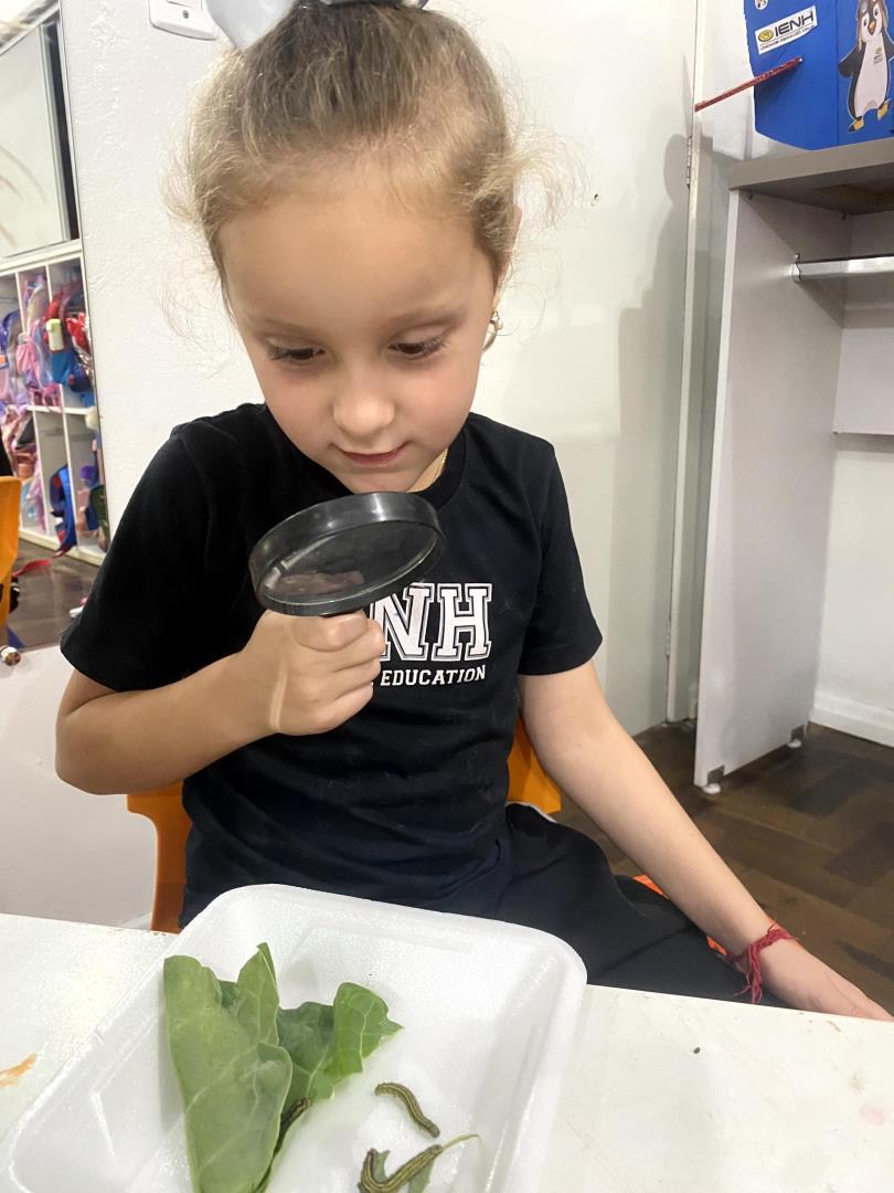 O aprendizado foi pautado pela observação direta. Equipados com lupas, os pequenos cientistas puderam examinar minuciosamente lagartas e casulos, transformando a sala de aula em um verdadeiro laboratório de biologia. Para dar significado teórico à experiência prática, a turma revisitou a história "The Very Hungry Caterpillar", conectando a literatura ao ciclo biológico observado. Esse processo culminou na aula de Learning Centers, onde os alunos confeccionaram representações artísticas de cada etapa da metamorfose, do ovo à borboleta, demonstrando domínio sobre o conceito de transformação e cuidado com a natureza.
