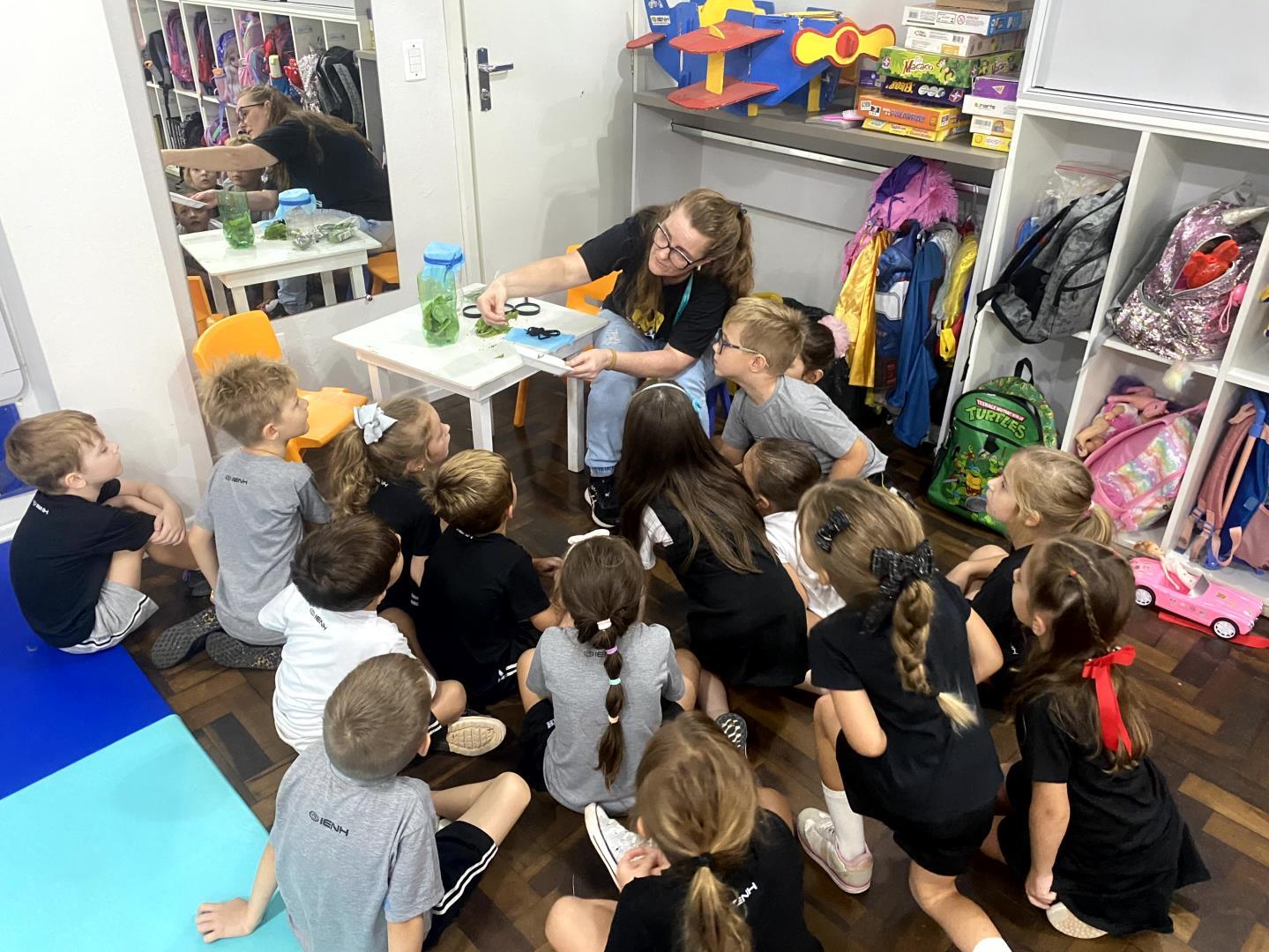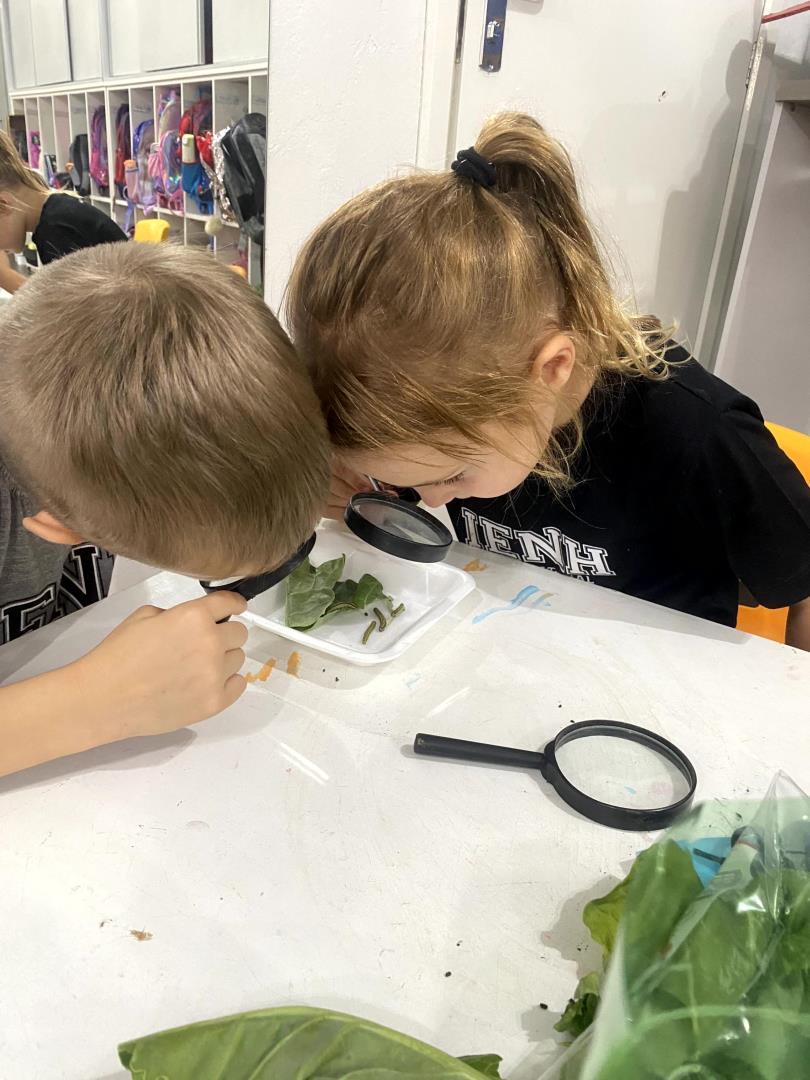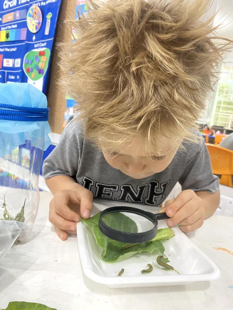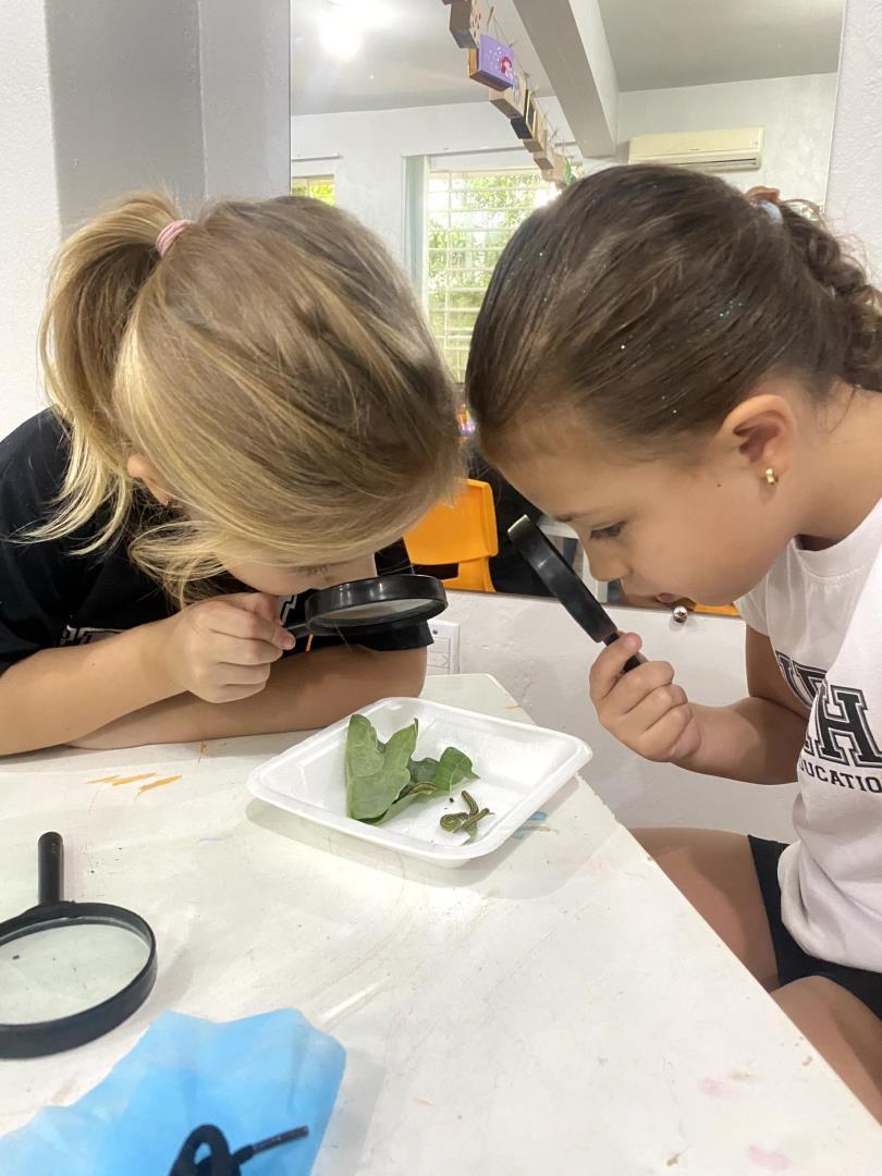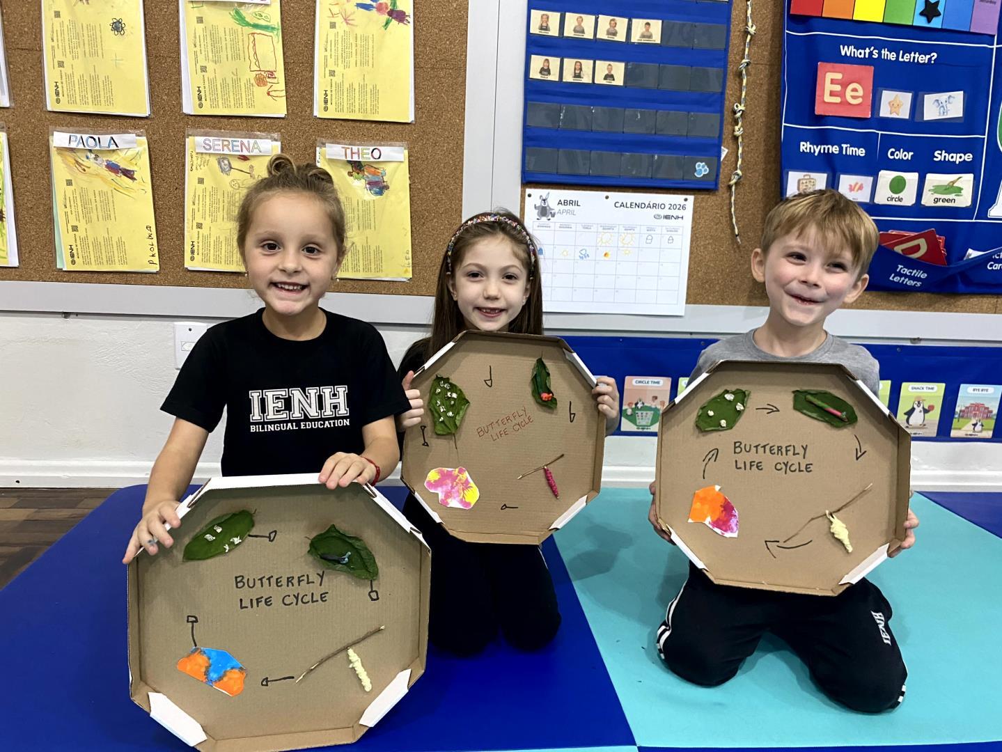 O aprendizado foi pautado pela observação direta. Equipados com lupas, os pequenos cientistas puderam examinar minuciosamente lagartas e casulos, transformando a sala de aula em um verdadeiro laboratório de biologia. Para dar significado teórico à experiência prática, a turma revisitou a história "The Very Hungry Caterpillar", conectando a literatura ao ciclo biológico observado. Esse processo culminou na aula de Learning Centers, onde os alunos confeccionaram representações artísticas de cada etapa da metamorfose, do ovo à borboleta, demonstrando domínio sobre o conceito de transformação e cuidado com a natureza.