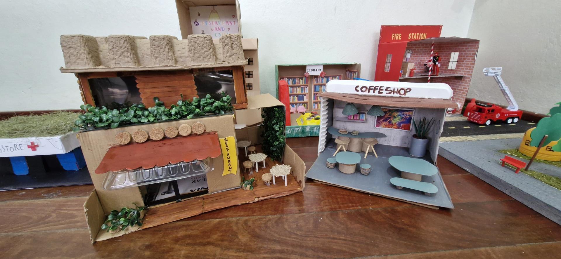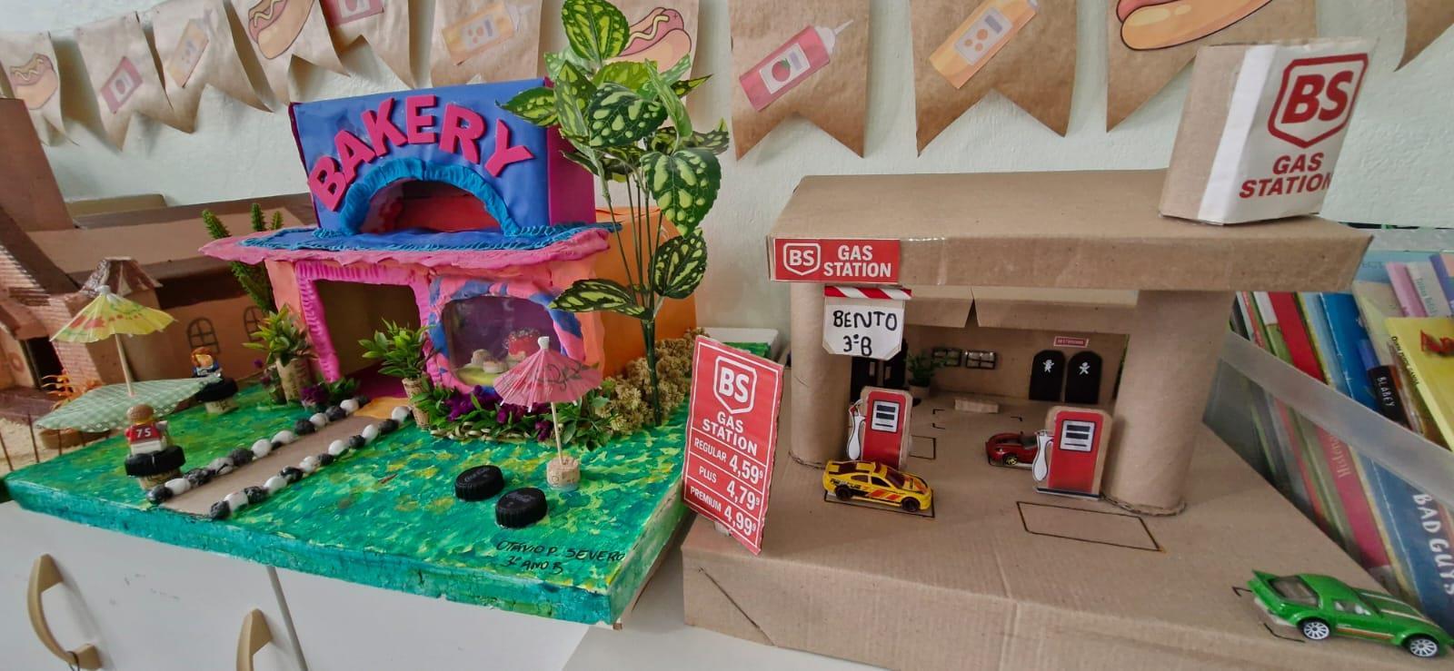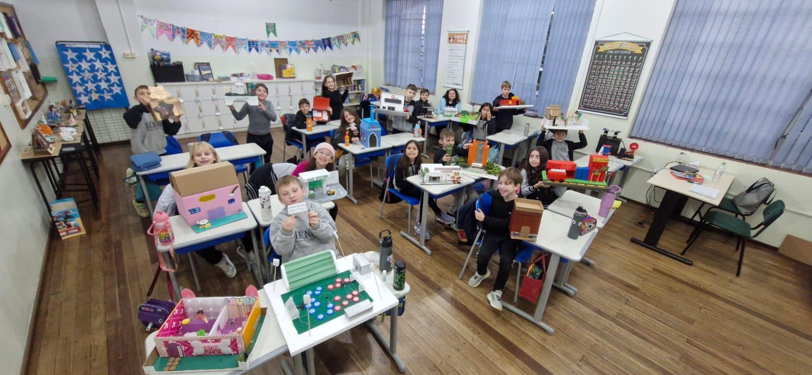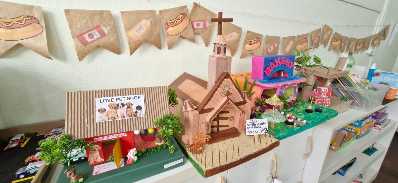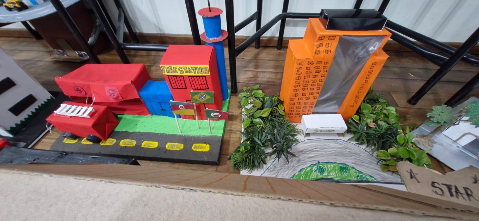 Para enriquecer o aprendizado, as turmas fizeram um city tour por Novo Hamburgo, visitando e observando diferentes locais. Em sala de aula, trabalharam o vocabulário em inglês, listaram lugares e sortearam quem faria cada maquete. Com apoio das famílias, cada estudante construiu um modelo criativo, apresentando para a turma o nome do local, as funções que ele tem, os profissionais que lá trabalham, os materiais usados na construção e curiosidades descobertas.