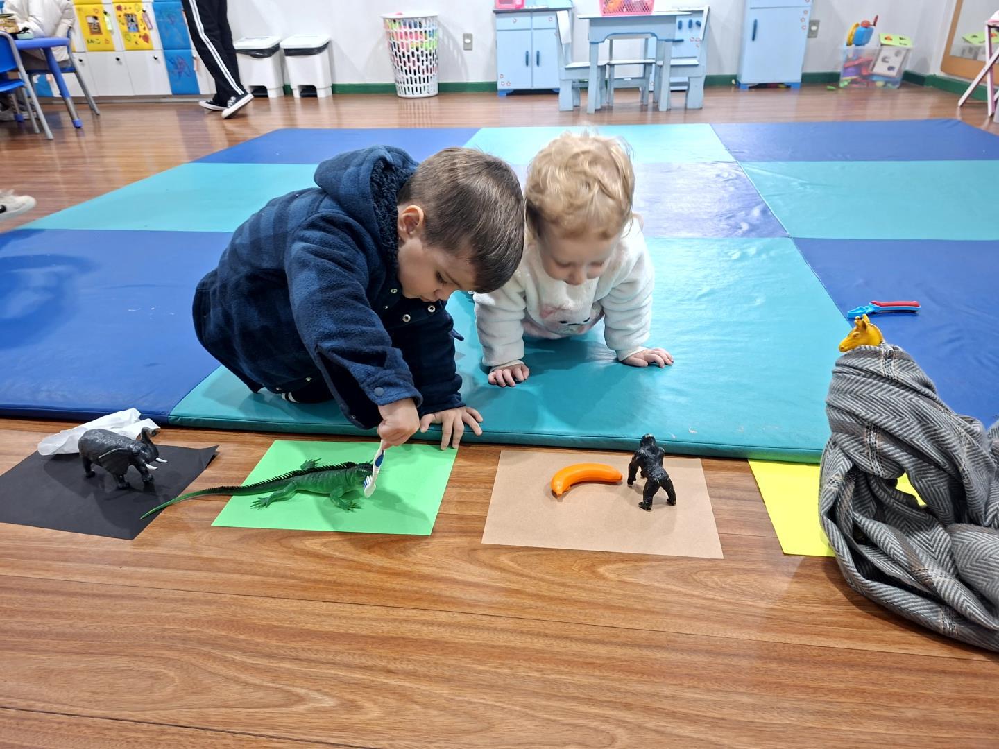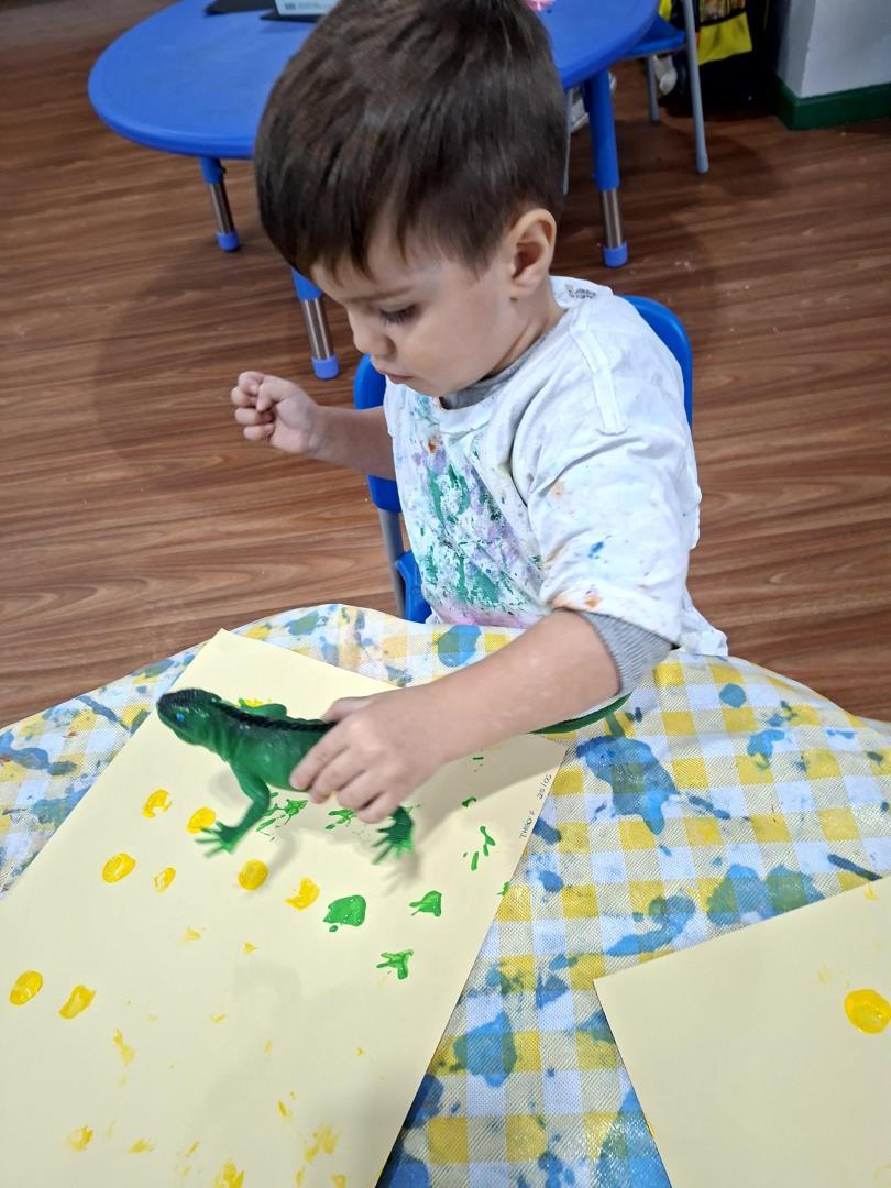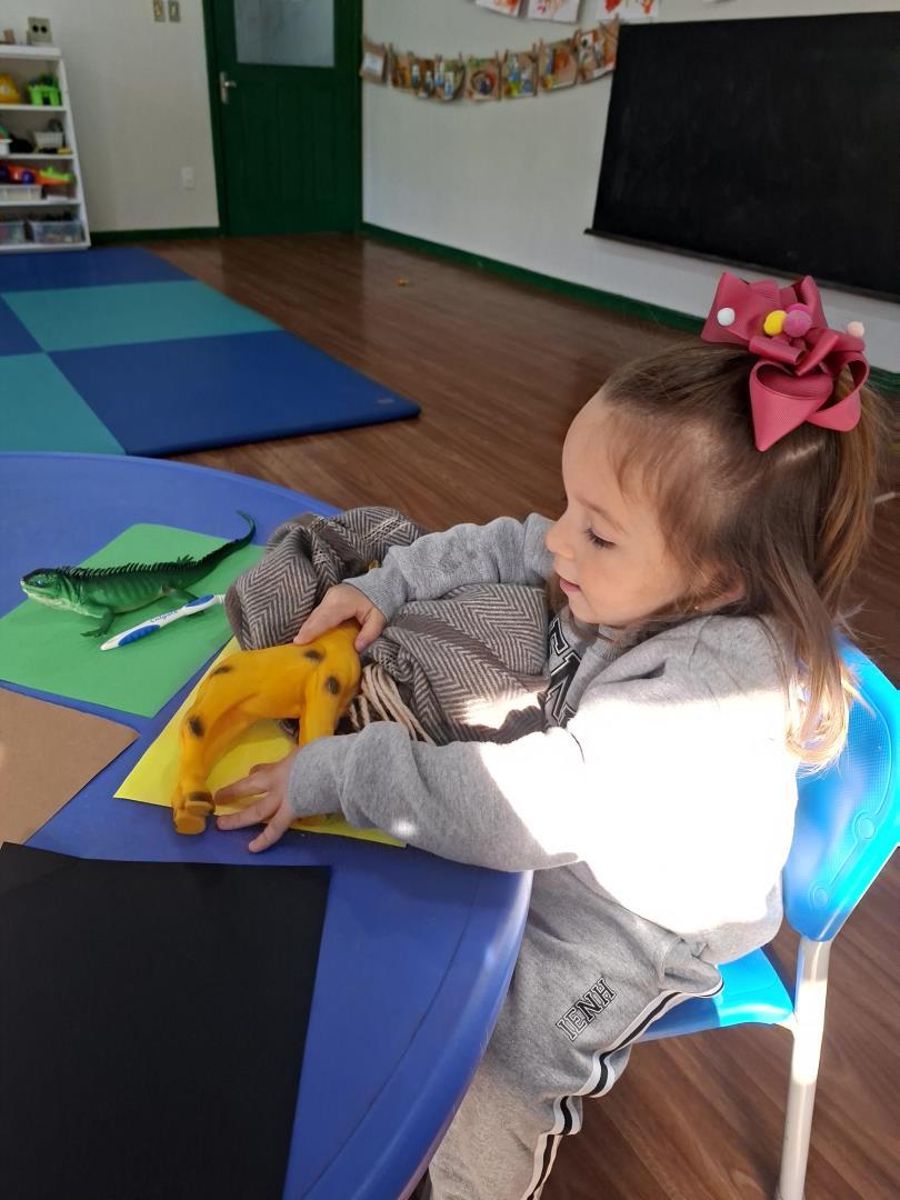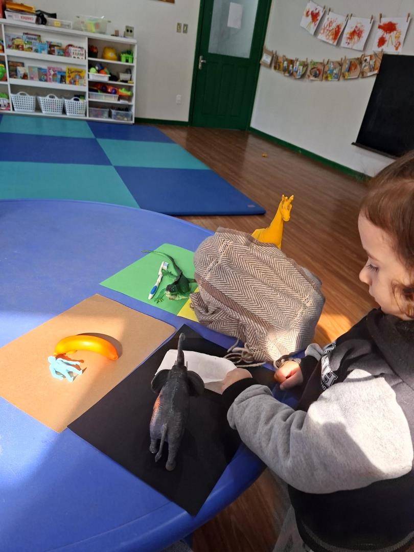 Em seguida, a turma enfrentou o desafio de encontrar os animais (giraffe, crocodile, monkey e elephant) na caixa de brinquedos, relembrar a narrativa e parear cada animal ao seu objeto característico. Para finalizar, produziram um registro gráfico molhando as patas dos brinquedos em tintas coloridas e carimbando uma grande folha A3, unindo criatividade, cor e memória em uma atividade divertida e significativa.