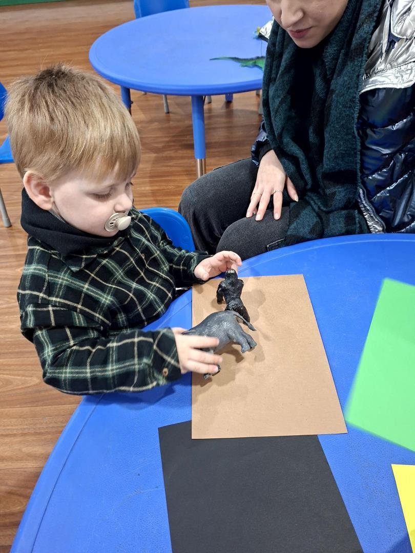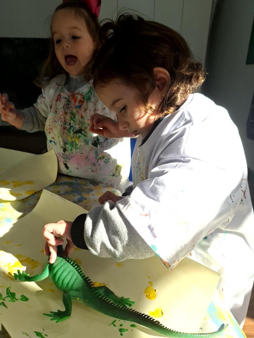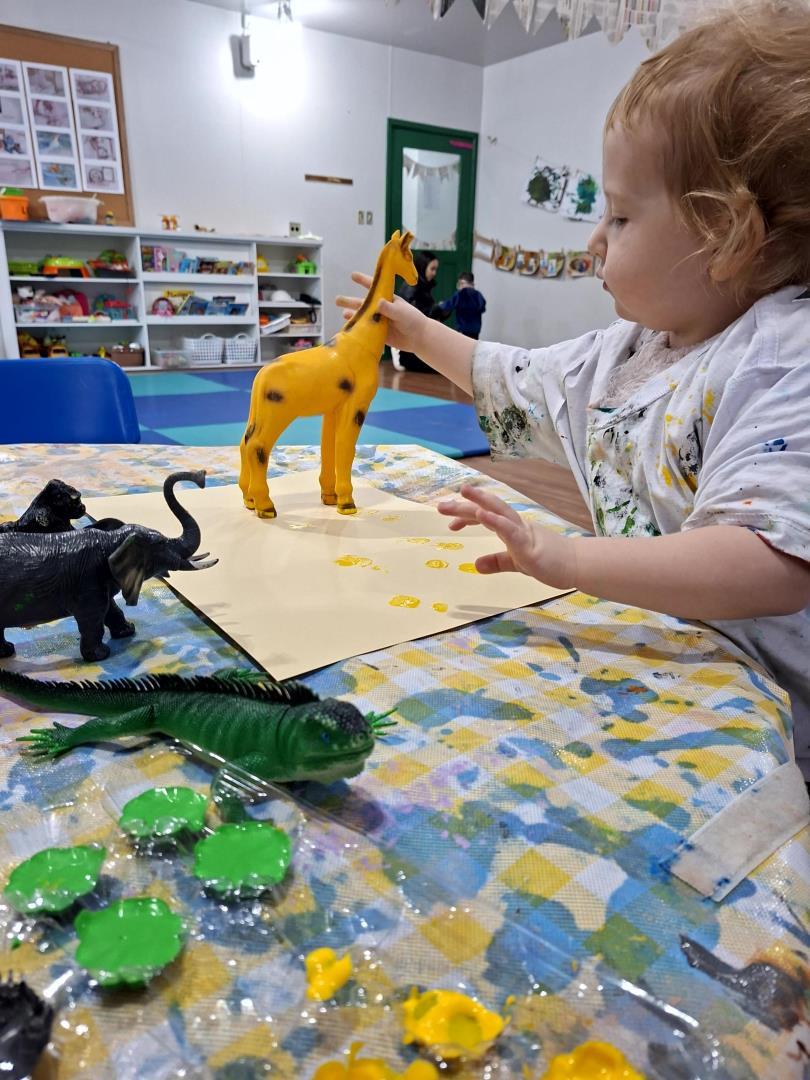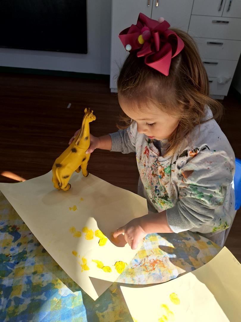 Em seguida, a turma enfrentou o desafio de encontrar os animais (giraffe, crocodile, monkey e elephant) na caixa de brinquedos, relembrar a narrativa e parear cada animal ao seu objeto característico. Para finalizar, produziram um registro gráfico molhando as patas dos brinquedos em tintas coloridas e carimbando uma grande folha A3, unindo criatividade, cor e memória em uma atividade divertida e significativa.