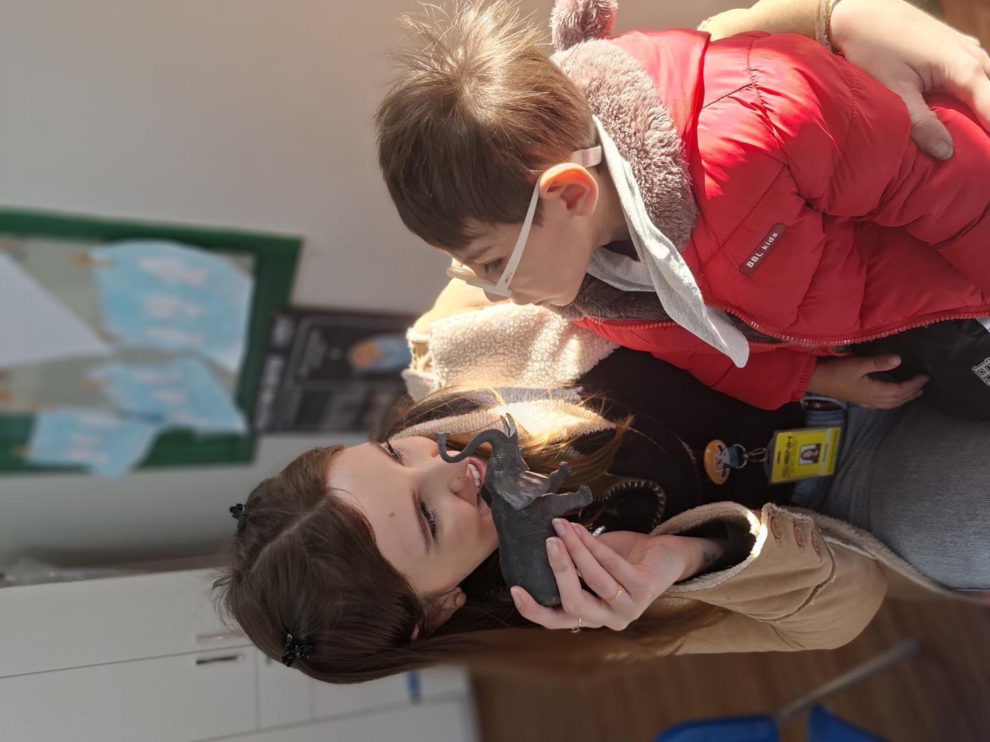 Na proposta conduzida pela teacher Amanda Escobar, as crianças ouviram a história “The Box”, de Martha Lightfoot, em inglês e em formato de varal, enquanto objetos relacionados aos animais eram retirados da Surprise Box.