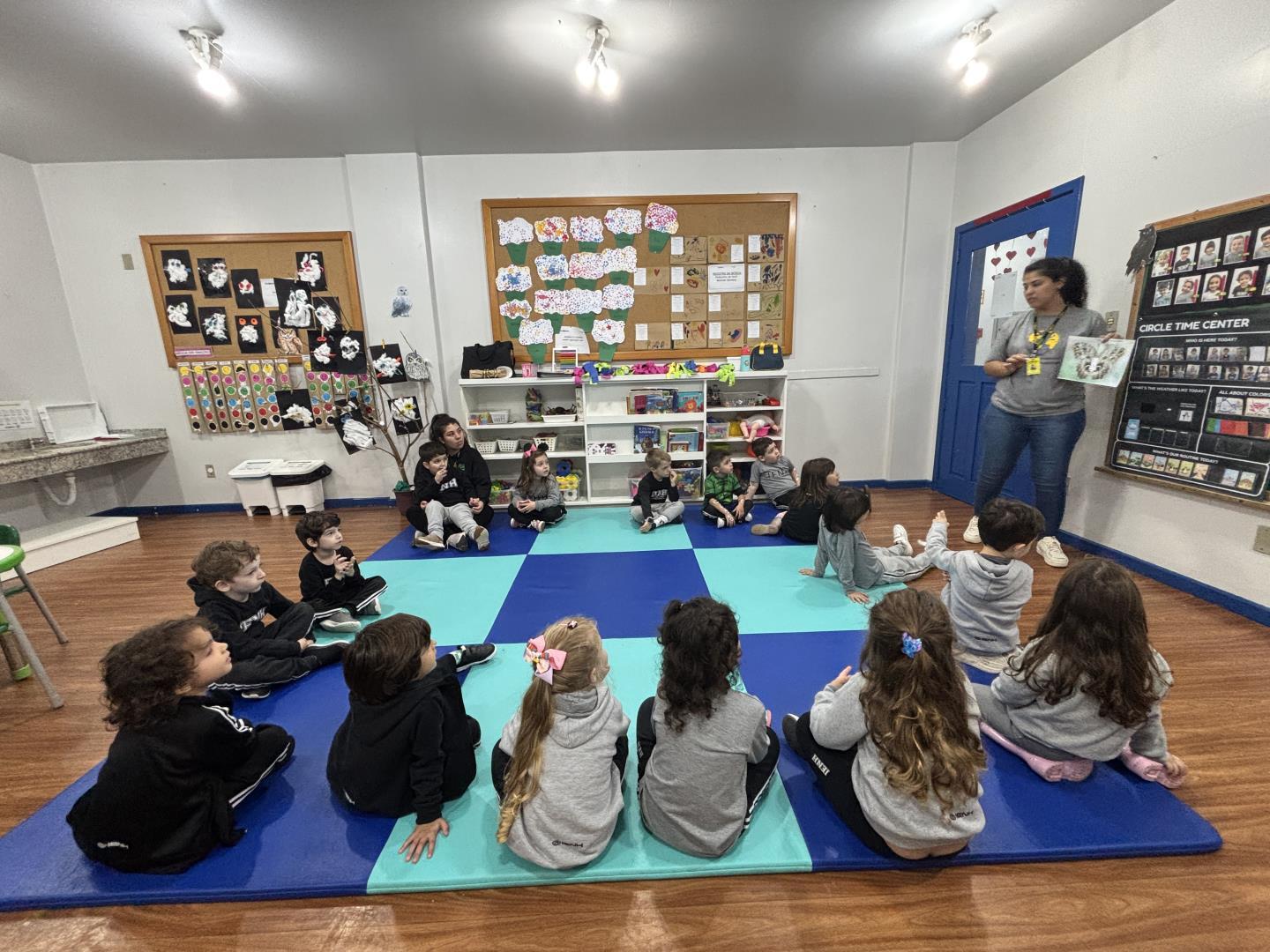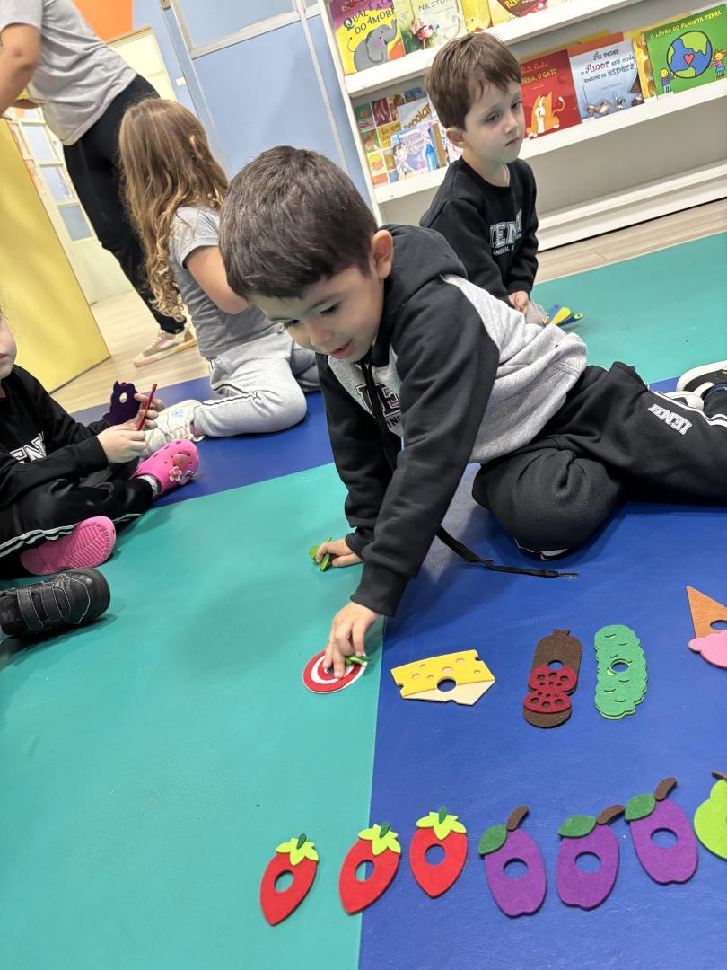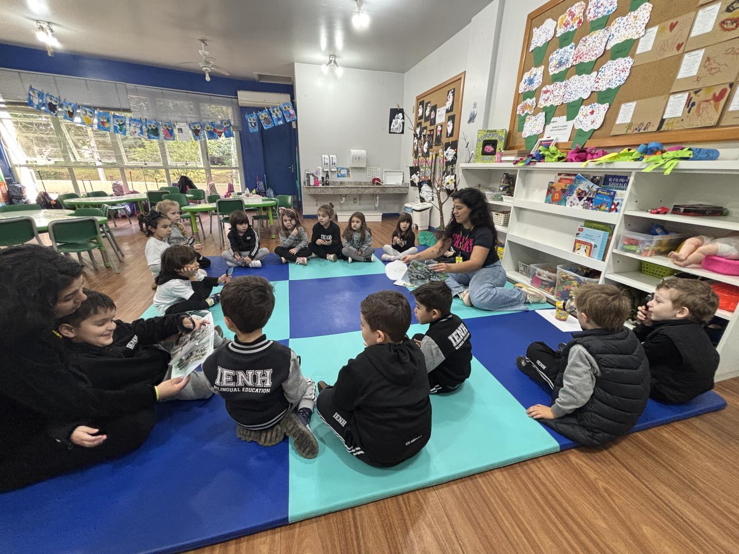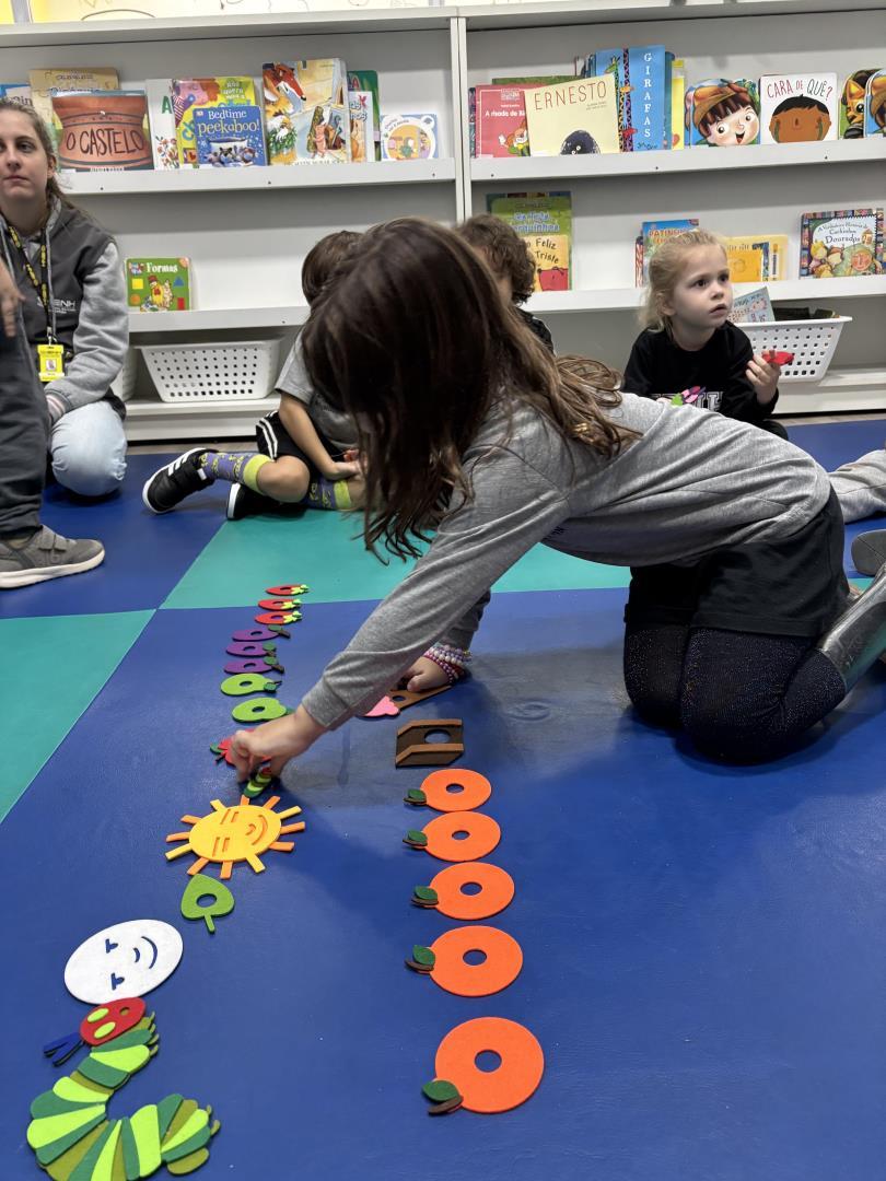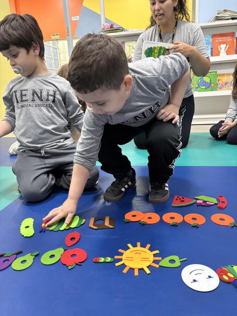 Como abertura para esse universo de descobertas, a turma explorou de forma colaborativa, na biblioteca, a história “Uma lagarta muito comilona”, de Eric Carle. Durante a narrativa, cada criança contribuiu com elementos da história, observando com atenção a sequência dos acontecimentos.