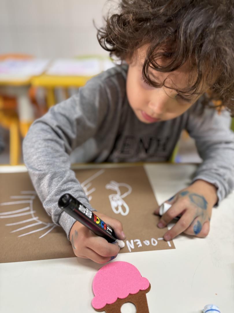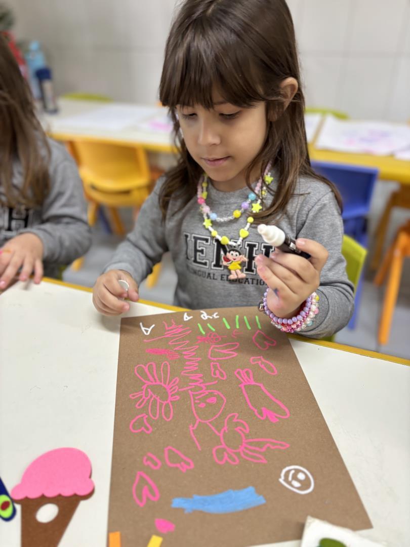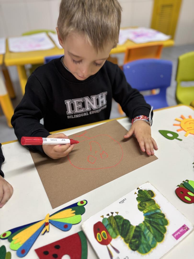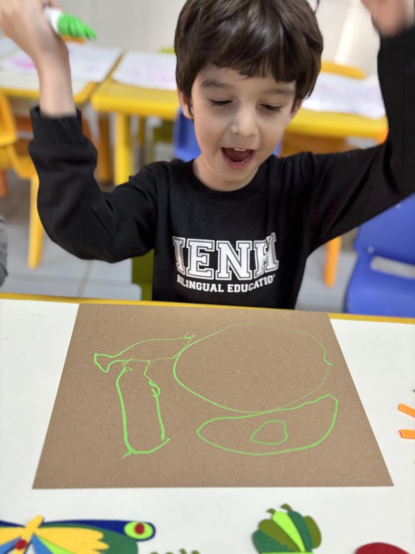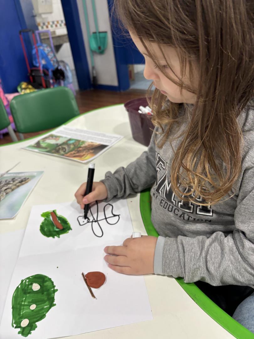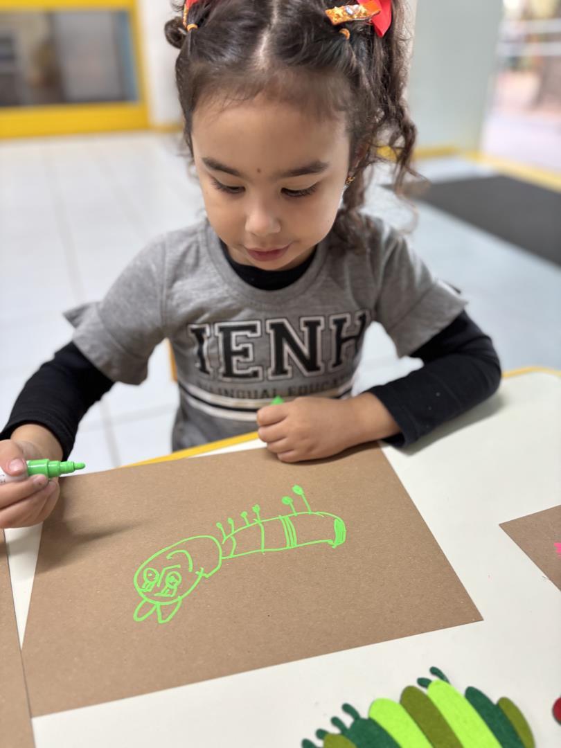 A atividade também abriu espaço para diálogos sobre preferências alimentares e reflexões sobre o que precisamos para crescer de forma saudável, assim como a lagarta da história. Ao final, os pequenos realizaram um registro gráfico com giz líquido, expressando suas observações.