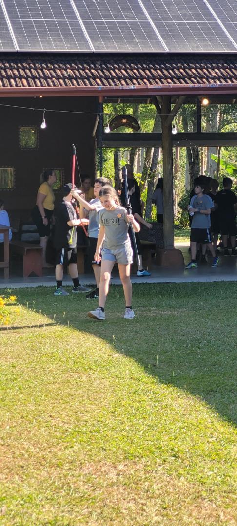 Entre as atividades desenvolvidas estiveram cooking, arts and crafts, Egyptian games e frisbee throwing, sempre mediadas em língua inglesa e com foco na participação ativa e no aprendizado significativo. Além disso, nos momentos de tempo livre, as crianças puderam explorar o espaço verde, brincar, relaxar nas redes, praticar arco e flecha e desfrutar de um lanche especial, mantendo o uso espontâneo e natural do inglês.