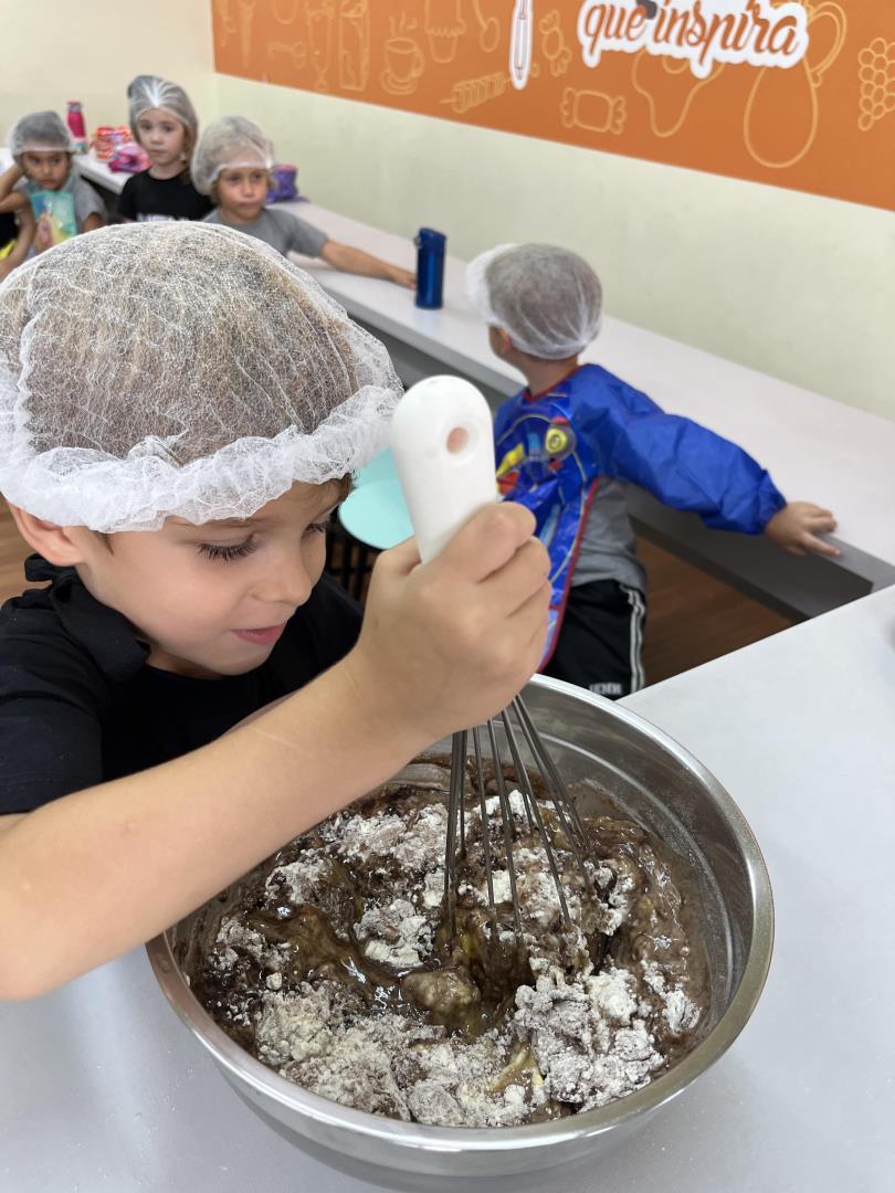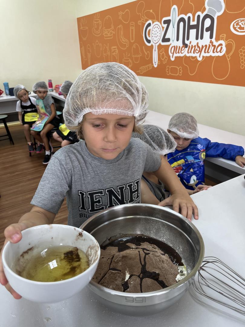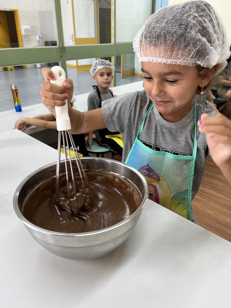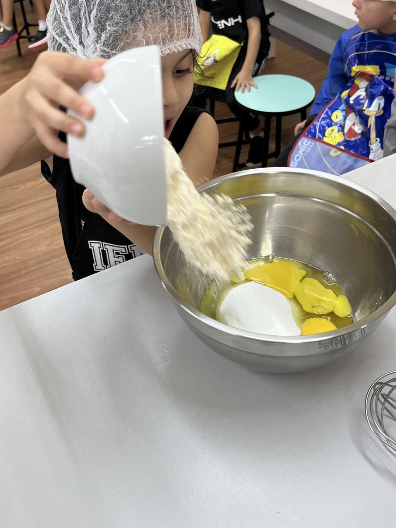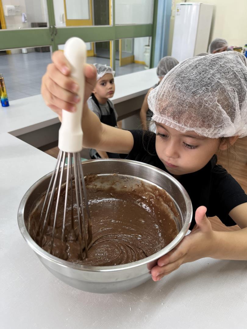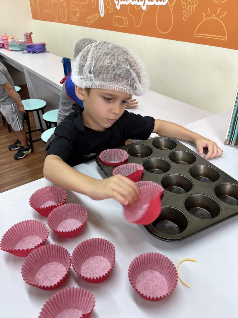 Na sequência, os estudantes participaram de uma Cooking Class, conduzida pela professora Carolini Perini, na qual prepararam cupcakes. Envolvidas em todas as etapas da receita, as crianças vivenciaram a transformação dos alimentos e desenvolveram noções iniciais de quantidade e medida ao manipular os ingredientes.