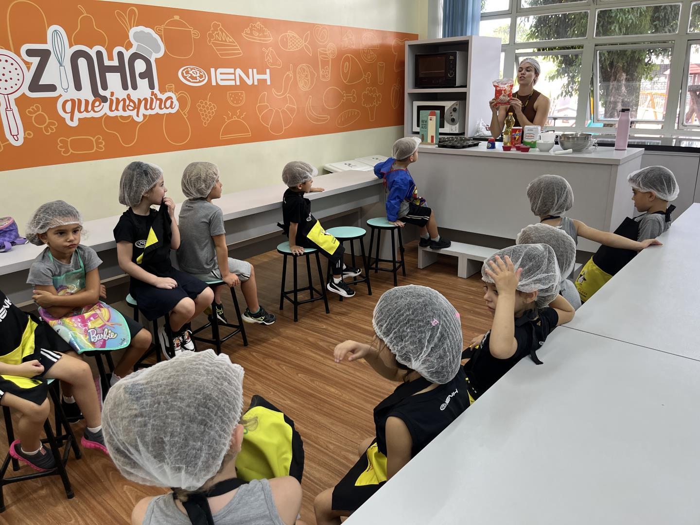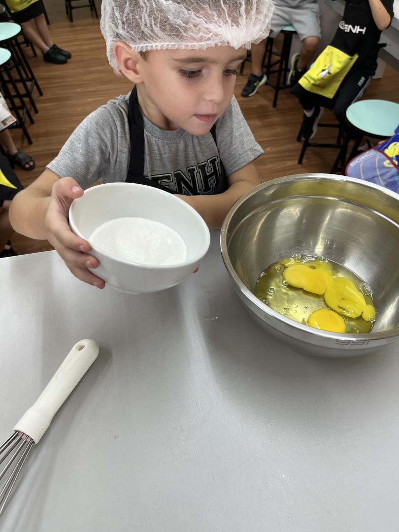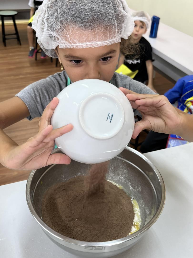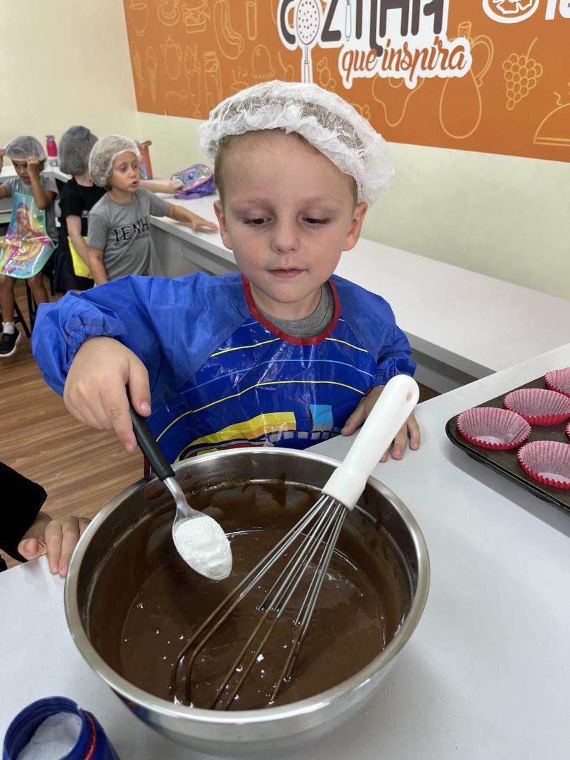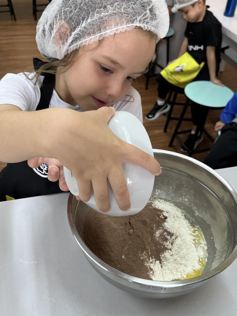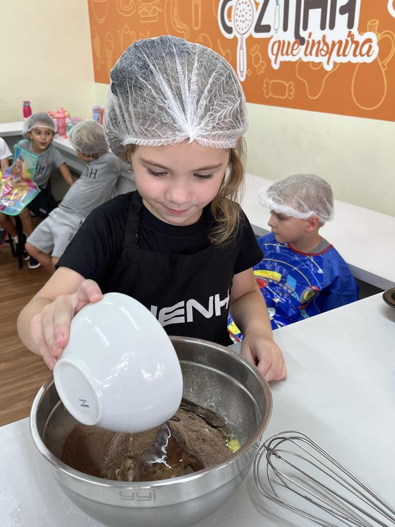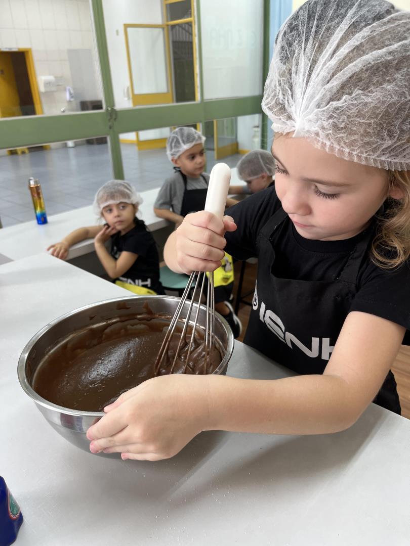 Na sequência, os estudantes participaram de uma Cooking Class, conduzida pela professora Carolini Perini, na qual prepararam cupcakes. Envolvidas em todas as etapas da receita, as crianças vivenciaram a transformação dos alimentos e desenvolveram noções iniciais de quantidade e medida ao manipular os ingredientes.