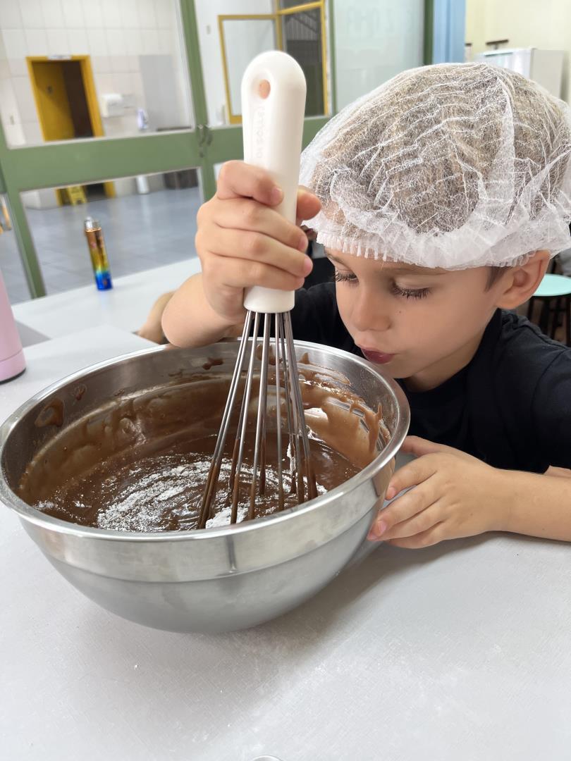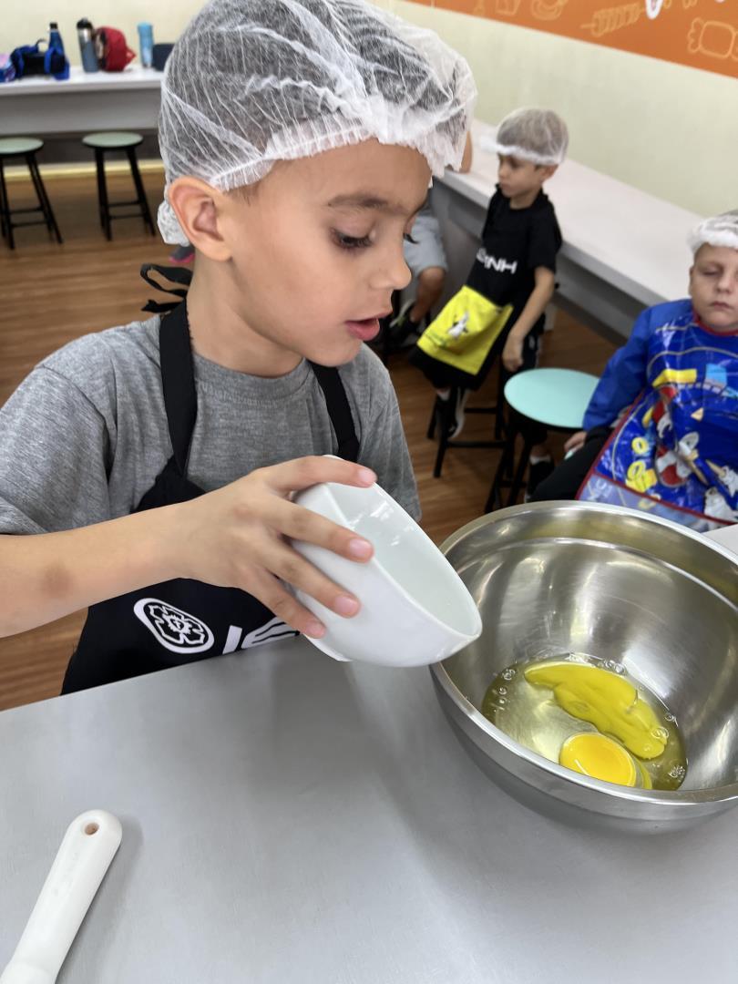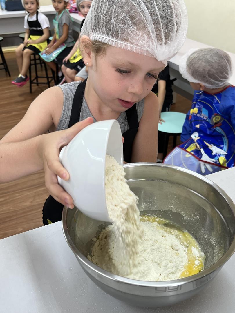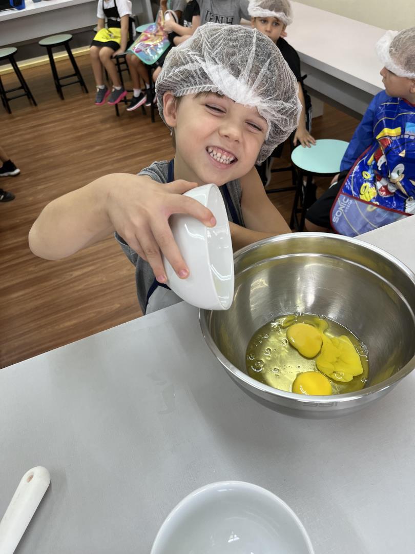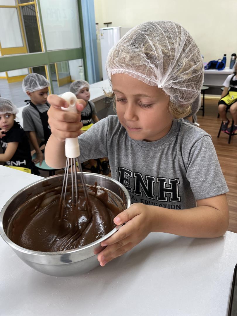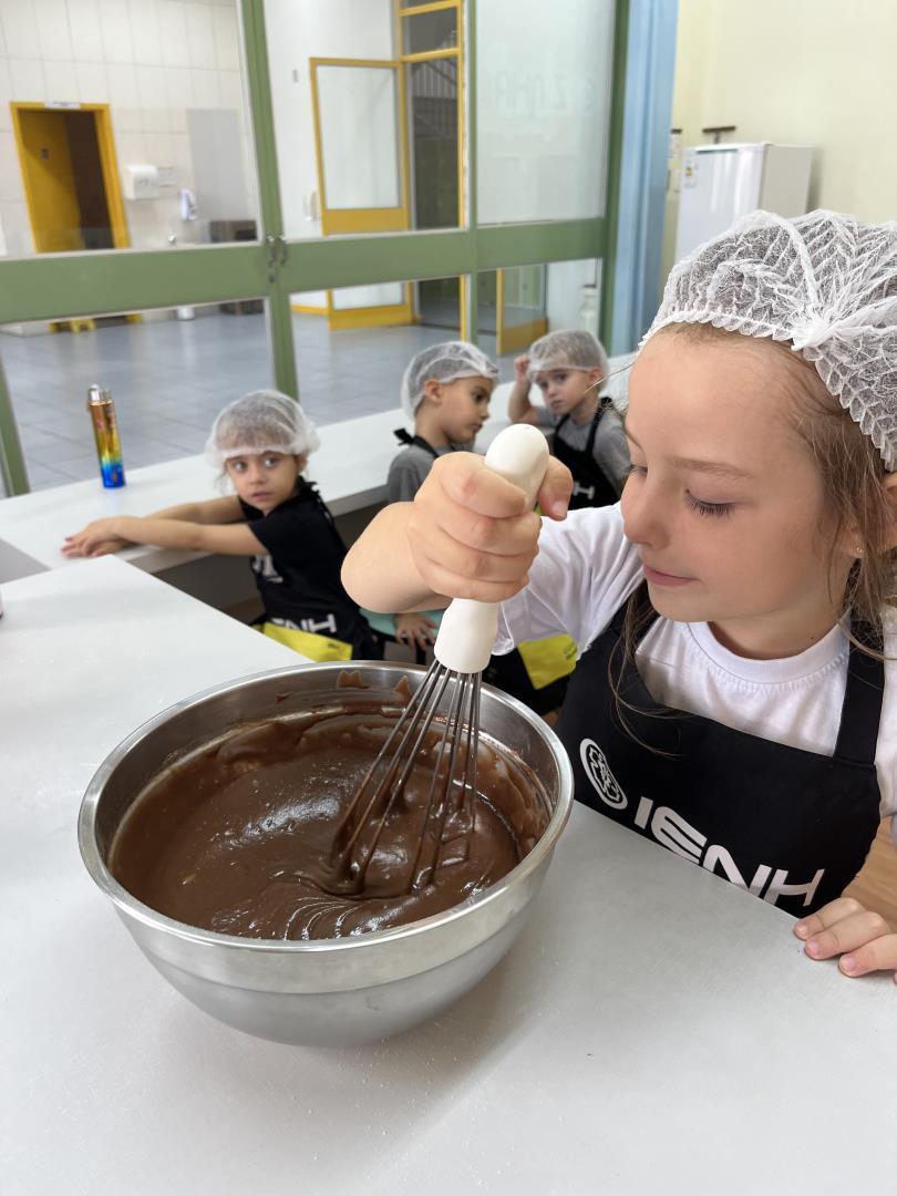 Na sequência, os estudantes participaram de uma Cooking Class, conduzida pela professora Carolini Perini, na qual prepararam cupcakes. Envolvidas em todas as etapas da receita, as crianças vivenciaram a transformação dos alimentos e desenvolveram noções iniciais de quantidade e medida ao manipular os ingredientes.