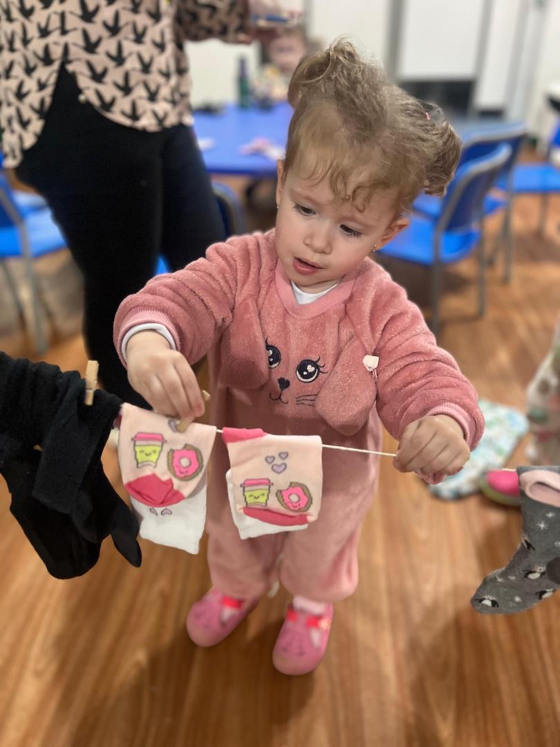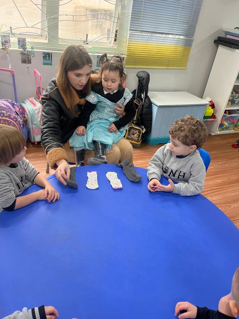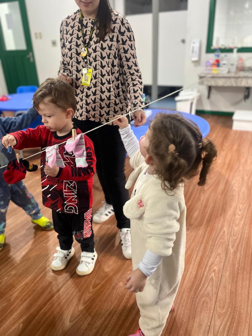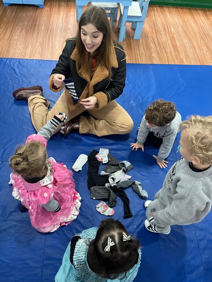 A atividade teve duas etapas. Na primeira, as crianças levaram para a escola pares de meias dos membros da família. O material foi utilizado em dinâmicas que estimularam a motricidade fina, o raciocínio lógico e a classificação por tamanho, em momentos conduzidos nas duas línguas de instrução, português e inglês.