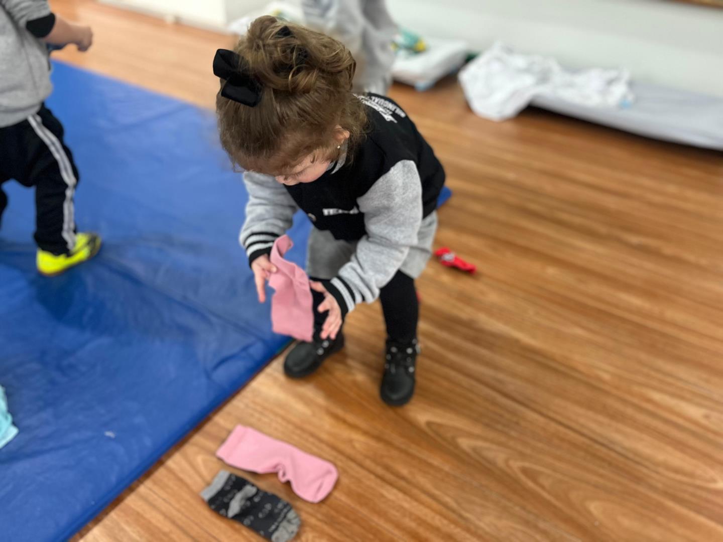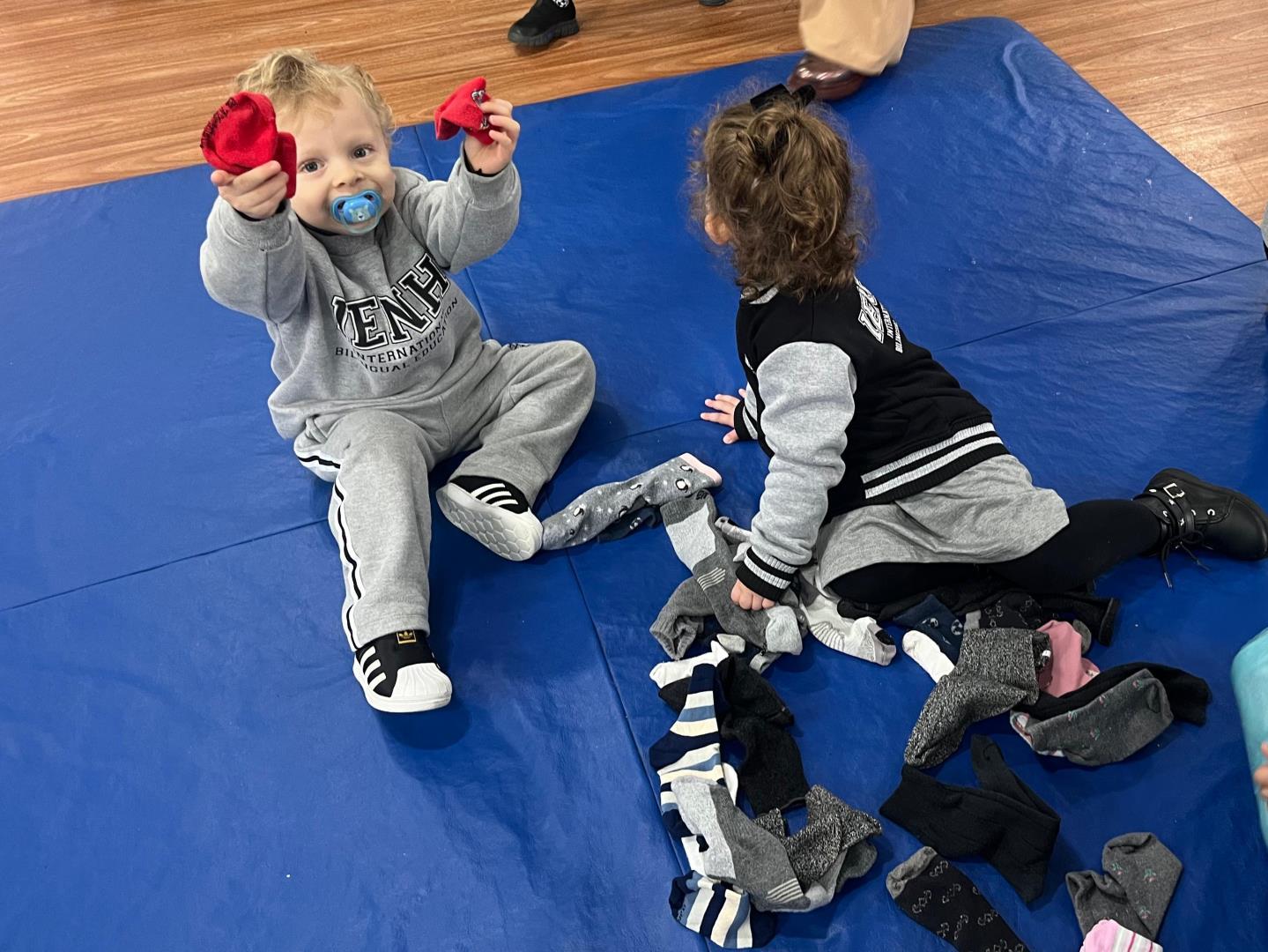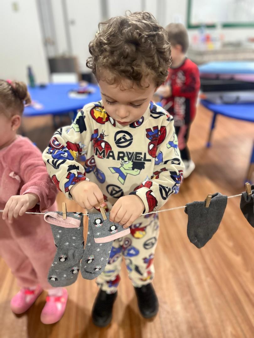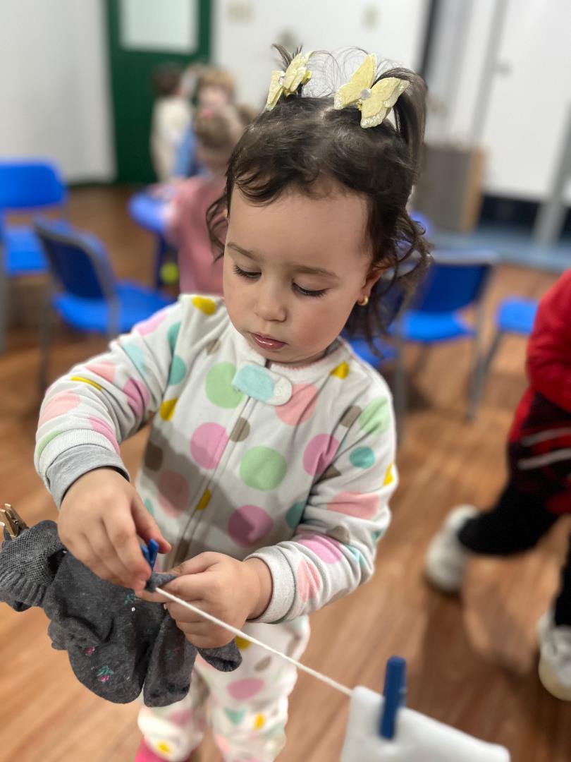 A atividade teve duas etapas. Na primeira, as crianças levaram para a escola pares de meias dos membros da família. O material foi utilizado em dinâmicas que estimularam a motricidade fina, o raciocínio lógico e a classificação por tamanho, em momentos conduzidos nas duas línguas de instrução, português e inglês.