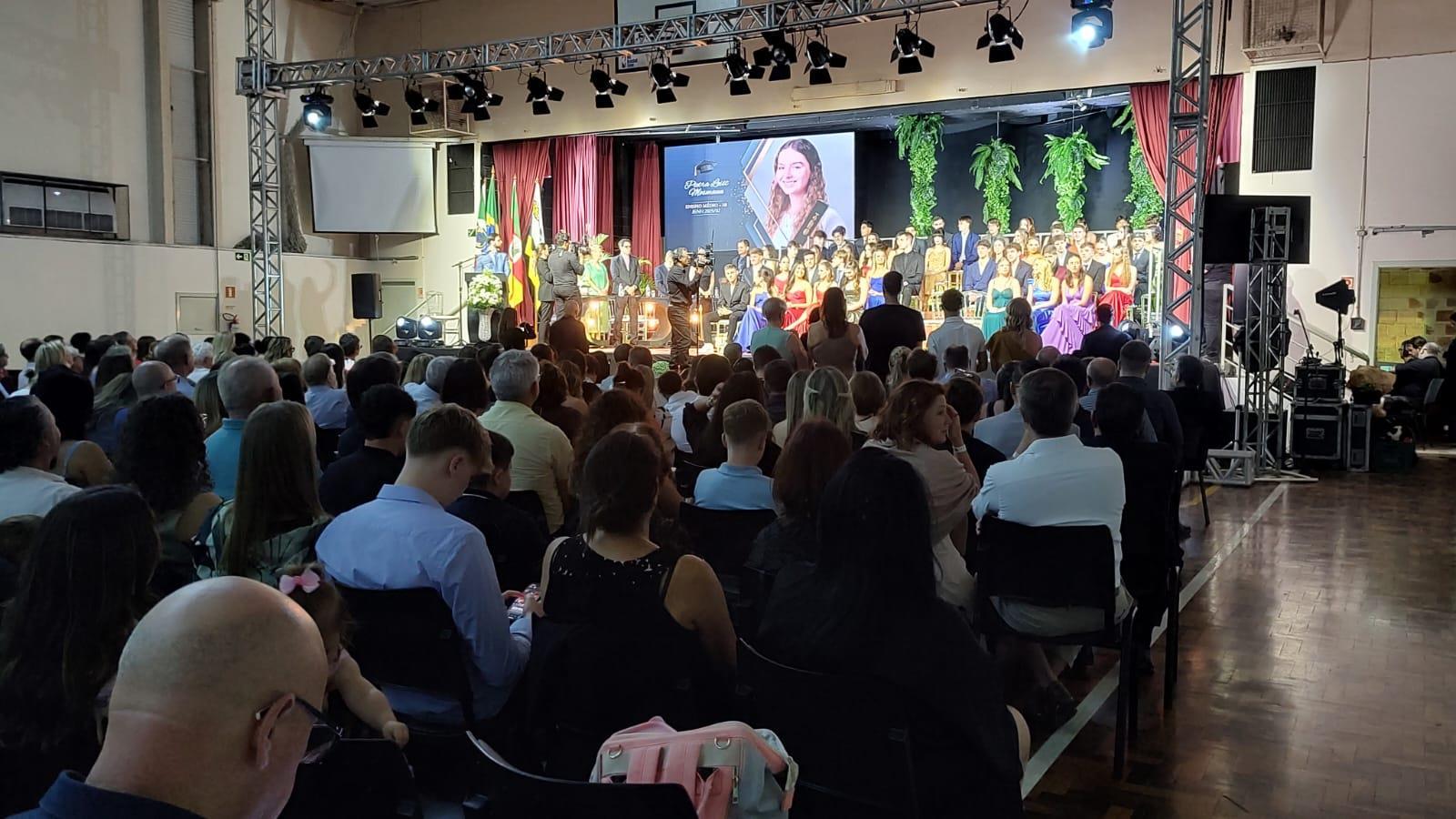 Após a introdução dos formandos e a execução do Hino Nacional, a formanda Manuela Schmitz Baum realizou a leitura do juramento, reafirmando valores como ética, honestidade, sustentabilidade e compromisso com a vida.