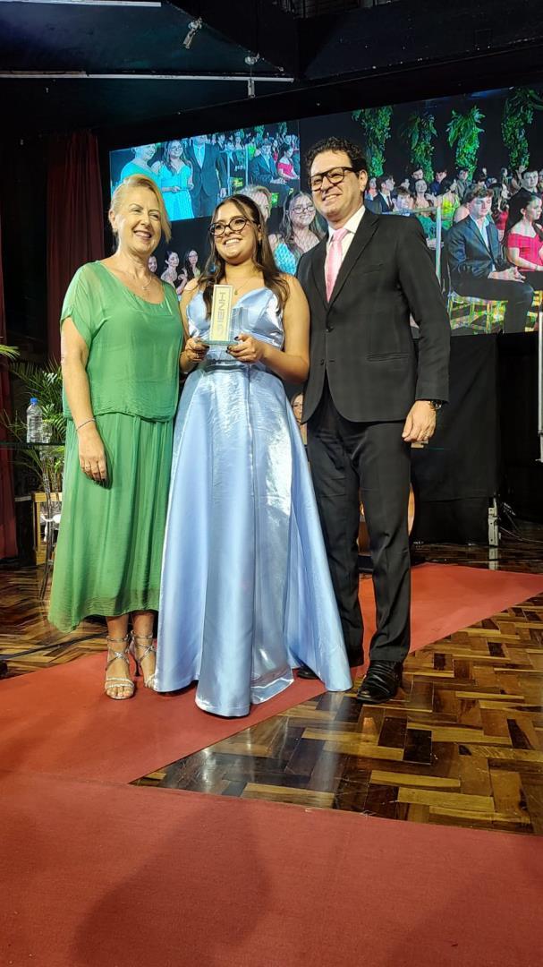 O momento de premiação reconheceu o melhor desempenho escolar de cada turma. Pela turma 3A, a aluna Sauany Bonalume recebeu a homenagem, enquanto pela turma 3B o destaque foi para João Guilherme Vaucher Sefrin.