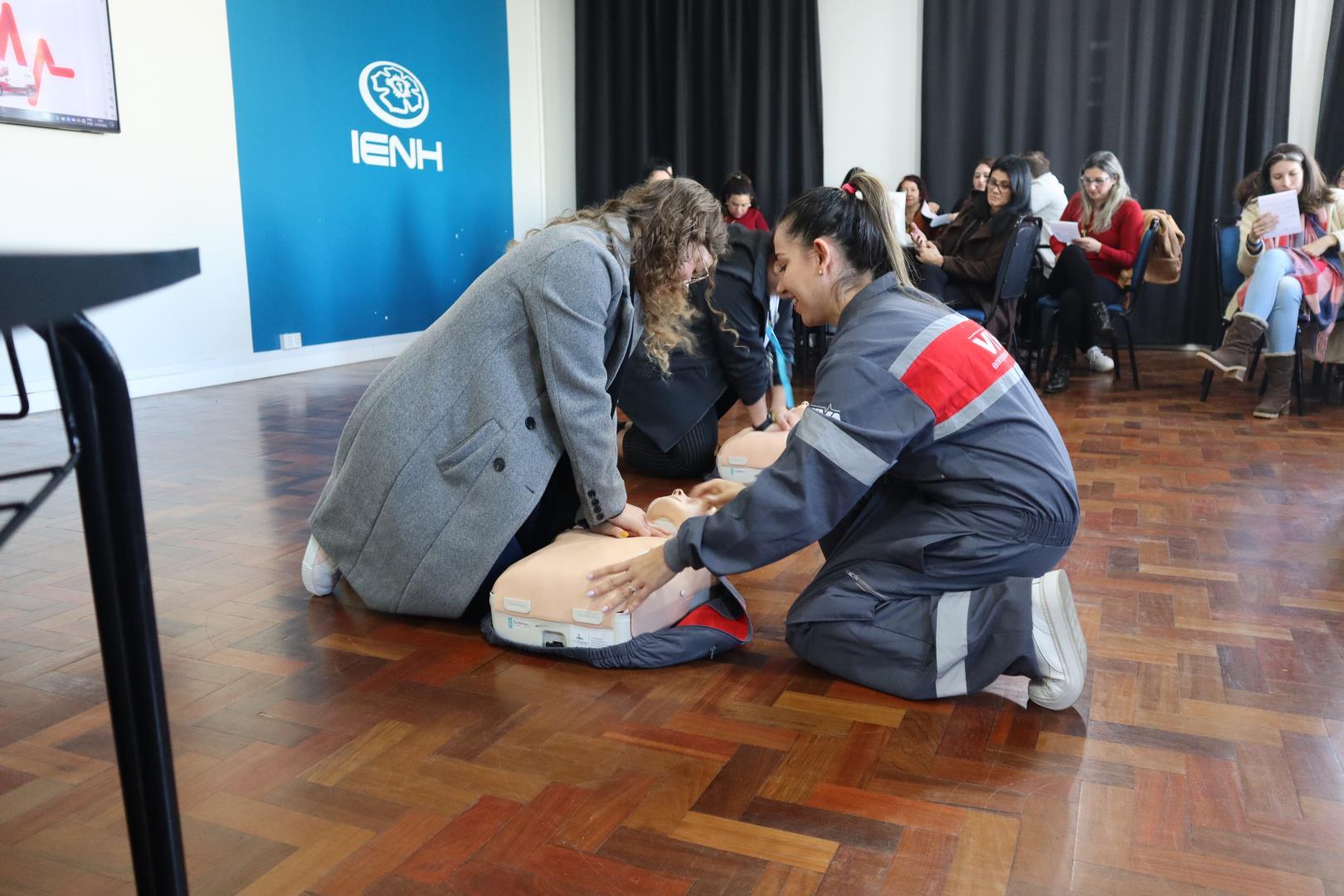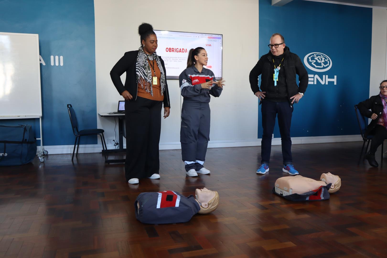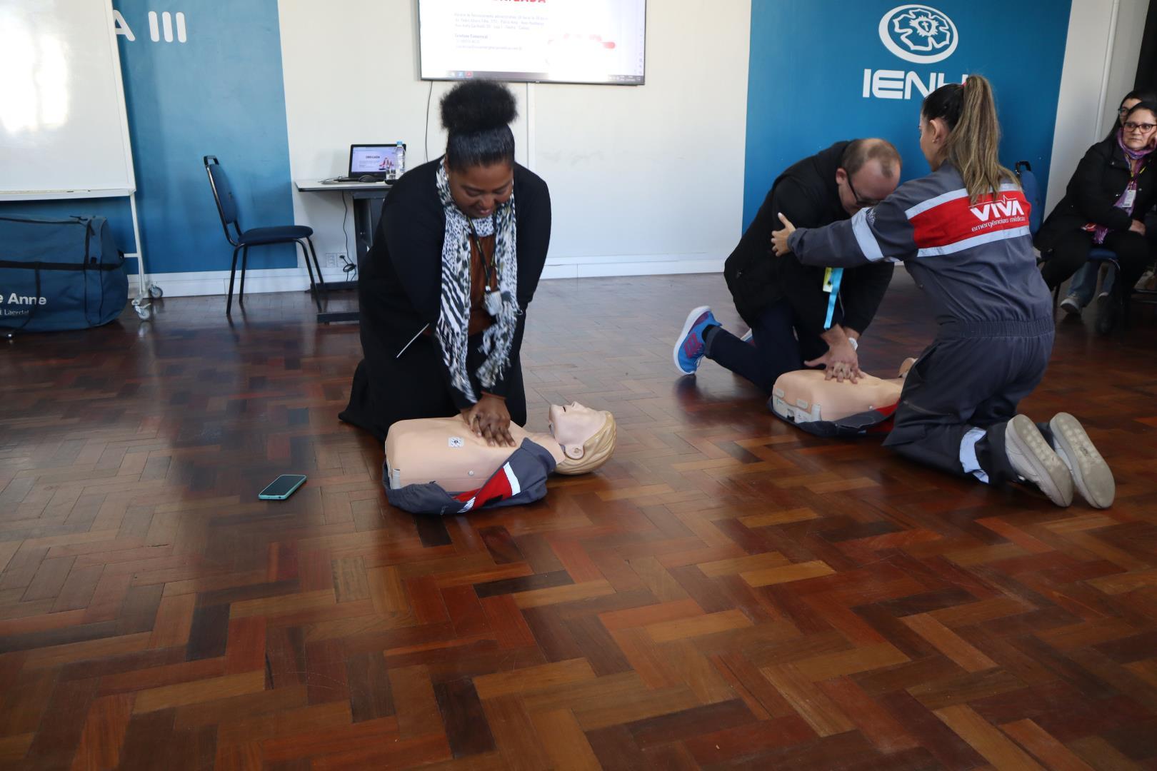 Encerrando a parte formativa do evento, os participantes participaram de oficinas práticas de Primeiros Socorros com a equipe Viva, seguidas por sorteios e entrega das avaliações.