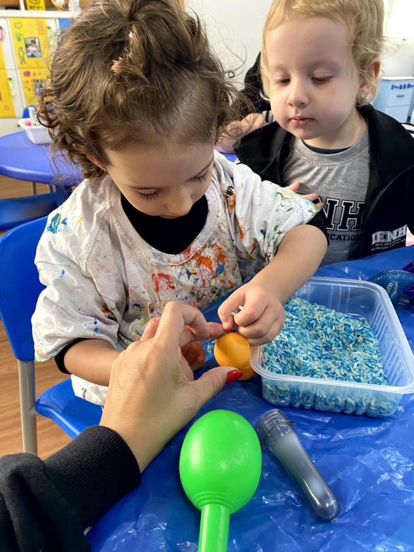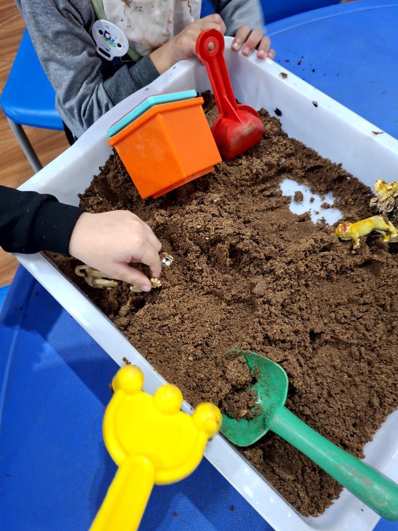 Já no Learning Center de Língua Inglesa, os estudantes foram desafiados a encontrar os personagens da história, a família de leões, em uma bandeja sensorial com areia, nomeando-os em inglês: baby lion, daddy lion e mommy lion.
