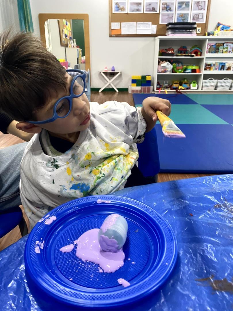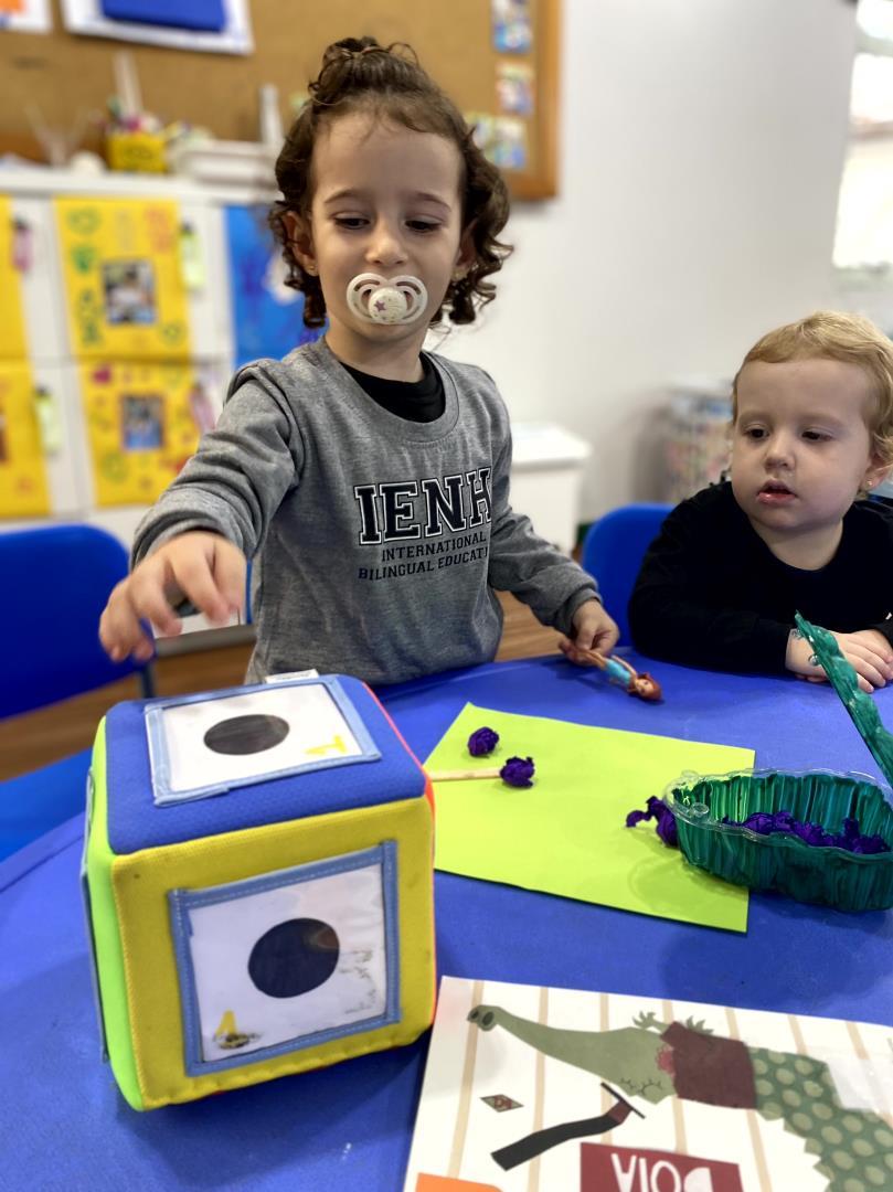 No Learning Center de Língua Materna, as crianças participaram de uma brincadeira matemática inspirada na história do jacaré com dor de dente. Com o auxílio de um dado, os pequenos sortearam números e alimentaram o jacaré feito de sucata com “jabuticabas” de papel crepom amassado, exercitando a contagem e a motricidade fina. Em seguida, cantaram a música “Pé de Jabuticabeira”, de Kitty Driemeyer, e confeccionaram chocalhos, unindo musicalidade e expressão artística.