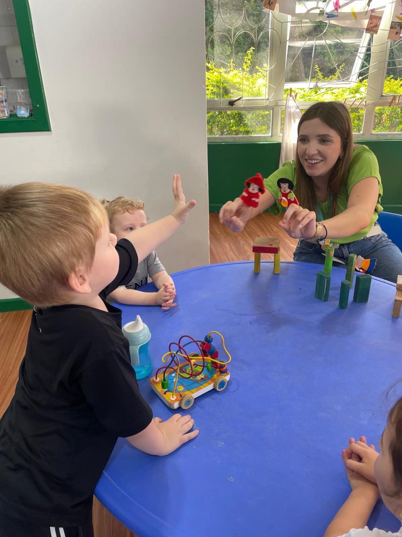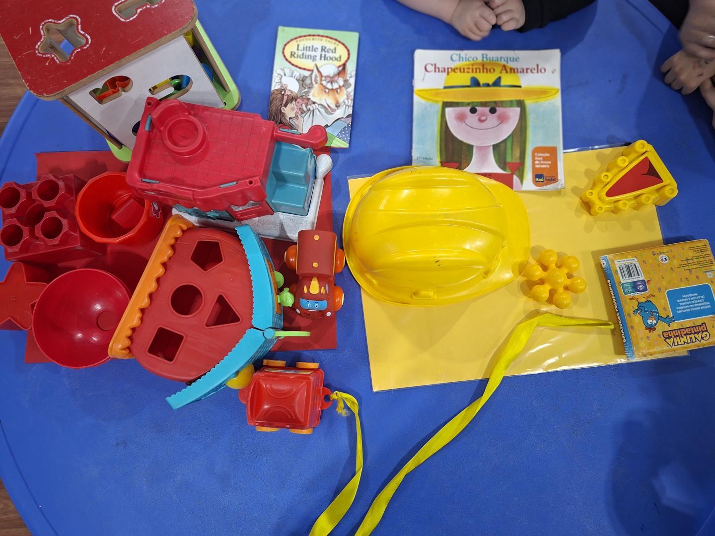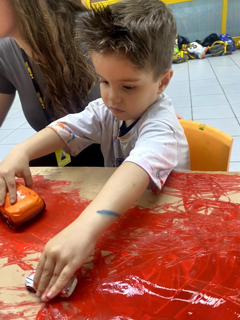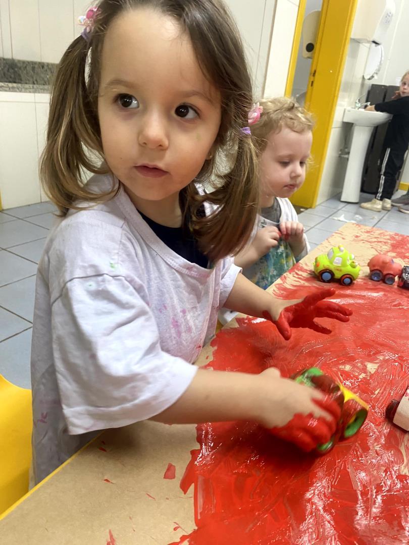 Durante as propostas, os pequenos exploraram o universo das rimas, brincaram com sons e palavras, e participaram de momentos especiais de “hora do conto” com fantoches, tornando as histórias ainda mais envolventes. Também realizaram atividades práticas, como selecionar objetos nas cores amarelo e vermelho e utilizar tintas e carrinhos para expressar suas percepções das histórias, transformando o aprendizado em uma experiência sensorial e divertida.