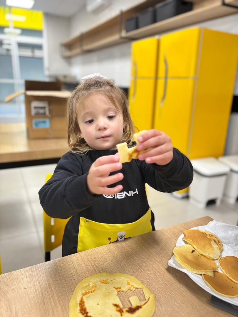 Os pequenos participaram do preparo de panquecas, observando as mudanças na textura da massa e acompanhando curiosos o momento do cozimento. Depois, chegou a hora mais aguardada: com cortadores em forma de barcos, ônibus e aviões, transformaram as panquecas em criativos veículos comestíveis. Cada criança escolheu seu meio de transporte favorito e saboreou o resultado.