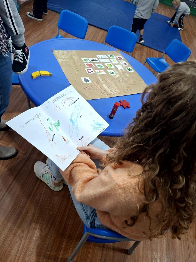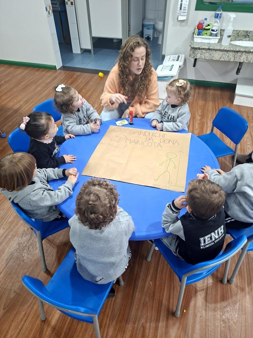 Associando o tema do crescimento à importância da alimentação saudável, a turma recebeu a visita da nutricionista Juliana Leist, ex-aluna da IENH, no dia 18 de junho. Durante o encontro, Juliana conversou sobre as preferências alimentares dos estudantes, contou a história “O Sanduíche da Maricota” e, de forma colaborativa, criou um cartaz com verduras e legumes que poderiam ser incluídos nas refeições de cada um.