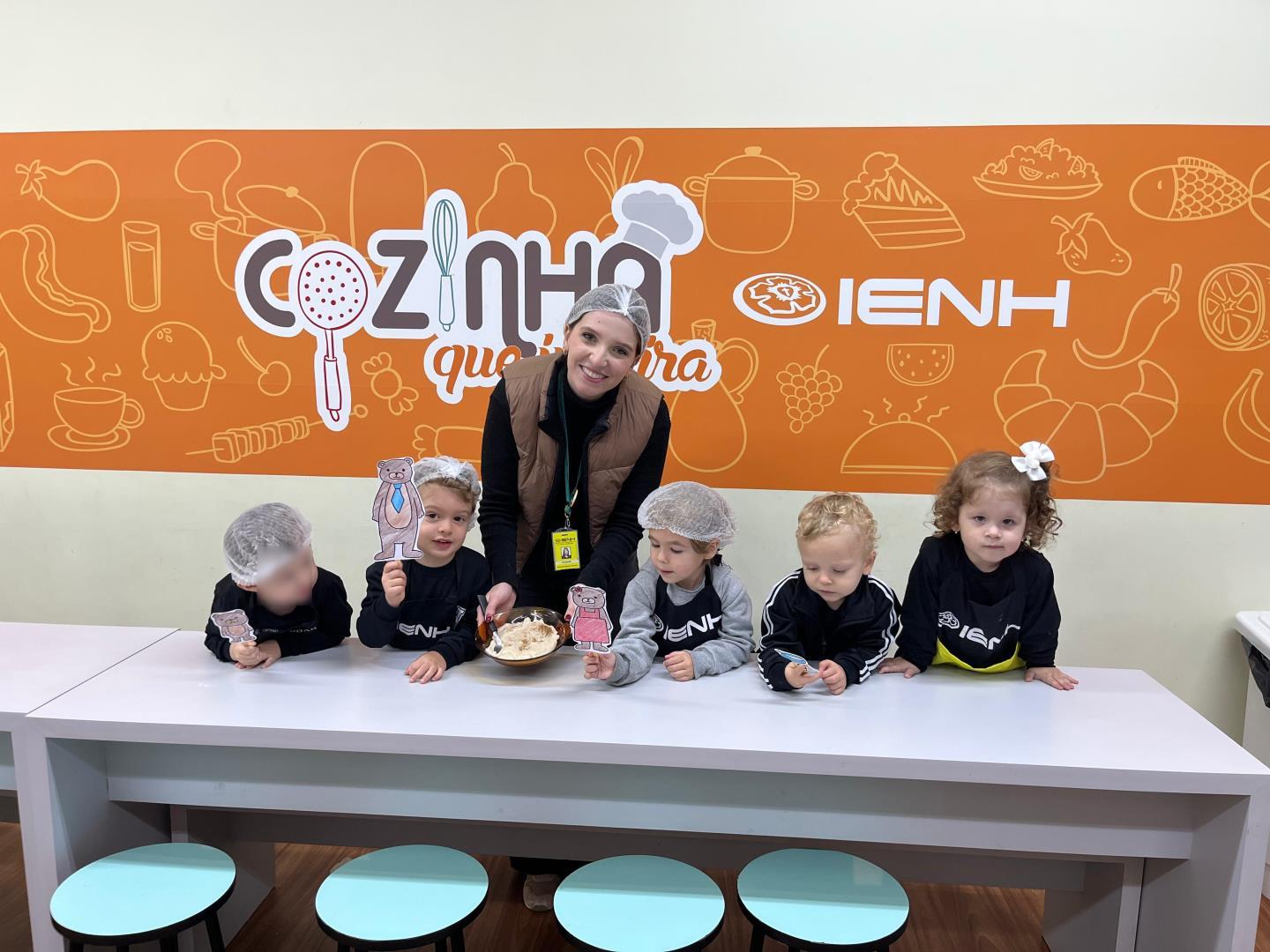 Em Língua Inglesa, participaram de uma brincadeira de classificação de brinquedos conforme os tamanhos big, medium and small, cantaram uma música sobre ursos e prepararam porridge (mingau), prato presente na história, em uma divertida Cooking Class.