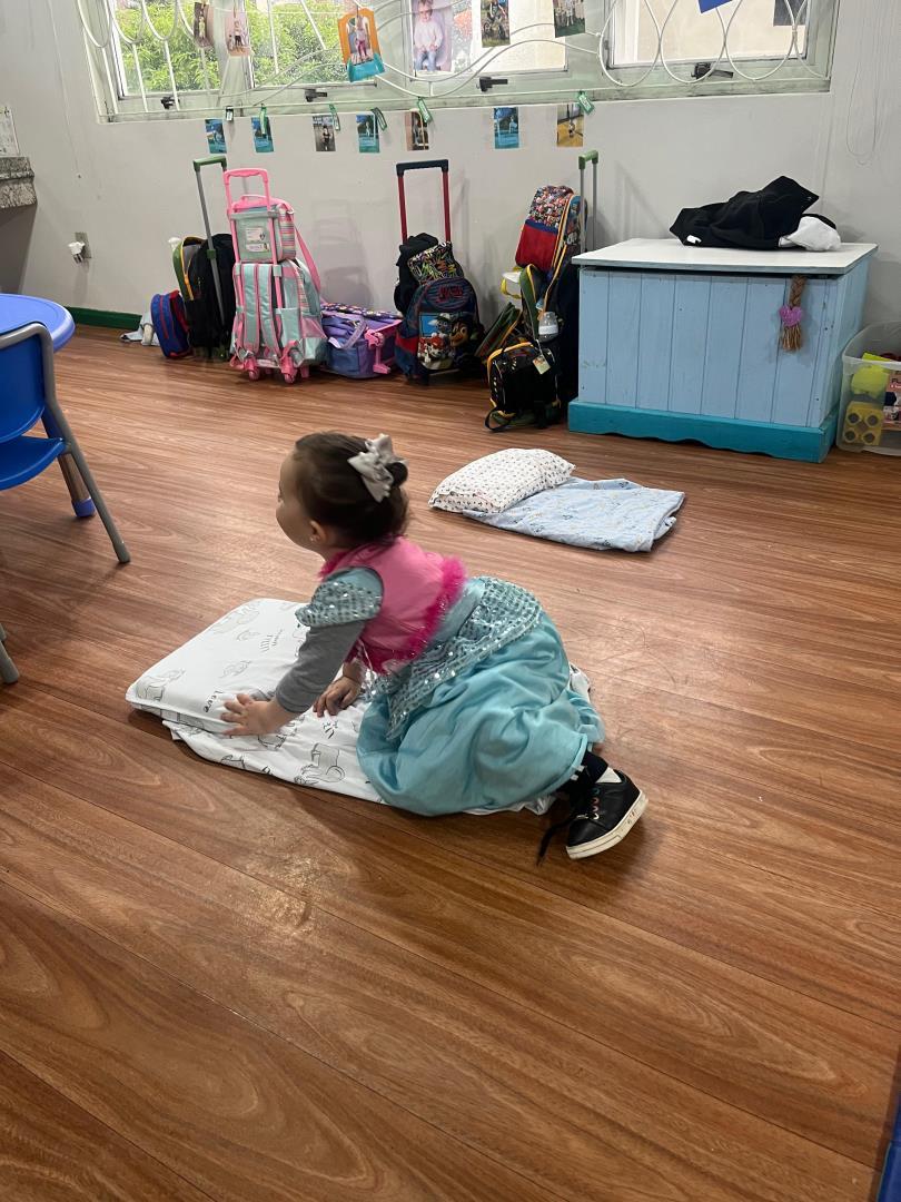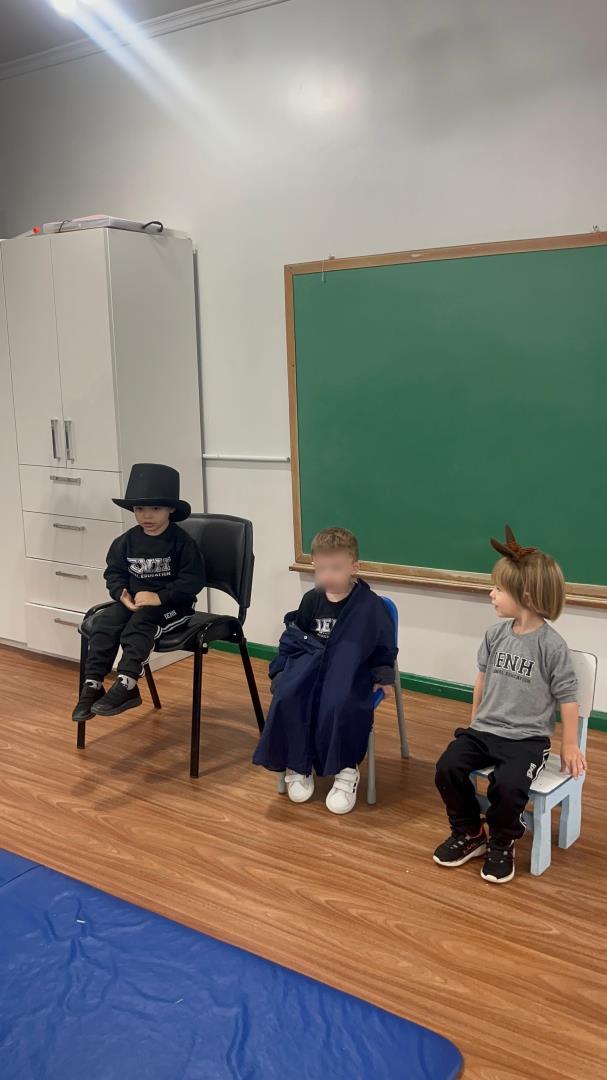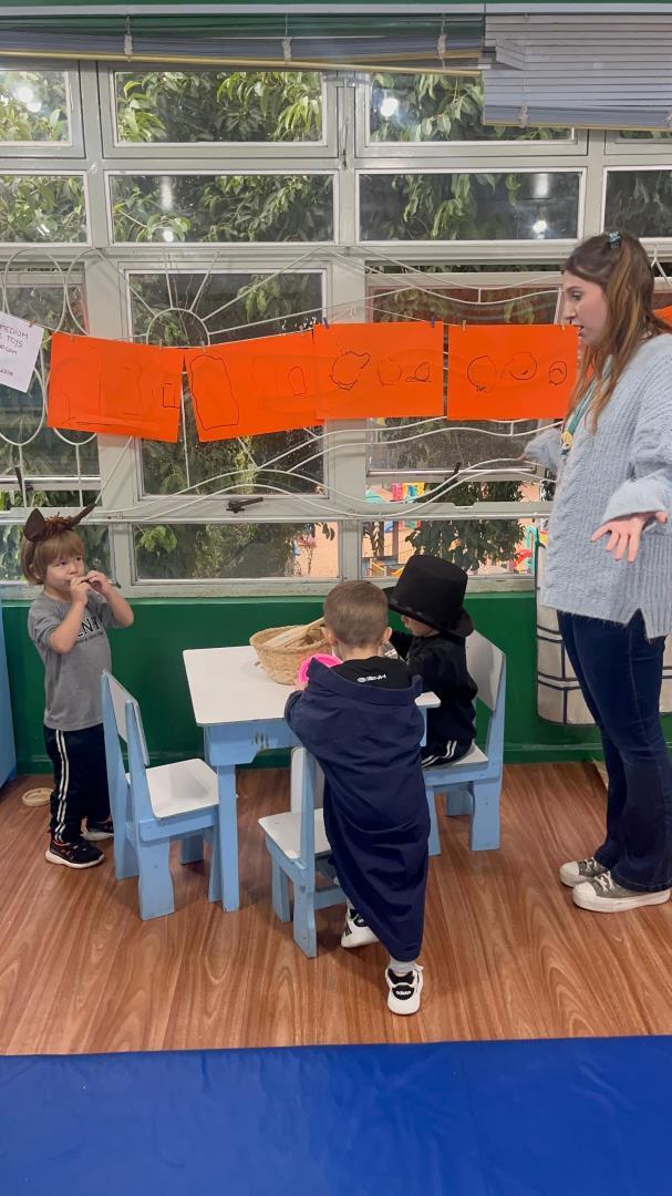Um momento especial foi a realização de uma dramaturgia bilíngue, com a presença simultânea da teacher Amanda Escobar e da professora Amanda Siebel. As crianças encenaram a história com figurinos, adereços e atenção à sequência dos acontecimentos, exercitando a memória, a oralidade e a expressão corporal.