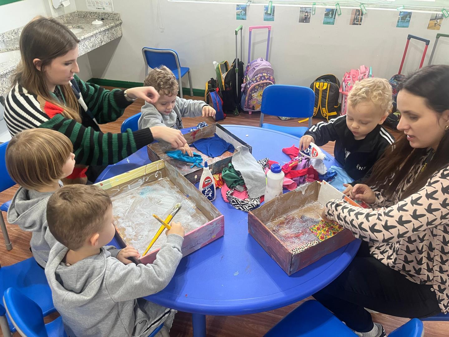 Em Língua Materna, construíram camas com materiais recicláveis, fizeram colagens da personagem principal e criaram, coletivamente, um cartaz comparando o tamanho do urso ao das crianças.