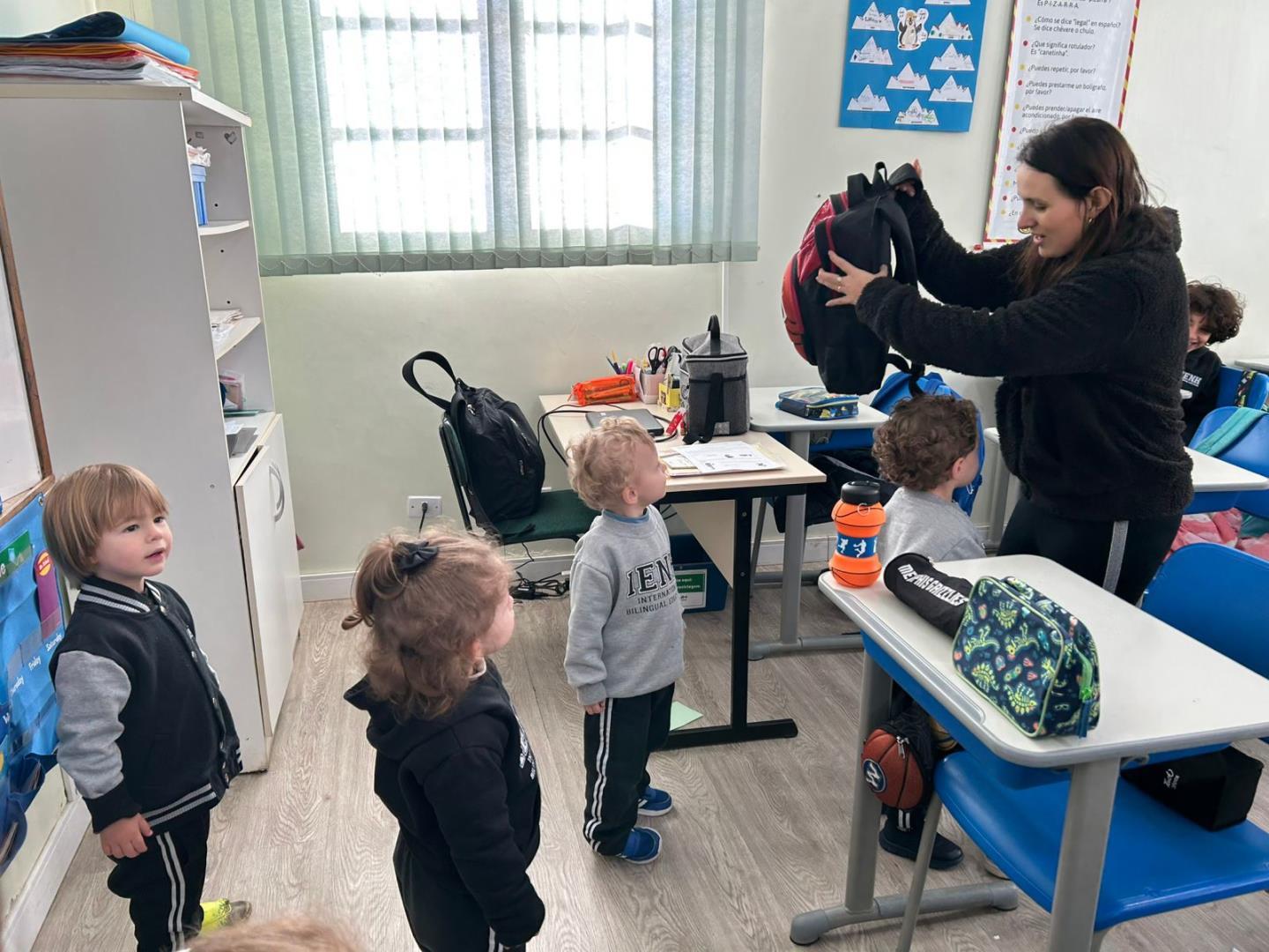 Em outro momento, os alunos refletiram sobre as diferenças entre sua sala do Kindergarten 2 e as dos “grandes” do Ensino Fundamental do Currículo Internacional Bilíngue, levantando perguntas sobre trocadores, mamadeiras, caminhas, mochilas de rodinhas e brinquedos.